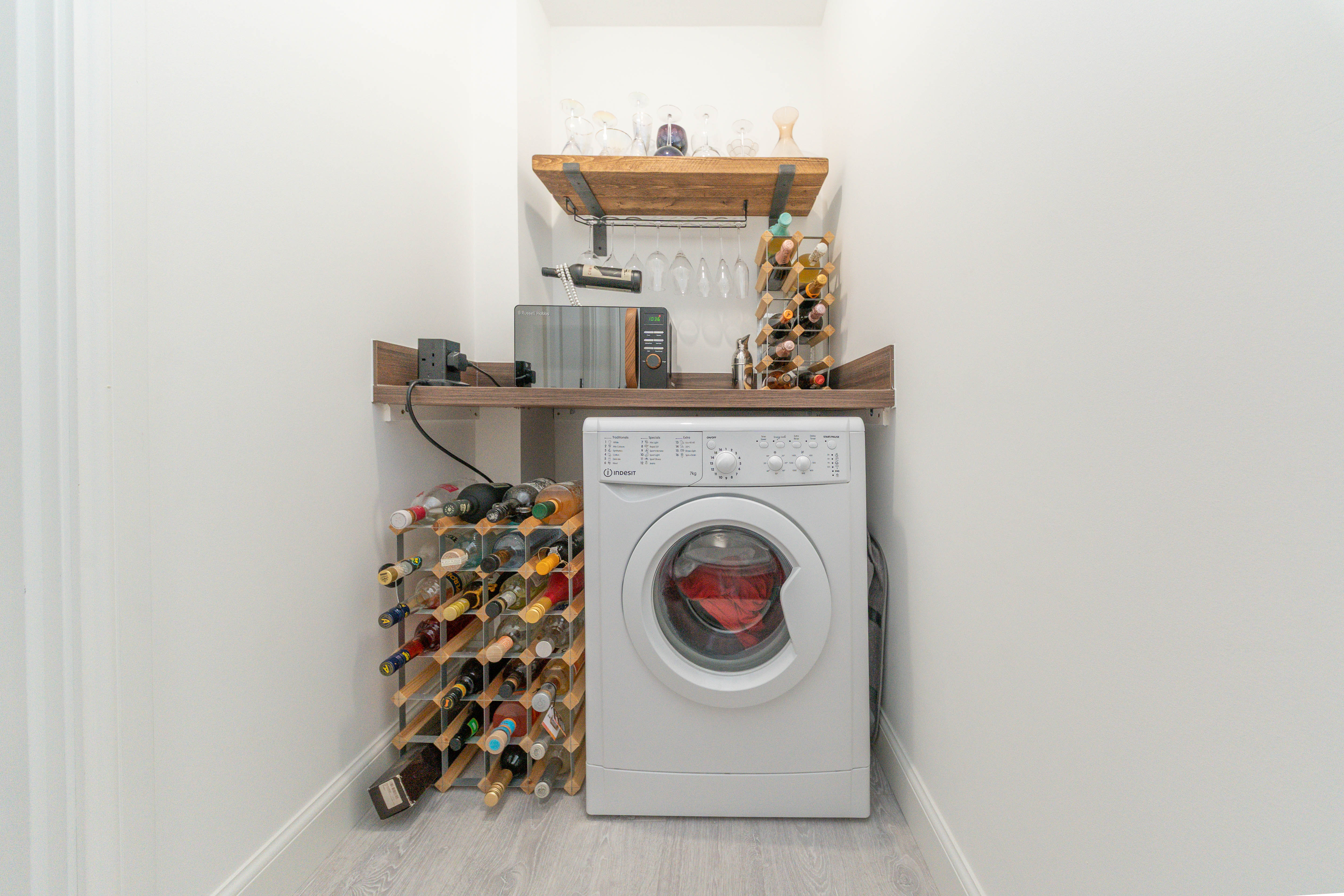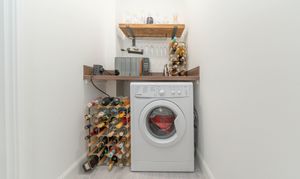 The utility room offers a highly practical space designed for both convenience and organisation. It provides a dedicated area for an under counter washing machine, helping keep everyday appliances neatly out of sight. Finished with crisp white walls, a wood effect laminate worksurface, and continued laminate flooring, the room maintains a clean and cohesive look. A ceiling light and convenient power points complete this functional space in the home.
