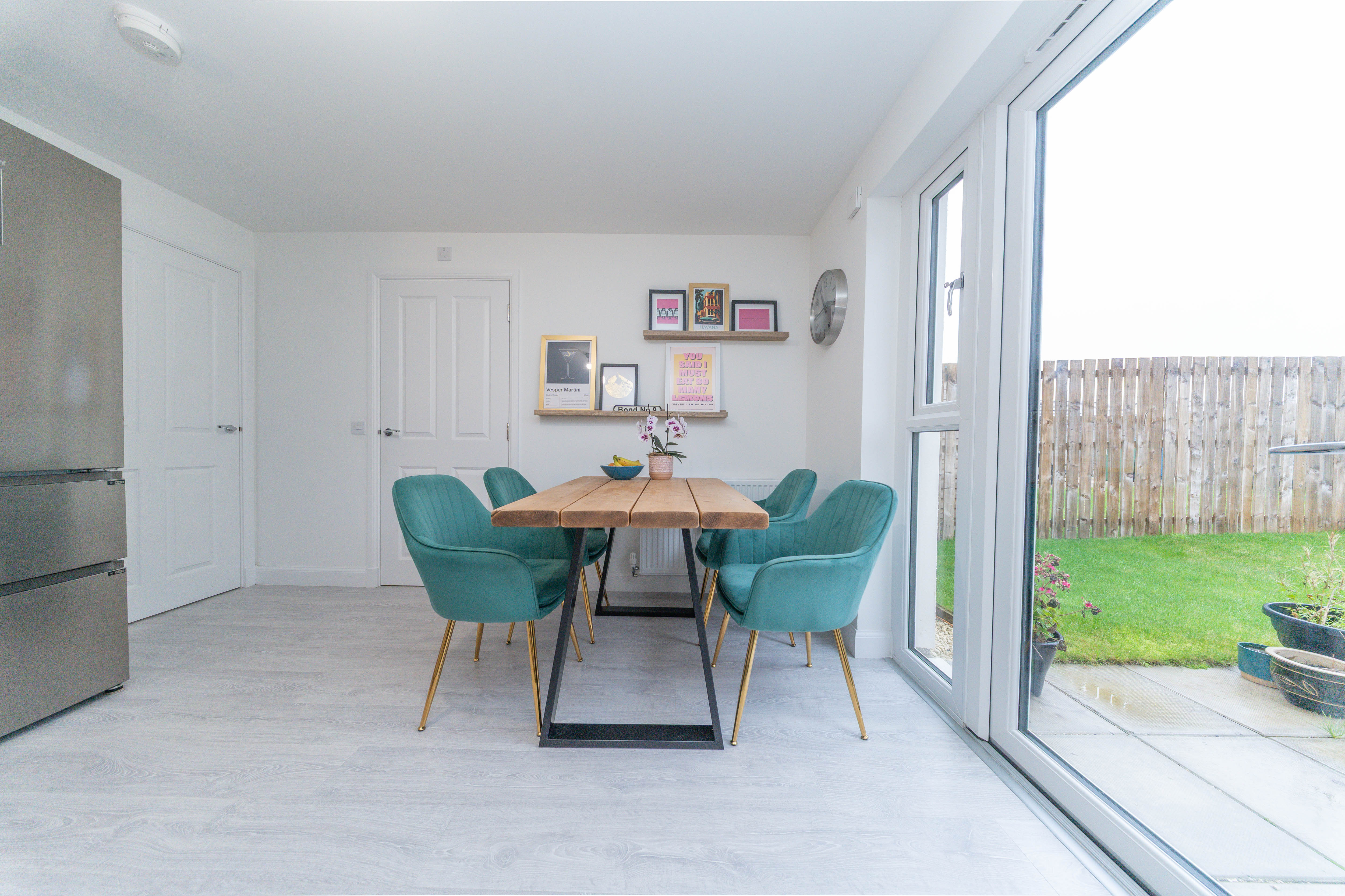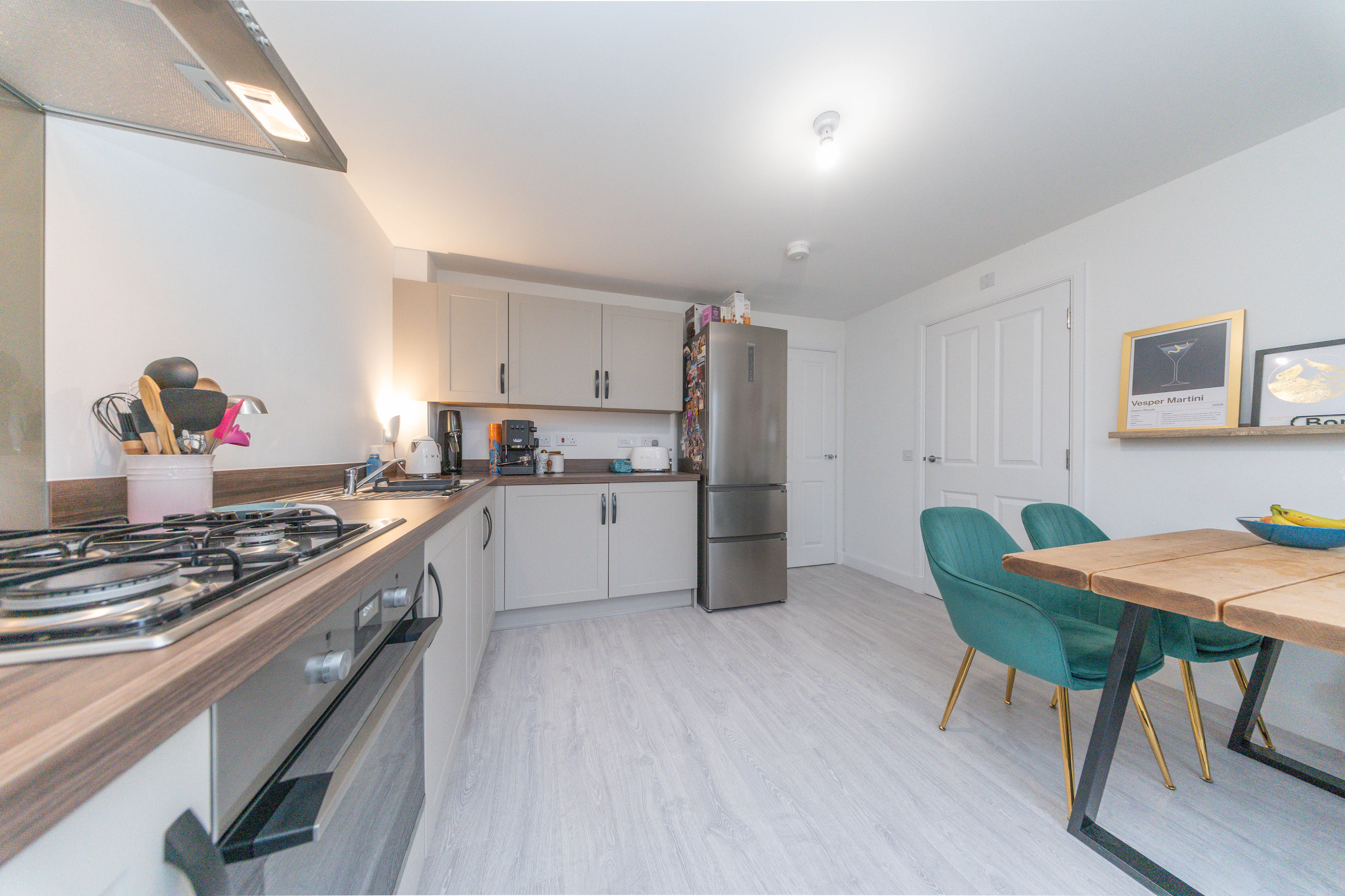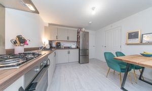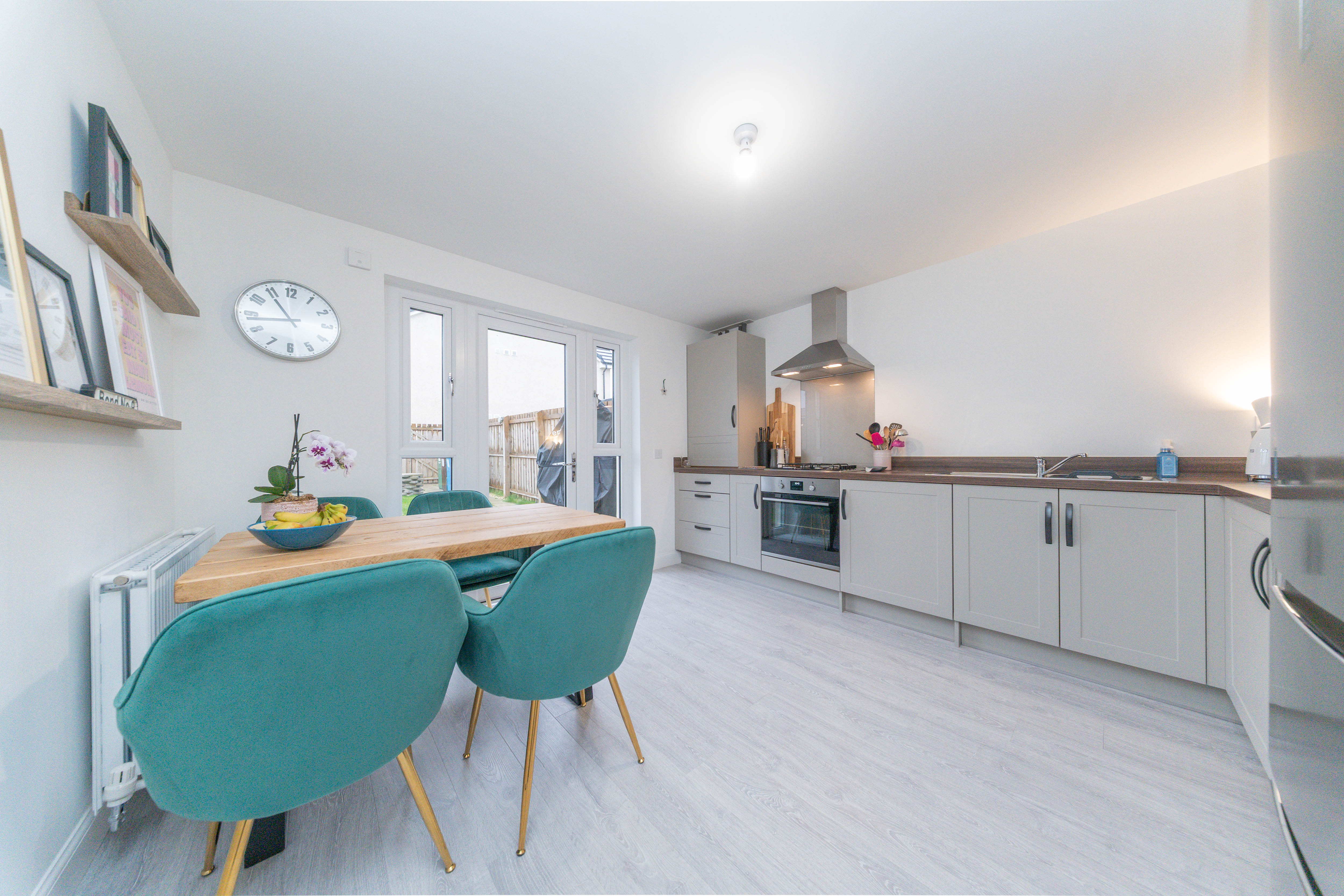 This thoughtfully designed kitchen blends style and practicality, offering an array of wall and base units with sleek grey frontages, complemented by warm wood effect worktops. White painted walls and matching wood effect laminate flooring create a cohesive, contemporary feel throughout. The space comes fully equipped with an under counter oven, four ring gas hob with grey glass splashback, and a stainless steel extractor hood. There is also space for a tall fridge freezer. The stainless steel sink with drainer and mixer tap sits conveniently within the layout. Natural light streams in through the rear glazed door and windows, with additional illumination provided by a ceiling light. There is ample room for a dedicated dining area, perfect for family meals or entertaining guests. Completing the space are power points, a radiator, and a heat detector, ensuring comfort and convenience.