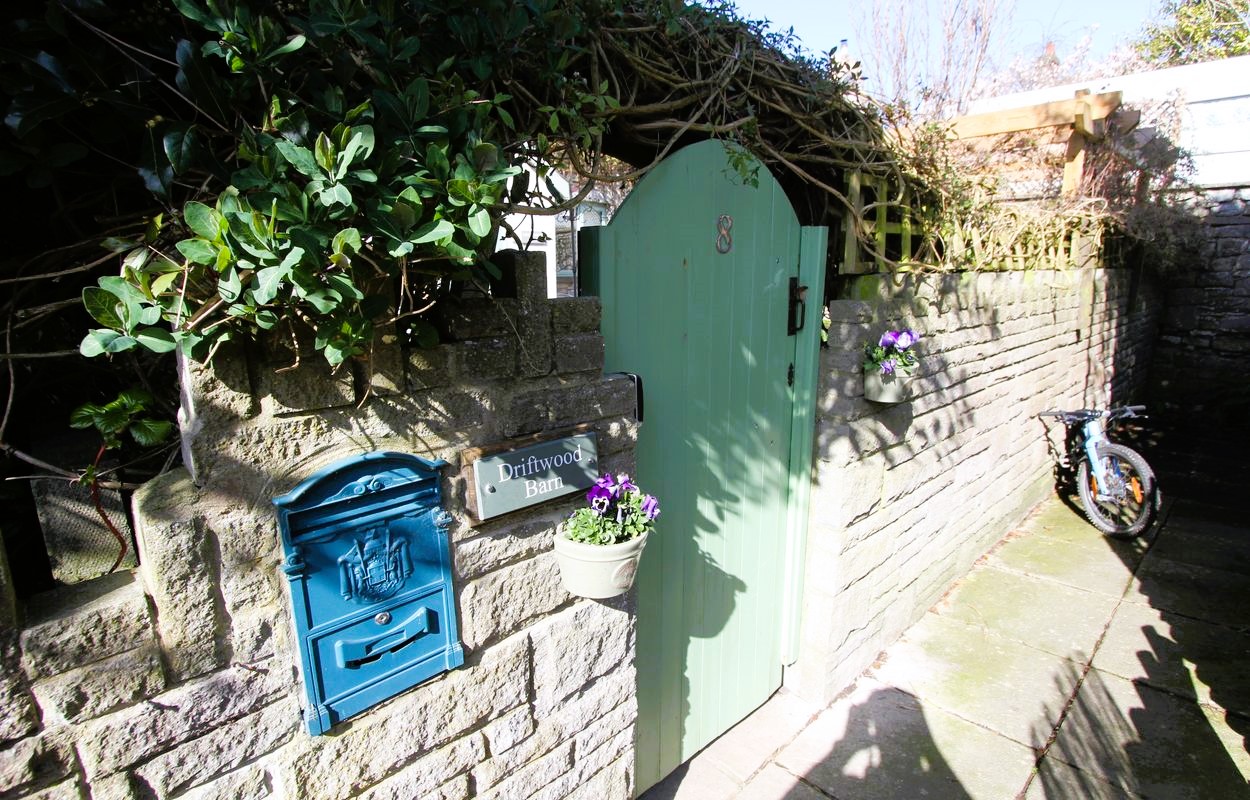 Pretty, front cottage garden - enclosed by stone walls and trellis providing privacy. Mainly laid to lawn with decked seating area and wooden pergola. Espalier apple trees and raspberries enclosed by low level box hedging. Large cherry tree. Double log store plus separate store for garden equipment. Lighting and outside water tap. Gate to front.