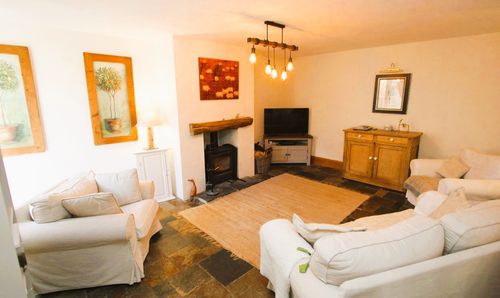 Stairs to first floor. Radiator. African slate flooring. Eco Log burner with wood effect mantle above and slate hearth. UPVC French doors to front.