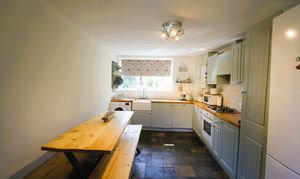 Radiator. UPVC windows to front and rear. Wall mounted combination boiler (Worcester) 2023, providing the central heating and hot water. Stairs to first floor. Ceramic Belfast sink with mixer tap. Fully fitted kitchen comprising eye level units base units with drawers and solid wood work surfaces over. Gas hob with oven. Space for white goods.