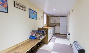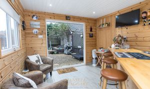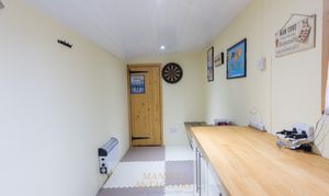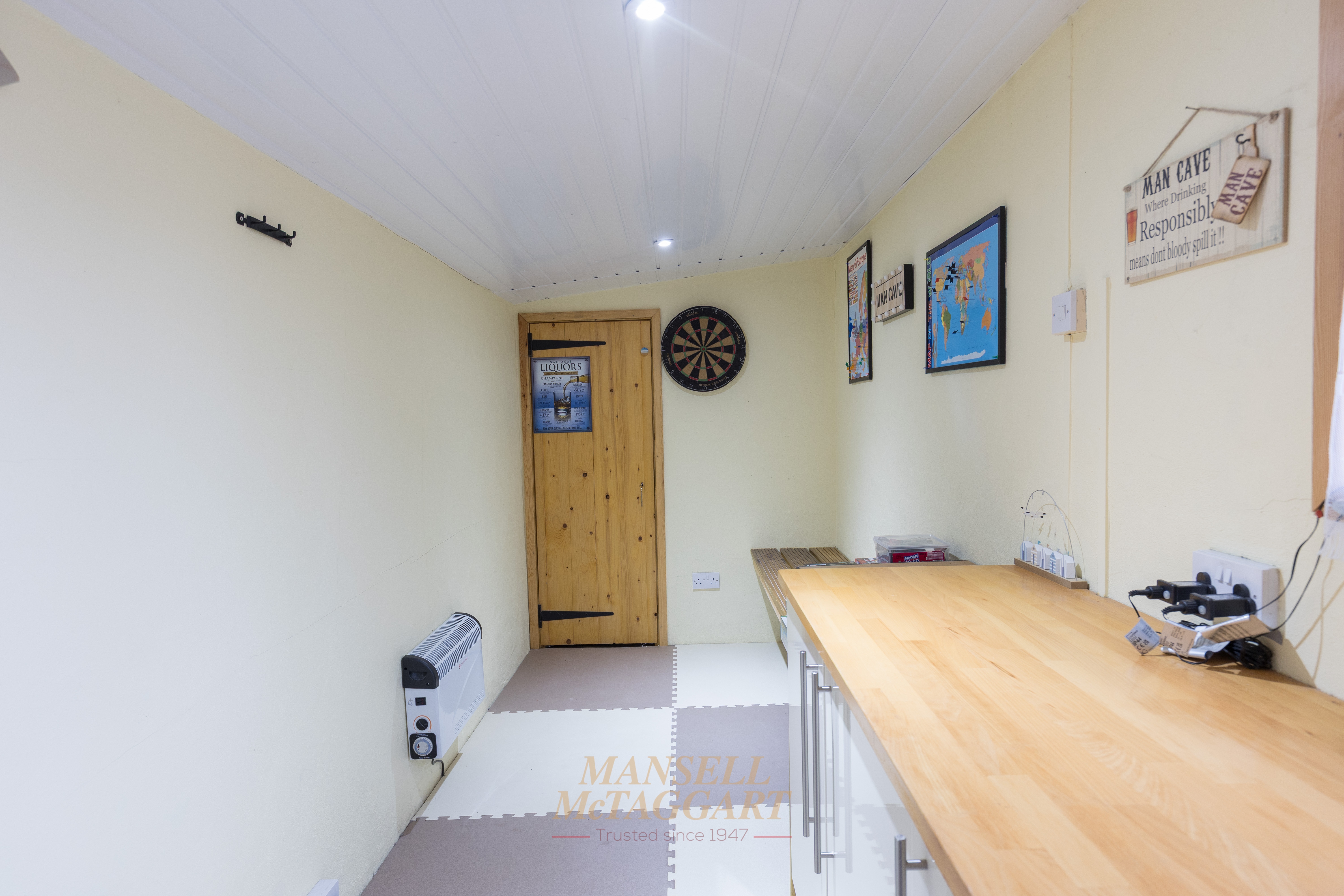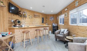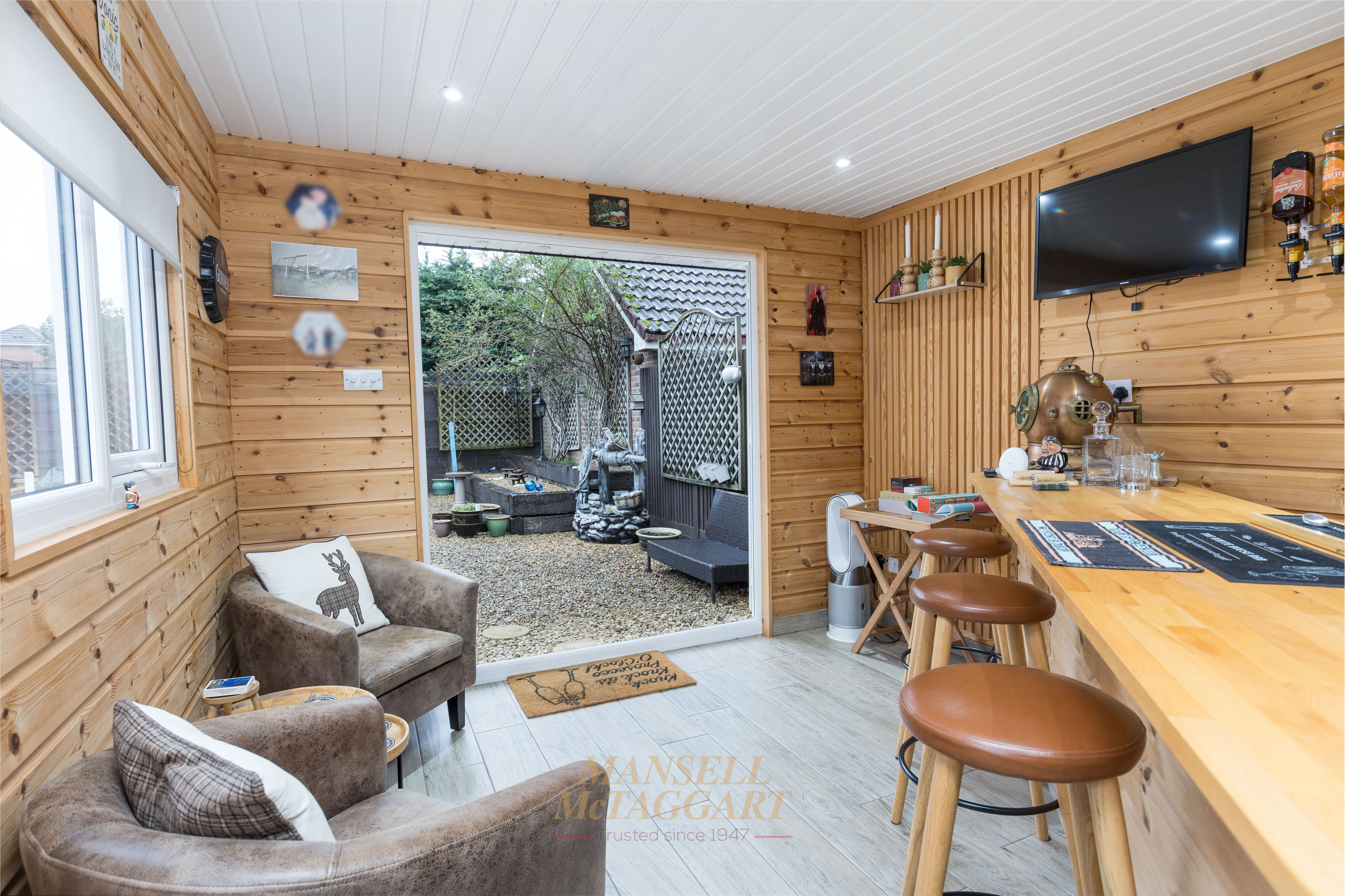 Outside to rear, is the low maintenance rear garden, it is mainly laid to gravel with patio areas abutting. There is also a large bar area, benefiting from power and lighting however is a versatile space and could be used as a home office or gym. A further outbuilding runs alongside the home, with a utility and storage space available, also with power, lighting and plumbing. Furthermore, there is a 3 metre electric awning, tasteful outdoor lighting and outdoor heating.
