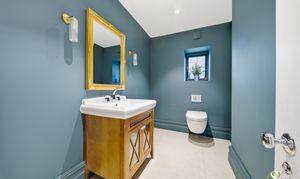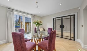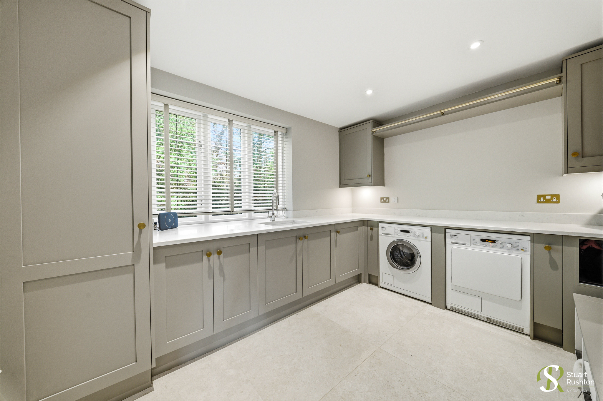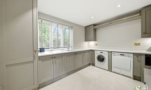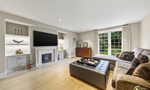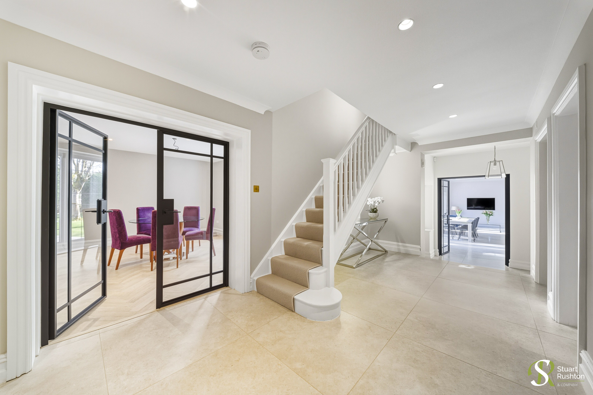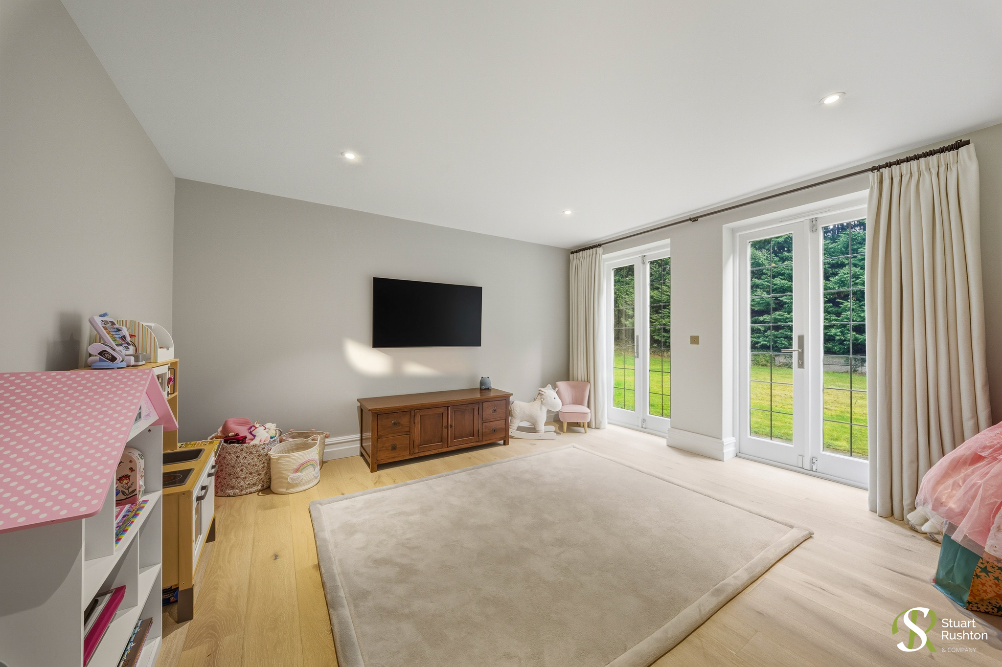 In addition, there are three further reception rooms comprising a formal dining room, a playroom/study, and an elegant living room featuring bespoke built-in shelving and cabinetry alongside a log-burning stove. Both the living room and dining room benefit from French doors opening onto the patio areas, creating a wonderful connection with the gardens. The ground floor accommodation is completed by a large utility room, cloakroom, and separate W.C.