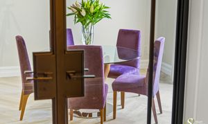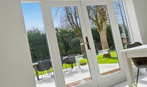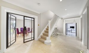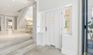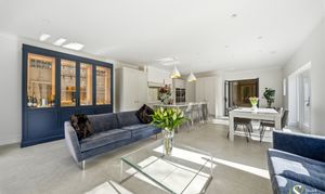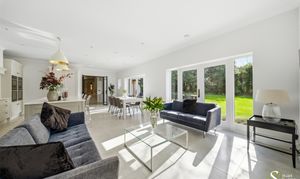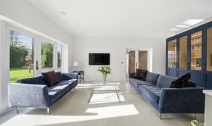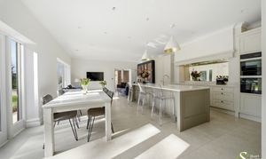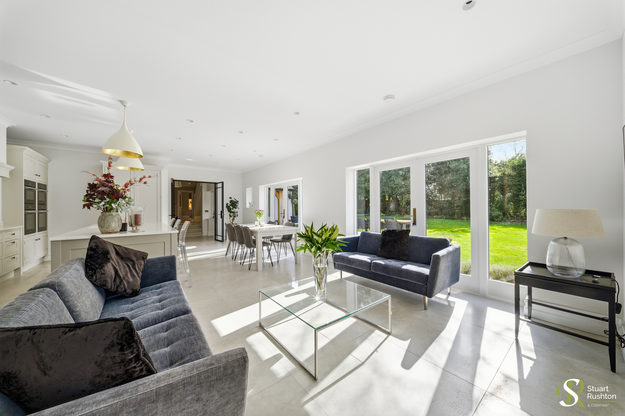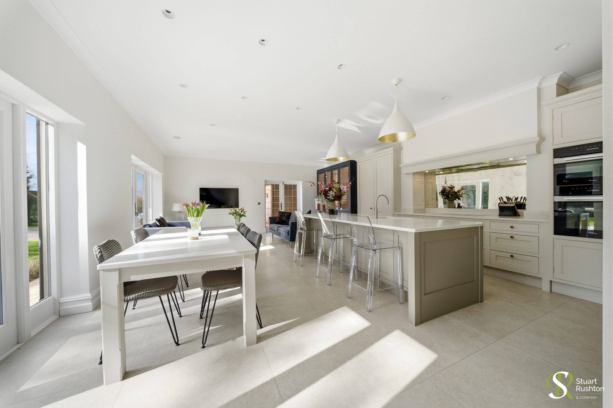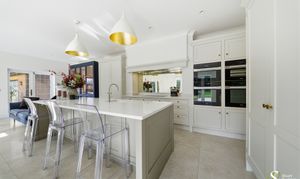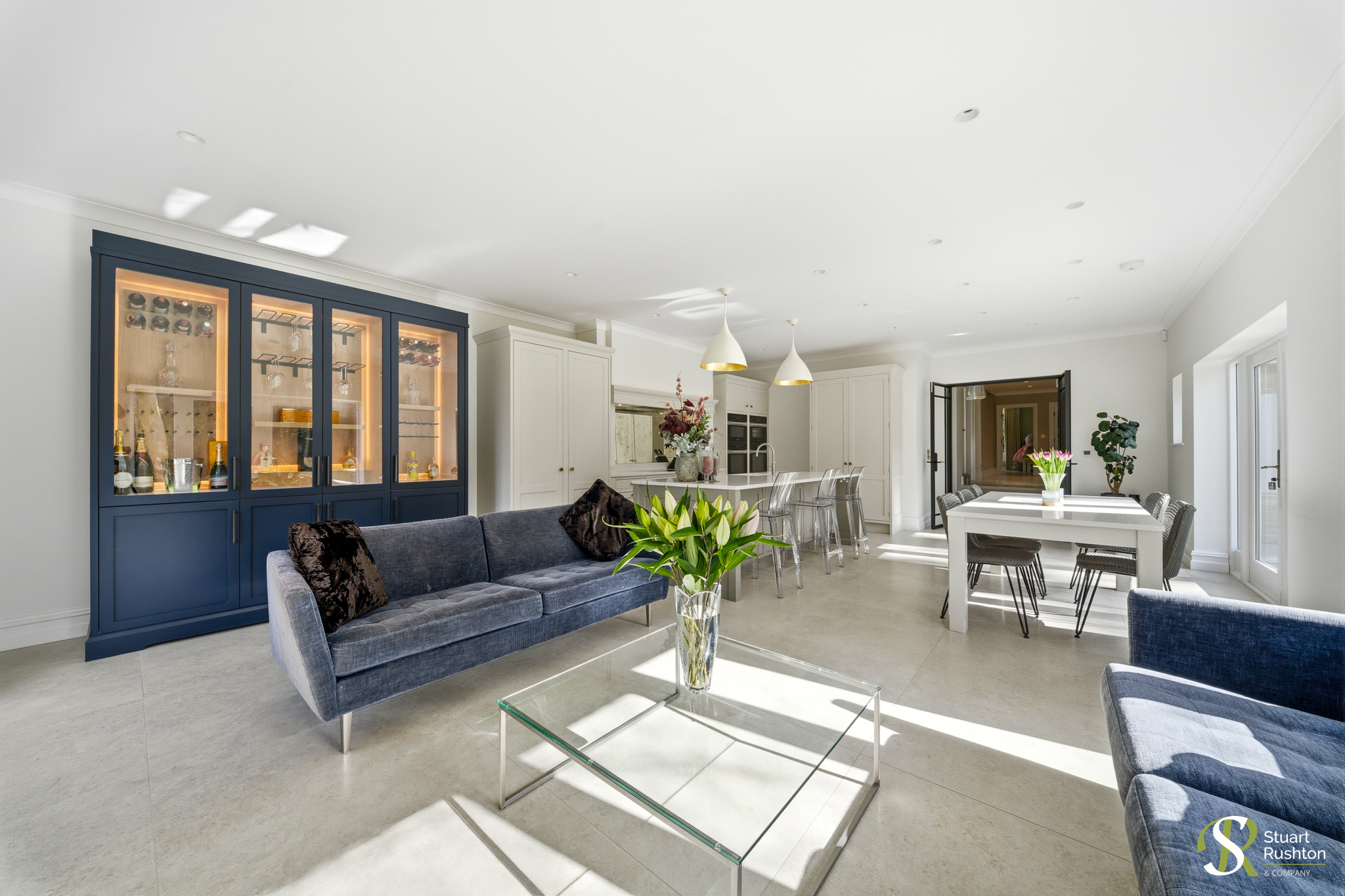 The property opens into a welcoming entrance hallway with tiled flooring, providing access to the principal reception rooms. The heart of the home is the stunning open-plan kitchen, living and dining space, accessed through double Crittall-style doors. The beautifully fitted bespoke, hand-painted kitchen features a range of integrated Miele appliances and a large central island with breakfast bar seating. This space flows effortlessly into the dining area and relaxed sitting area, with double doors opening out onto the patio terrace.