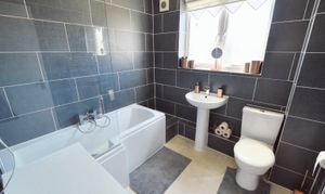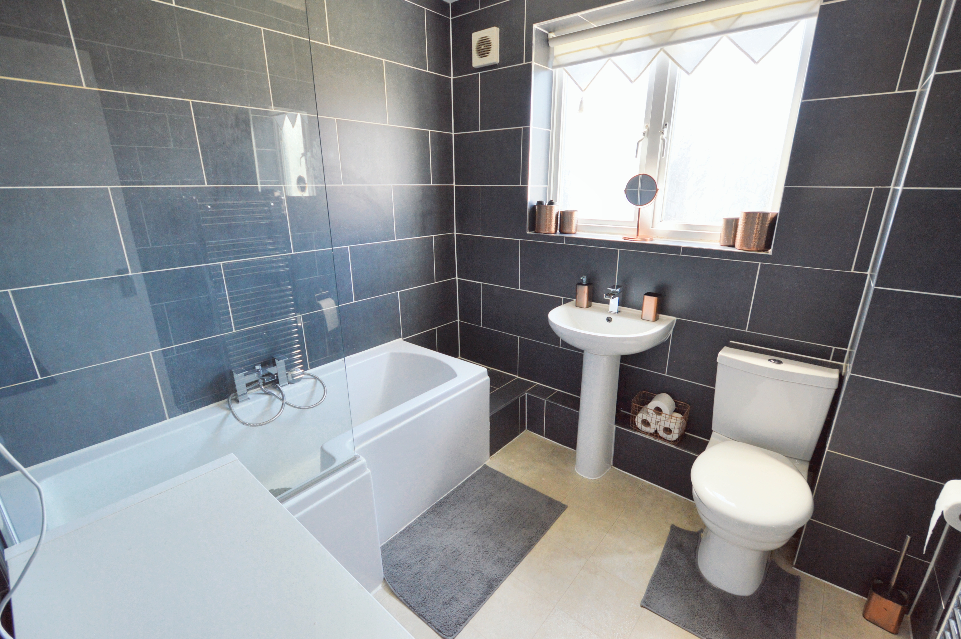 Modern white suite comprising panelled shower bath with glazed shower screen and shower unit over, pedestal wash hand basin, low level wc, fully tiled walls, heated towel rail, obscure double glazed window to rear.