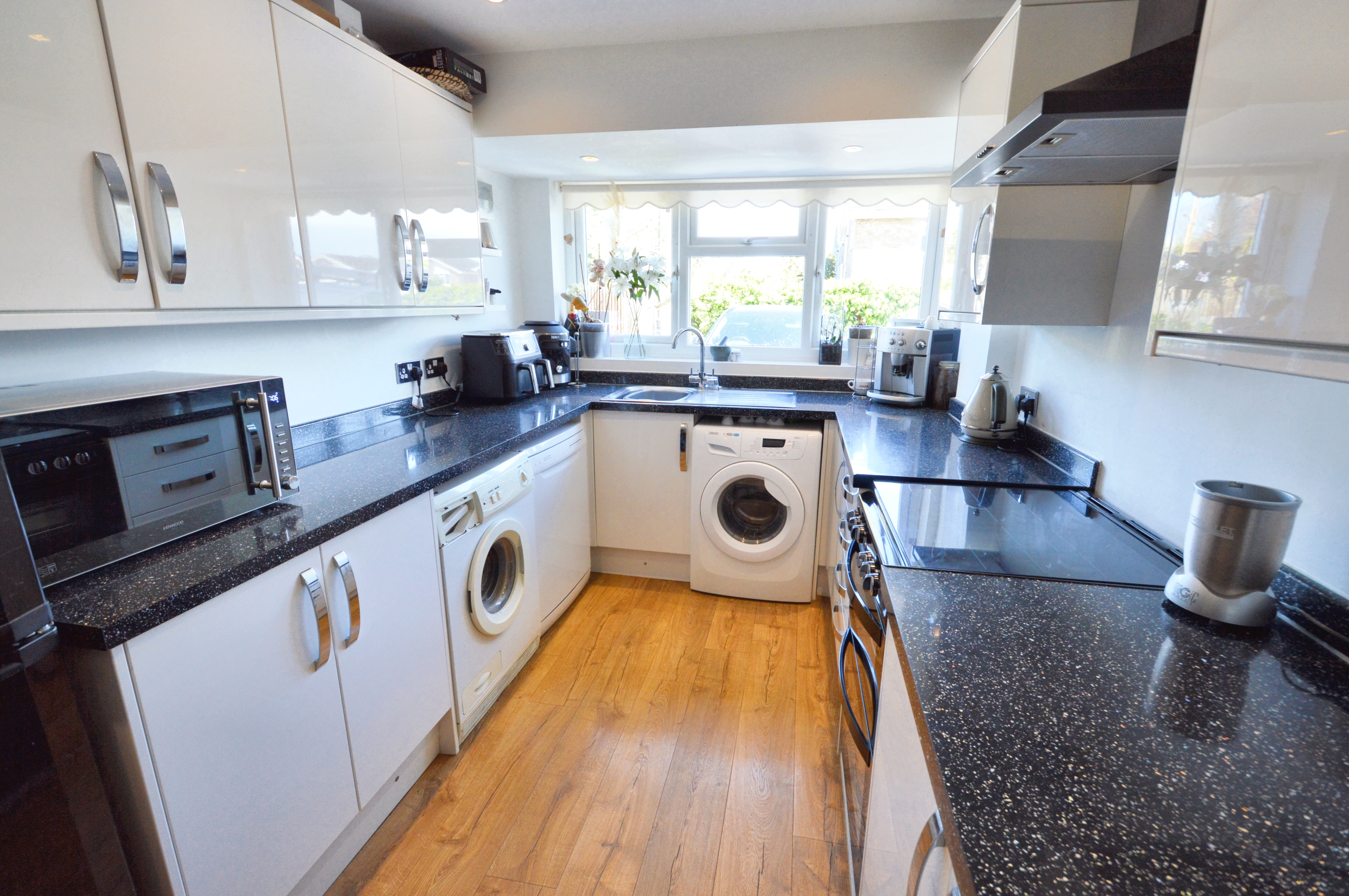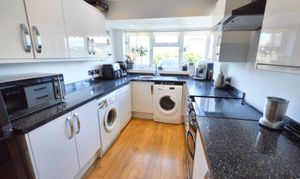 Range of modern fitted base units with toning working surfaces over, inset single drainer stainless steel sink unit, space and plumbing for washing machine and dishwasher, gas cooker with extractor hood over, matching range of wall mounted units, radiator, laminate wood flooring, double glazed window to front.