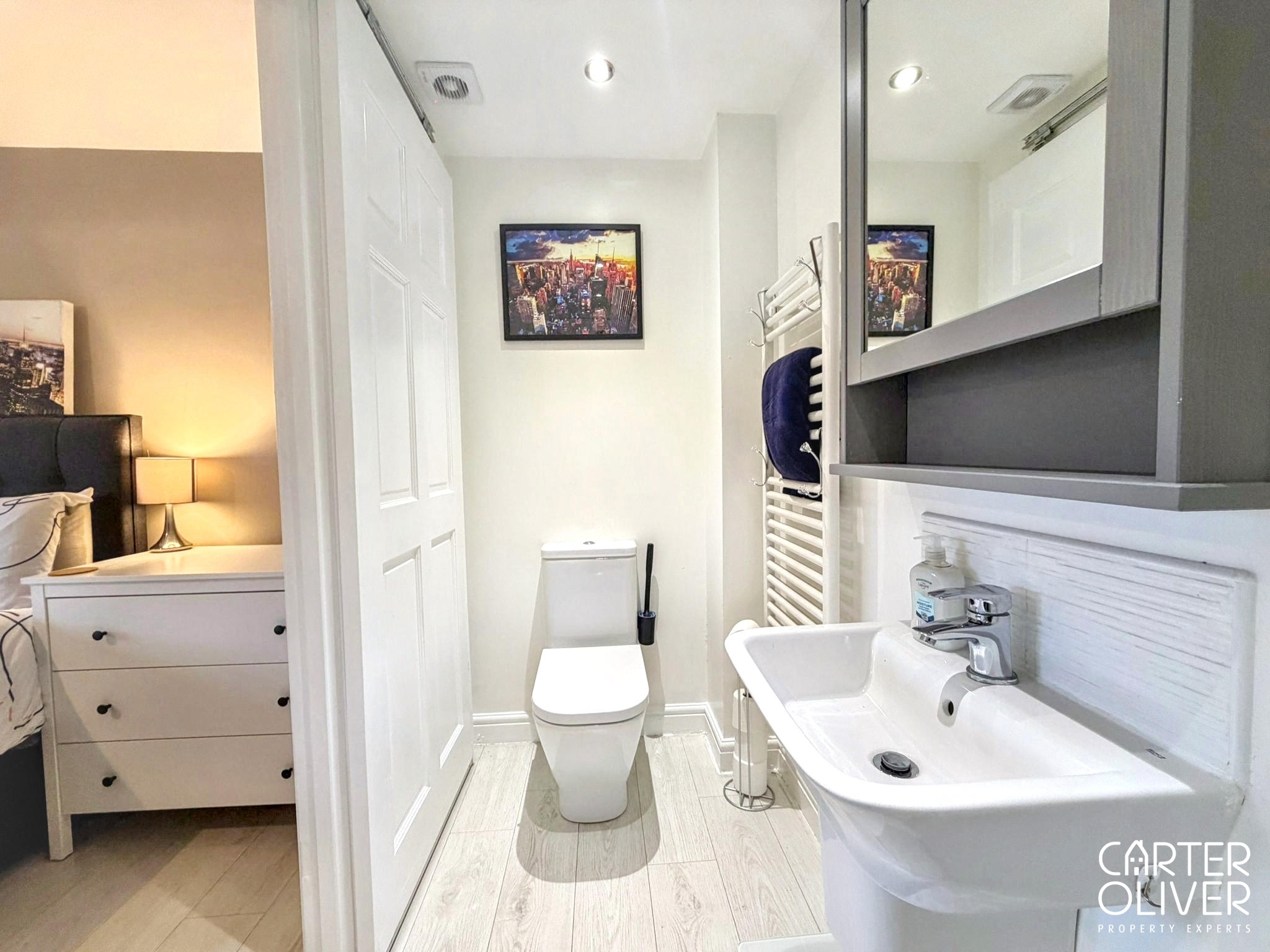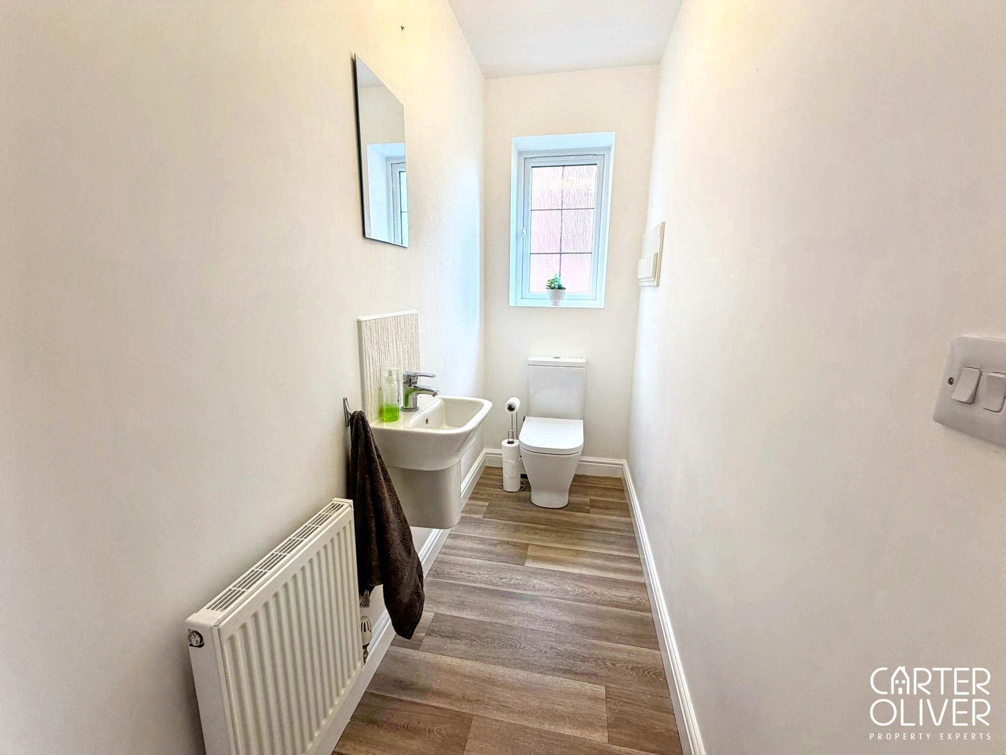 A convenient ground floor WC, finished with the same flooring as the hallway for a seamless flow. The room is fitted with a low-level WC and hand wash basin, providing a practical and neatly presented restroom for guests.