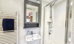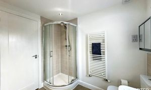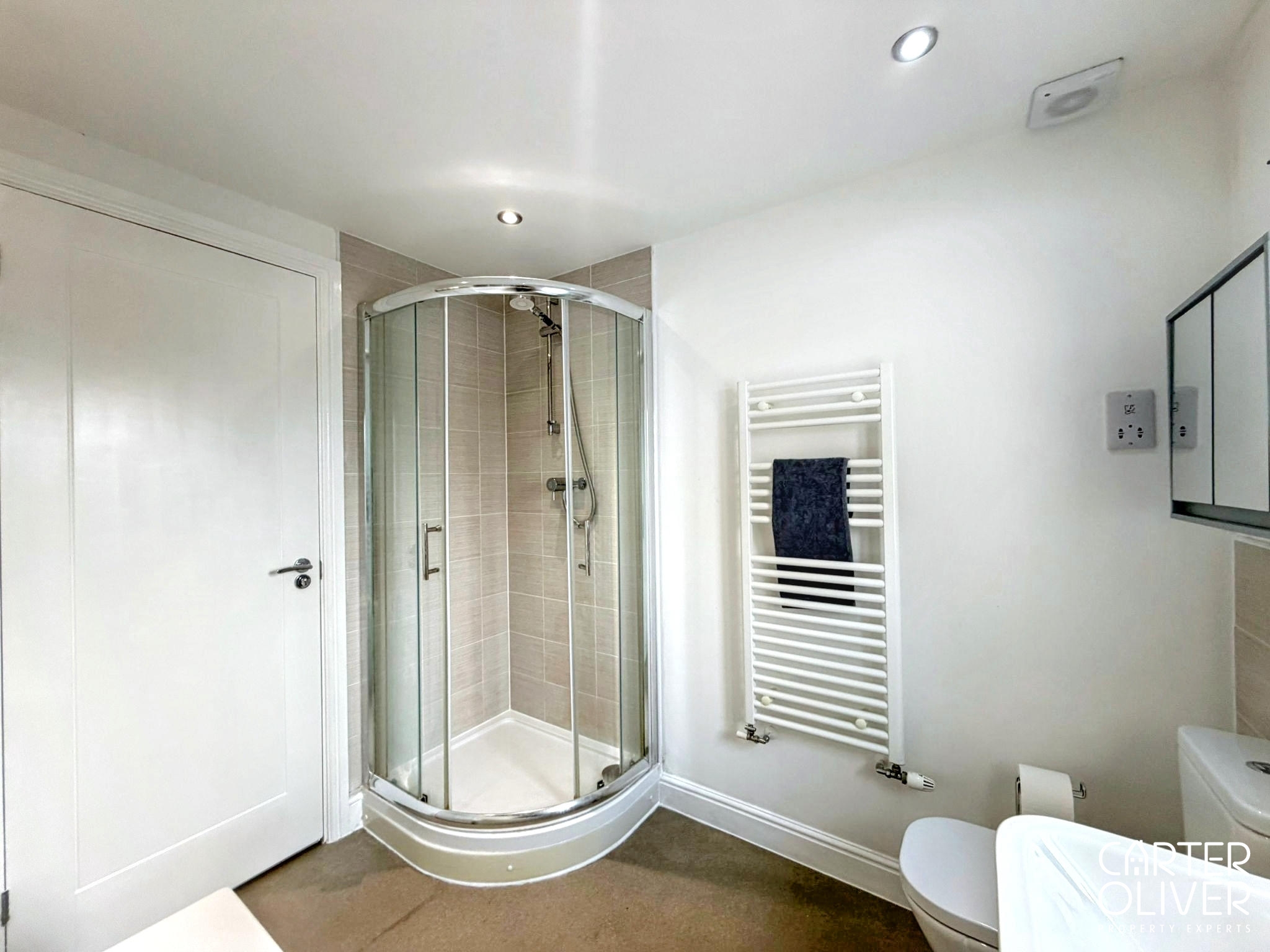 The ensuite to Bedroom 1 is fitted with a modern walk-in shower, finished with floor-to-ceiling textured white tiling. The room also includes a wash hand basin, WC and a heated towel rail, with the added benefit of an extractor fan for ventilation.