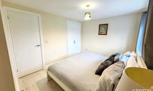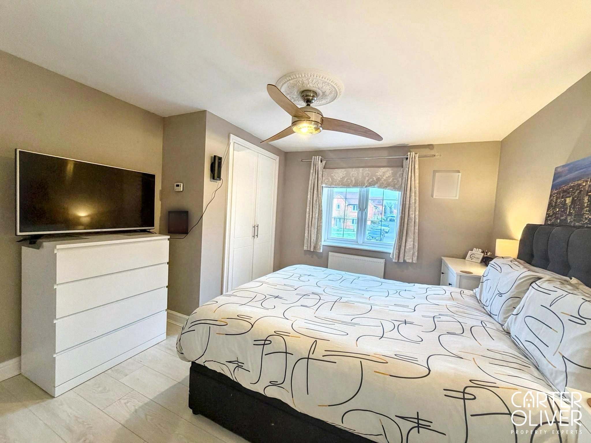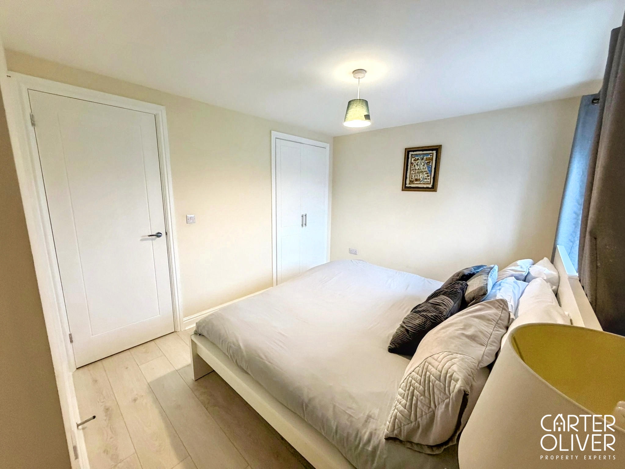 Bedroom 2 is a generously proportioned double room, comfortably accommodating a king-size bed. The room benefits from a double built-in wardrobe along with a separate single built-in storage cupboard. Neutrally decorated and finished with the same laminate flooring throughout, it offers a bright and practical bedroom space.