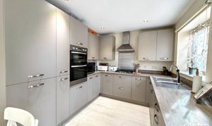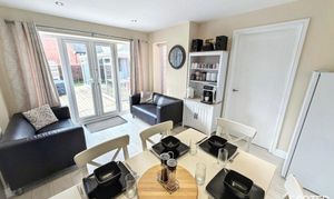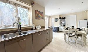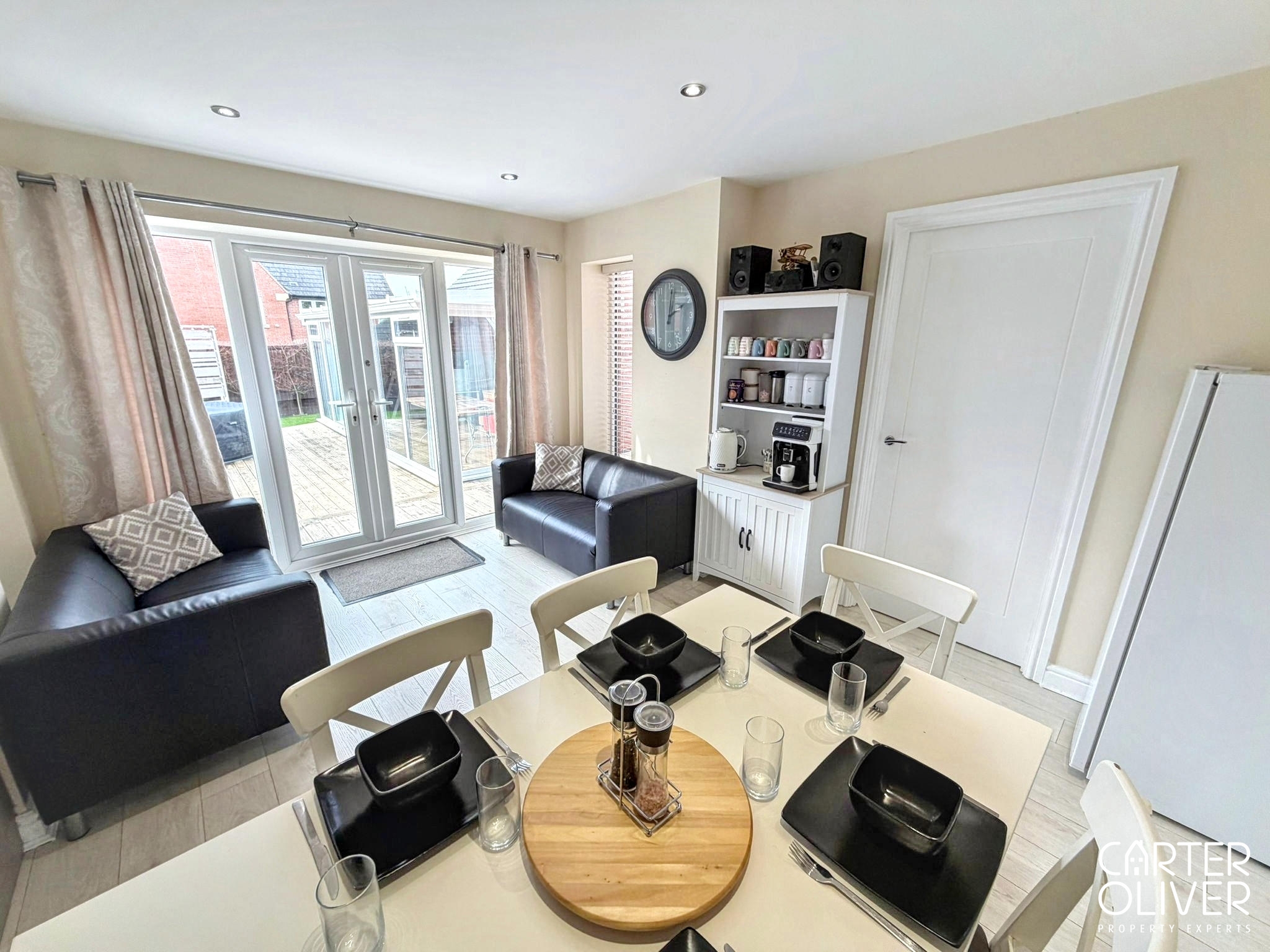 A bright and stylish open-plan kitchen diner, thoughtfully designed for modern living. The contemporary fitted kitchen offers ample storage and workspace, flowing seamlessly into a spacious dining area and comfortable seating zone. Large French doors flood the room with natural light and open directly onto the garden, making this an ideal space for everyday living, entertaining, and family time.