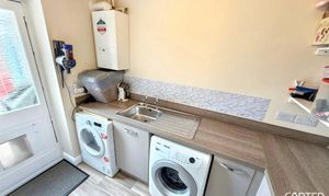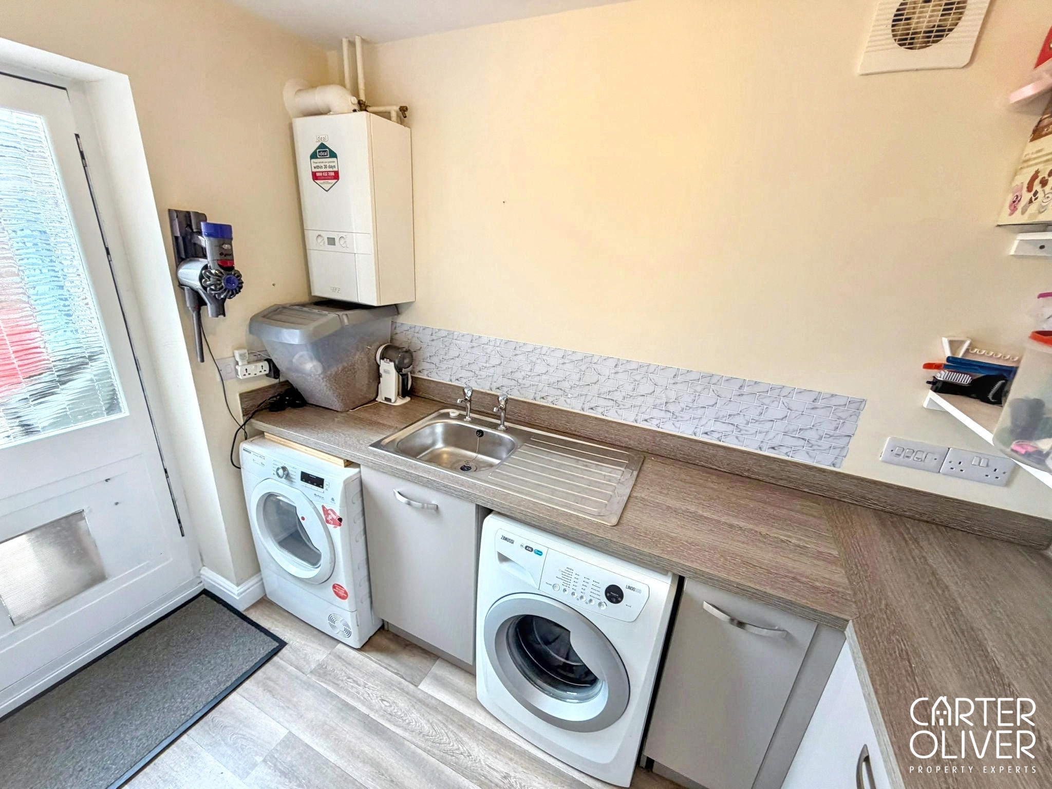 A practical utility room fitted with matching units carried through from the kitchen, providing a cohesive and stylish finish. The space offers plumbing and room for appliances, along with useful worktop storage. An external access door leads directly to the garden, making it ideal for muddy wellies, coats, and everyday household tasks.