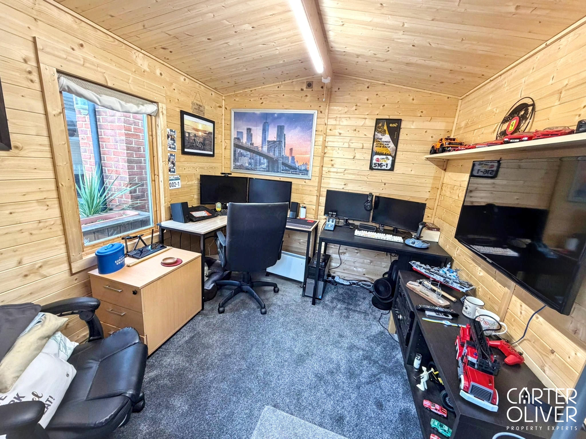 The property further benefits from an excellent outdoor office space, ideal for keeping work and home life completely separate if desired. This well-designed summer house is fully set up for use as a private office, featuring electricity, a carpeted floor, and ample space for workstations, making it perfect for remote working or a creative studio.