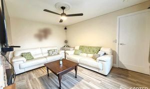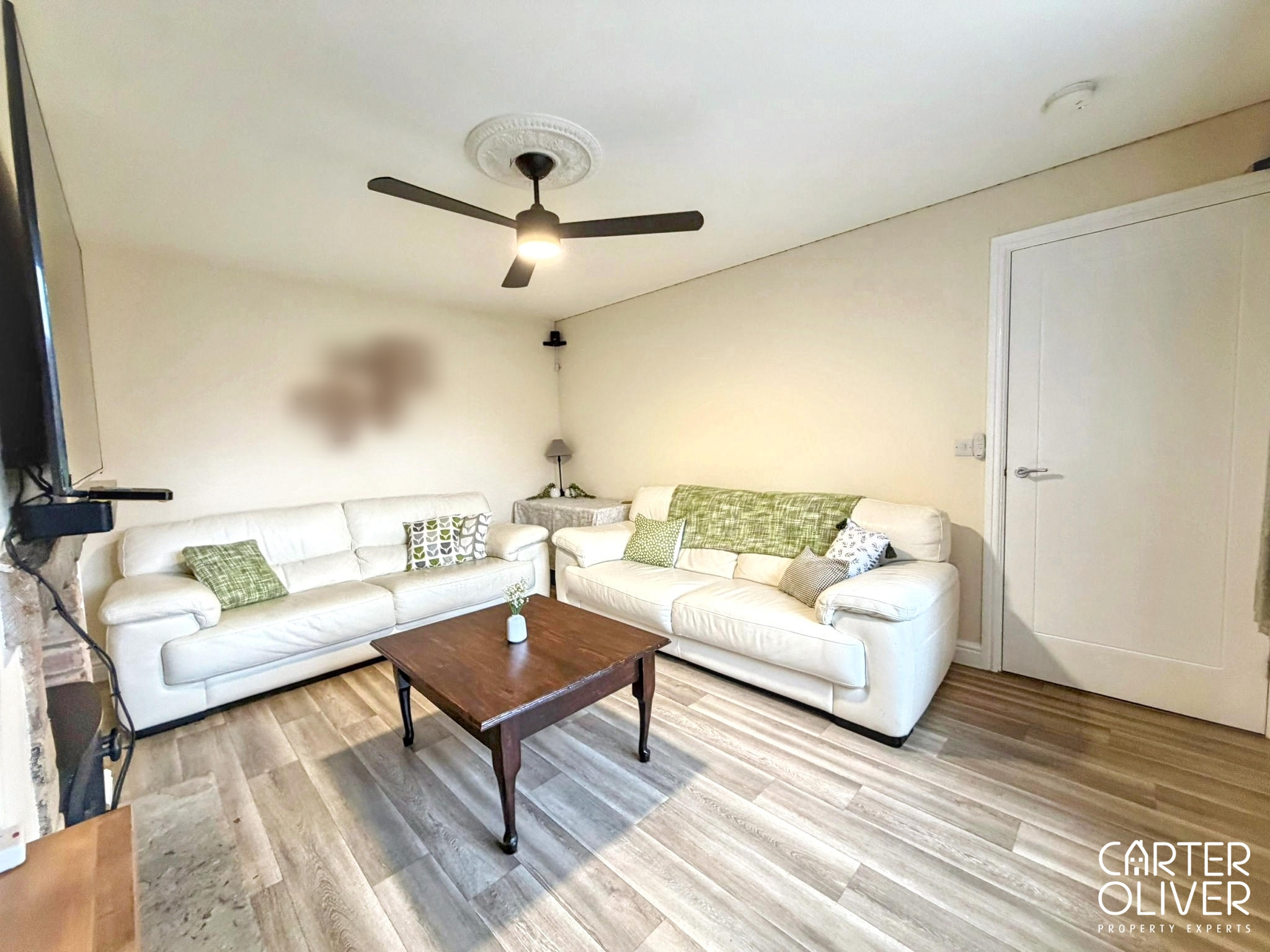 A well-presented living room, neutrally decorated to create a calm and versatile space. The room features attractive laminate wood-effect flooring and is centred around a characterful wood-burning stove, set on a brick hearth with a solid stone base, providing a warm and inviting focal point ideal for relaxing or entertaining.