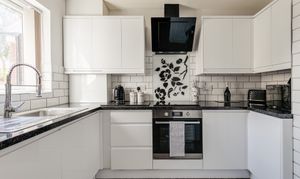 Double glazed window to front, newly fitted white gloss kitchen with base and eye level units with concealed lighting, integrated washing machine and fridge/freezer, stainless steel sink unit with mixer taps inset to worktop, built in electric hob with chimney extractor hood above, built in oven, tiled floor, built in cupboard housing wall mounted boiler for hot water and gas central heating ( not tested ), textured ceiling with downlights.