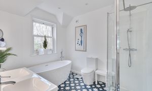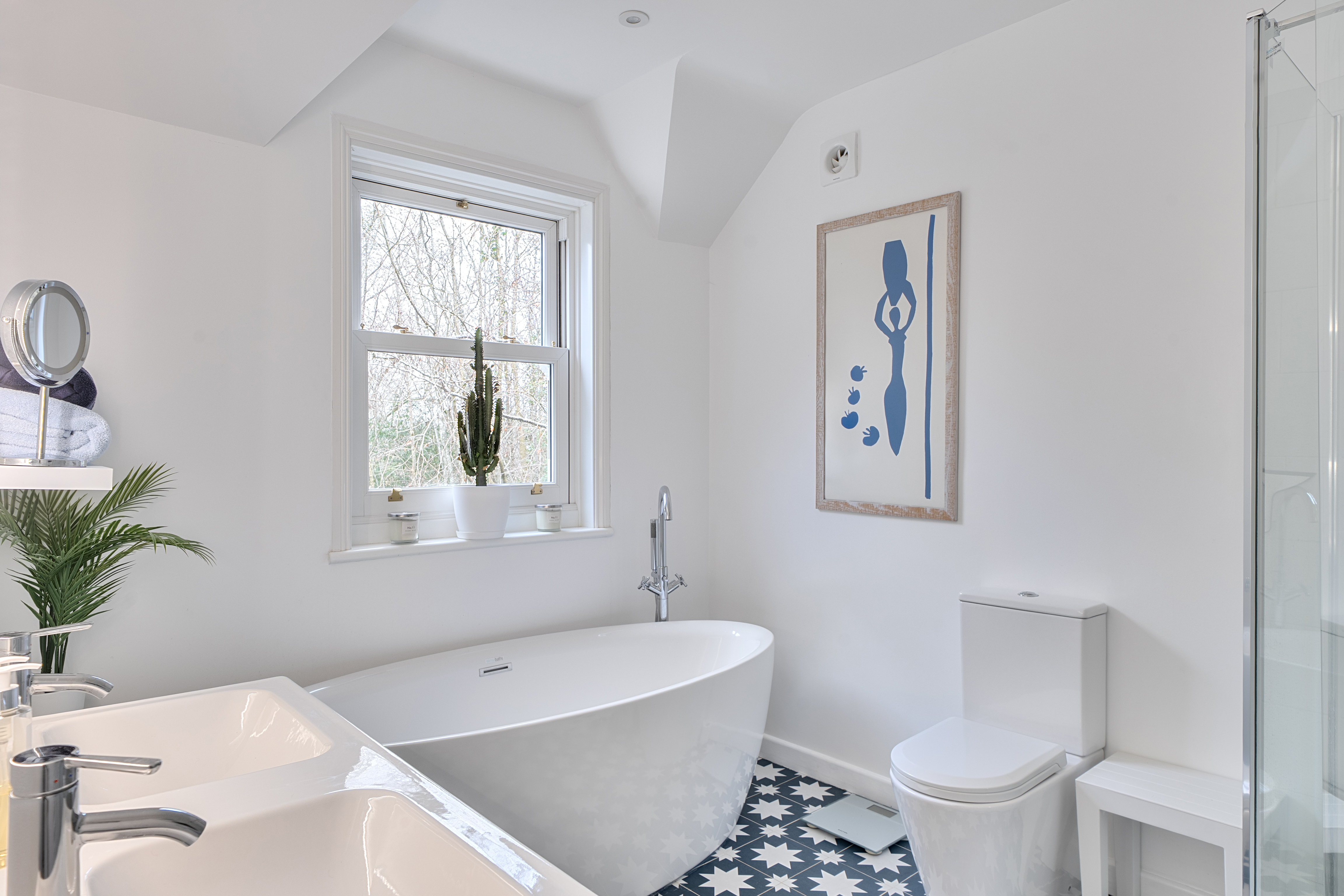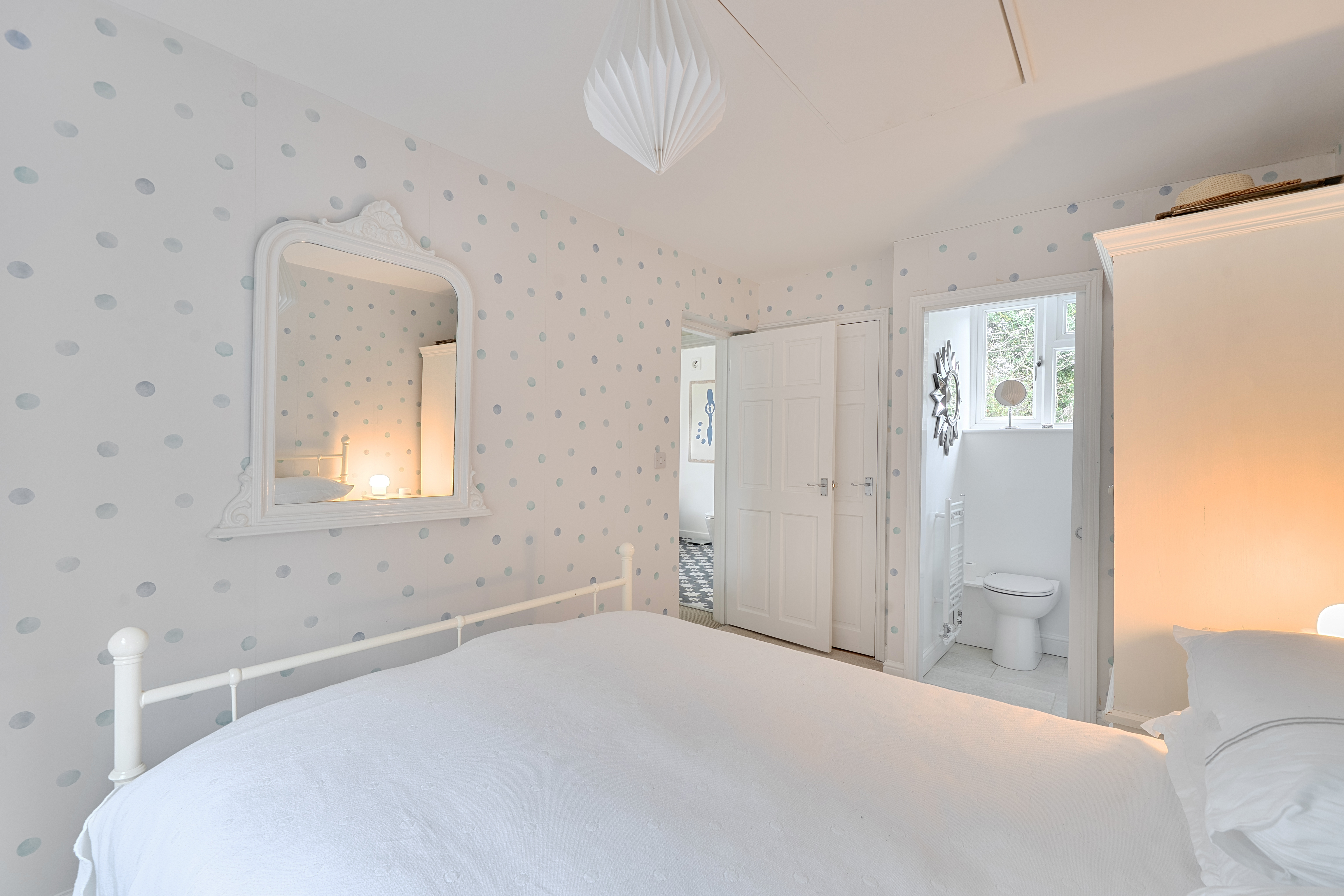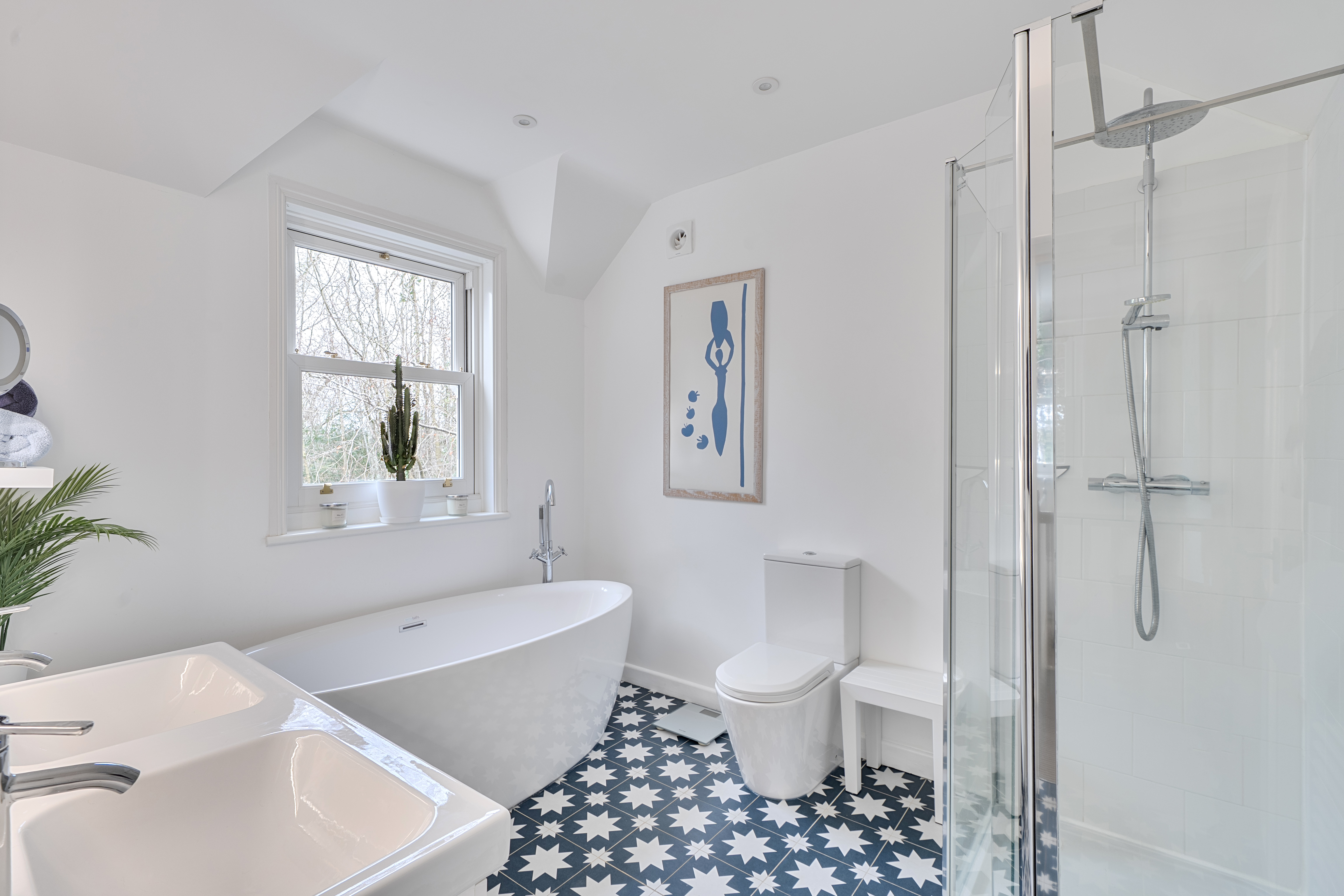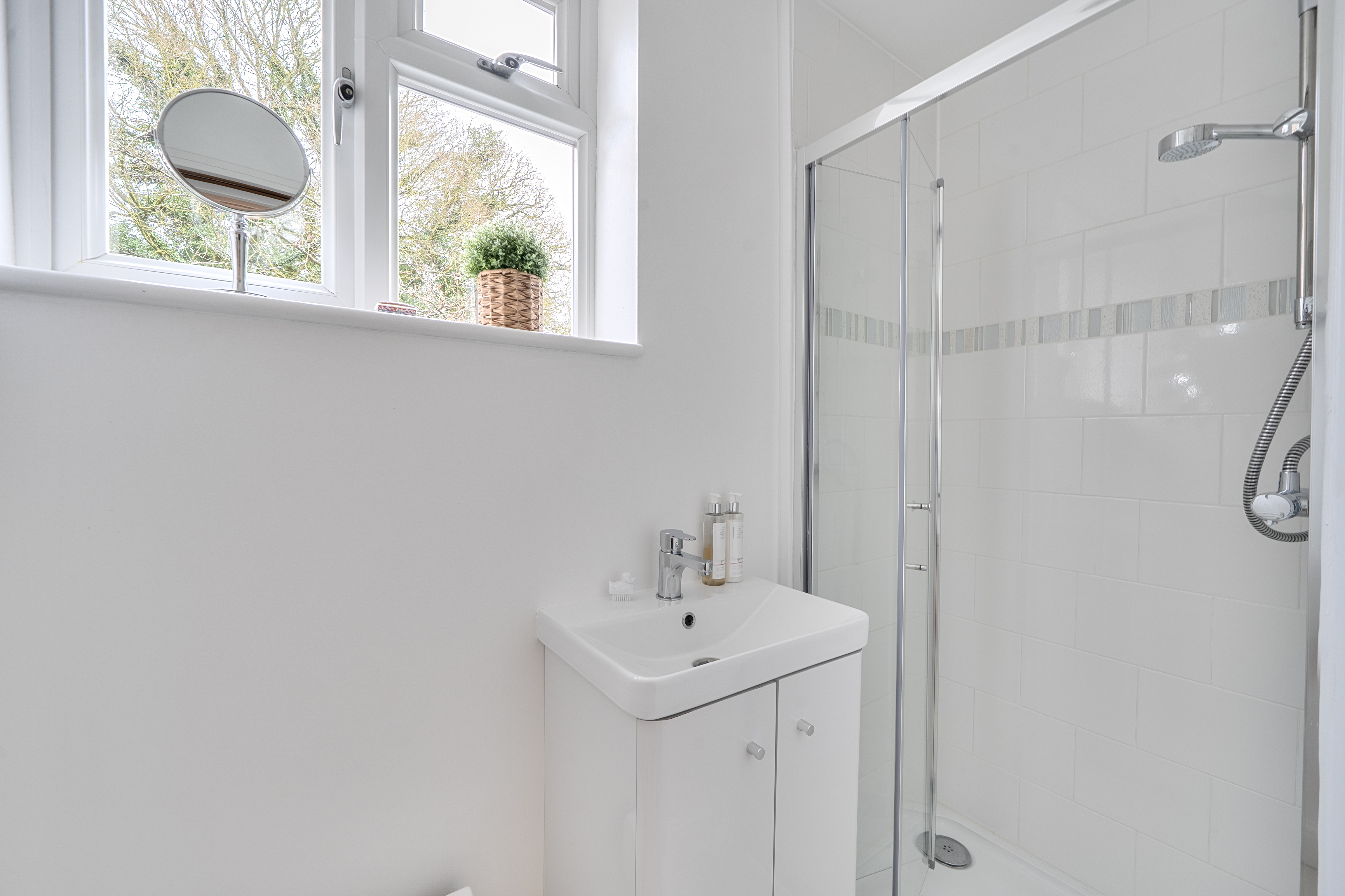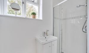 The first floor offers two well-proportioned double bedrooms, with the principal bedroom enjoying the benefit of a sleek en-suite shower room. A modern family bathroom includes both a bath and separate shower, while a convenient downstairs cloakroom serves guests.