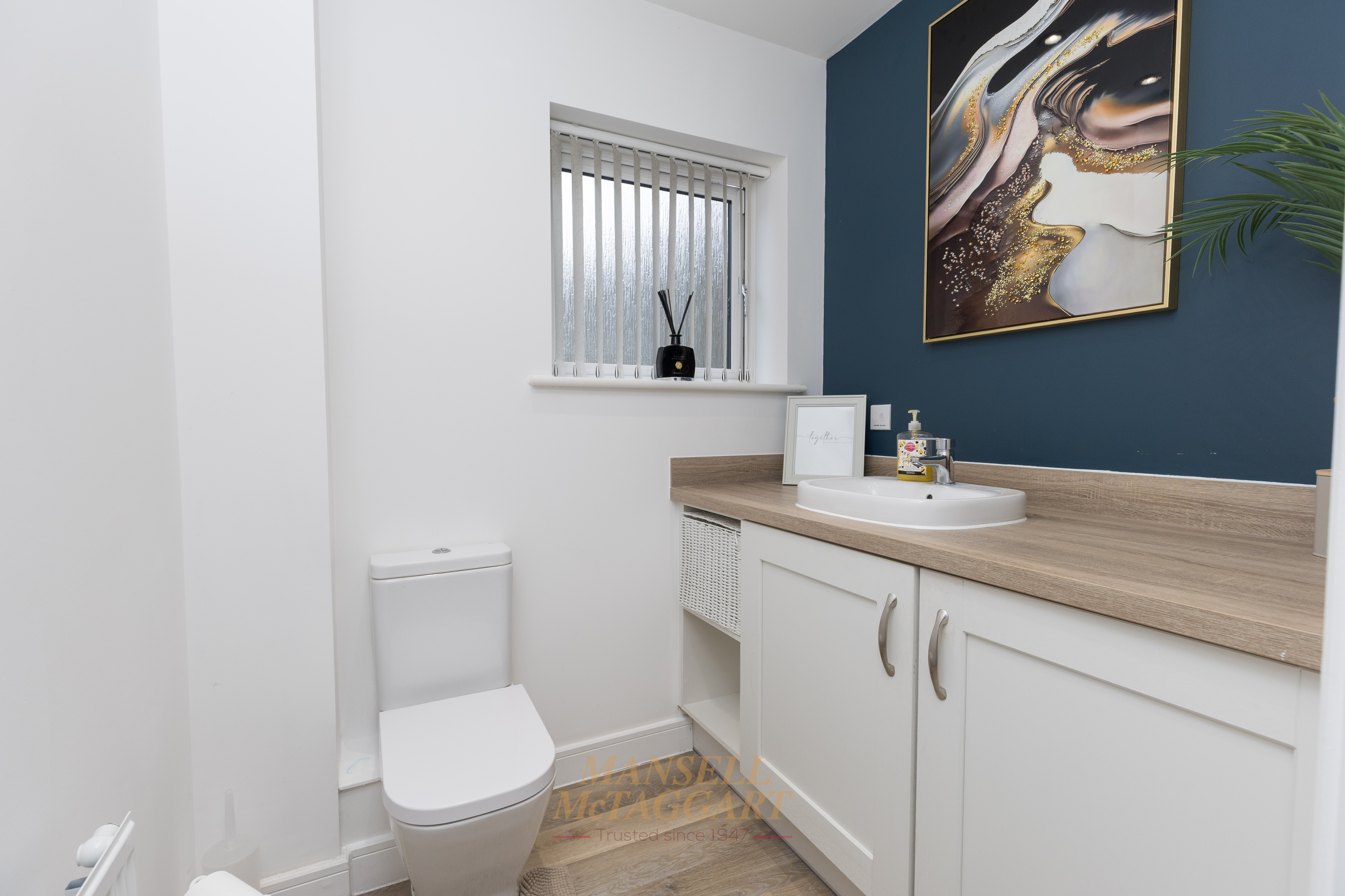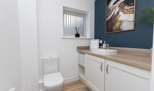 The downstairs cloakroom incorporates a cleverly designed utility area, complete with plumbing for a washing machine, work surfaces above the appliance recess, a sink unit, an extractor fan, spotlights, and a frosted window, adding practicality without compromising the flow of the home.