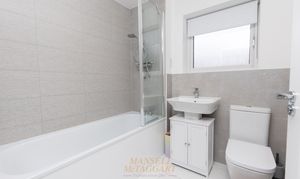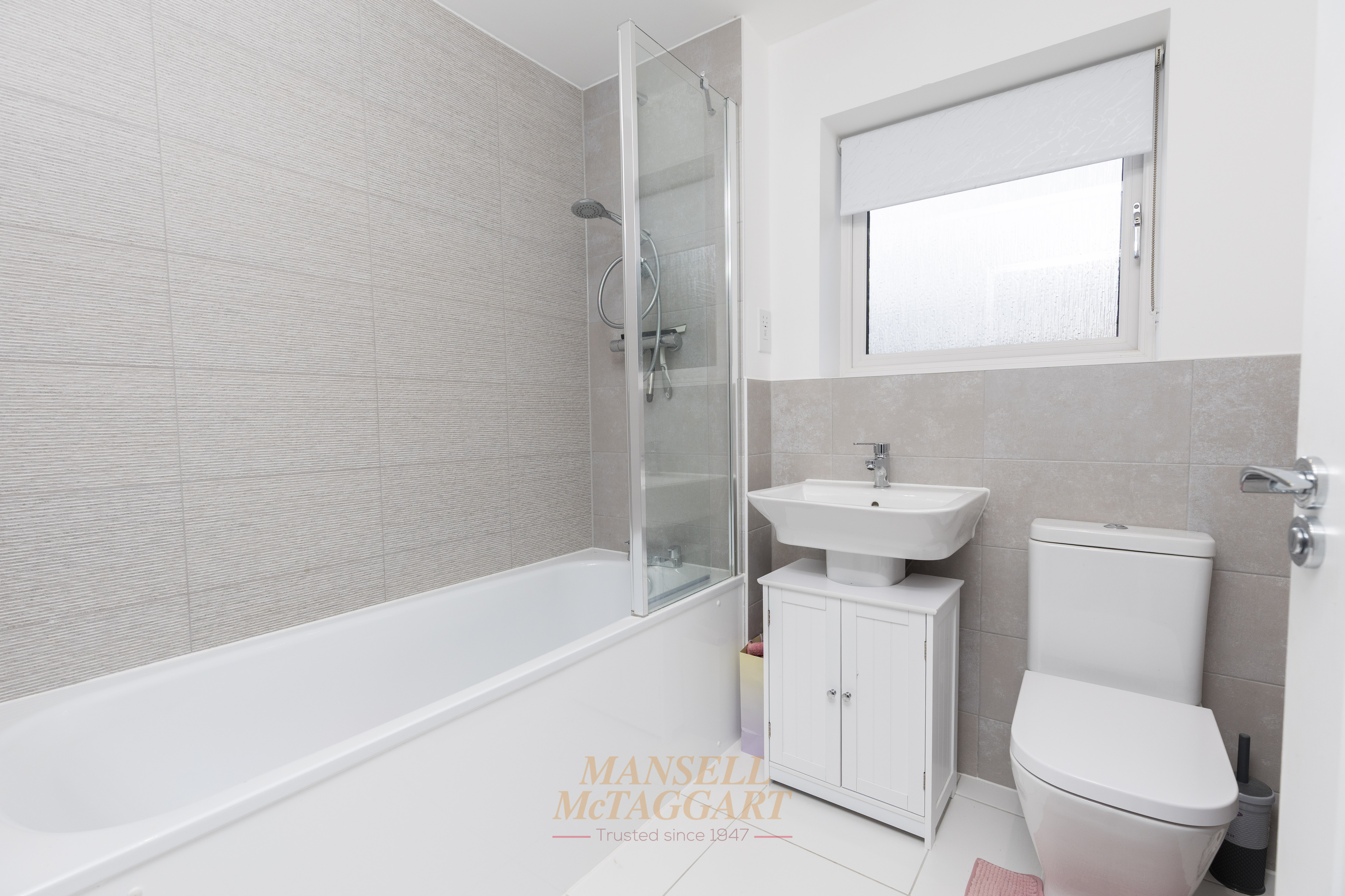 The family bathroom is well-appointed with a panelled bath, shower unit, low-level WC, wash and hand basin, extractor fan, recessed spotlights, and a frosted rear window.