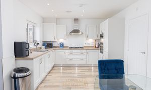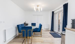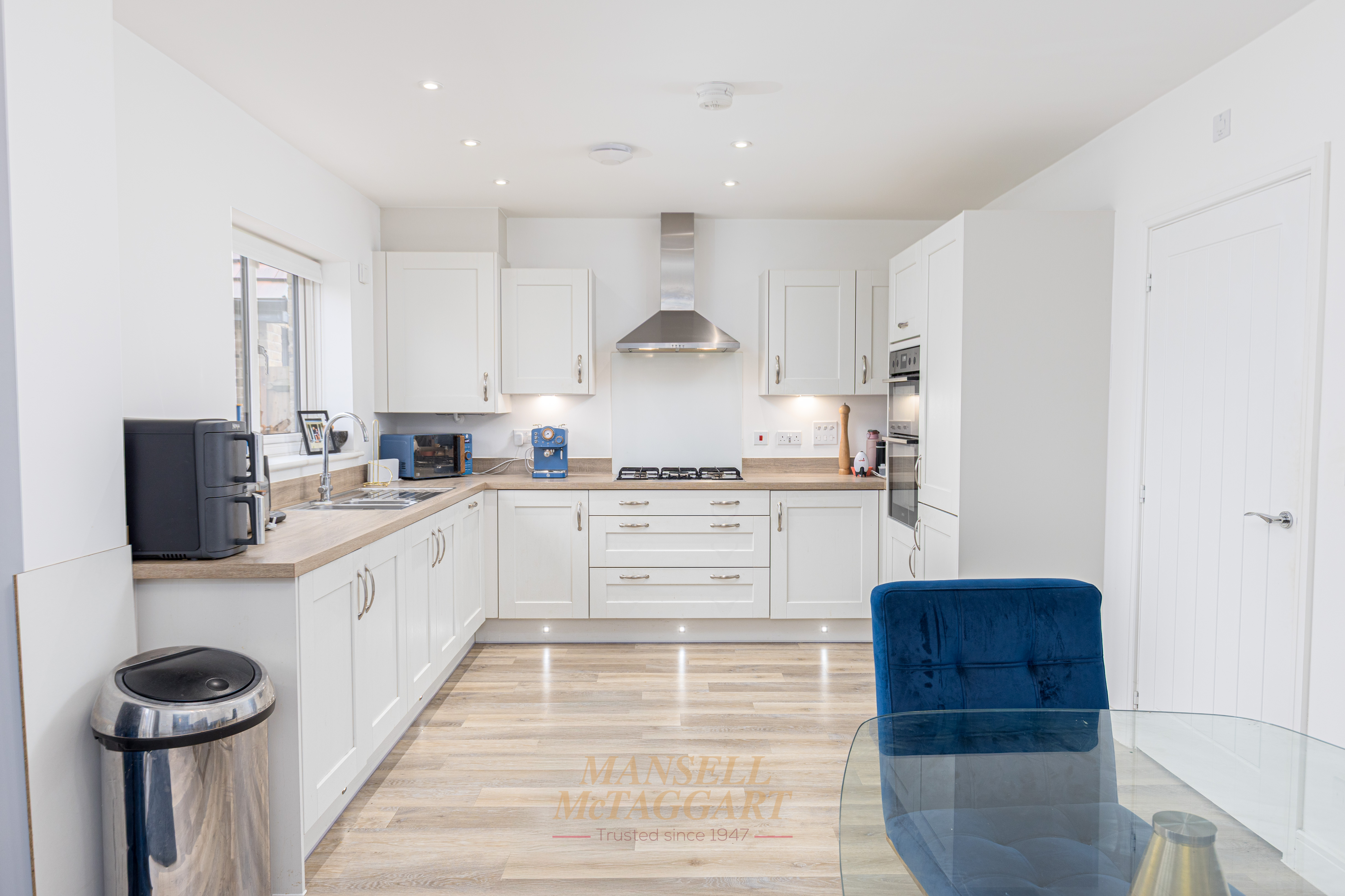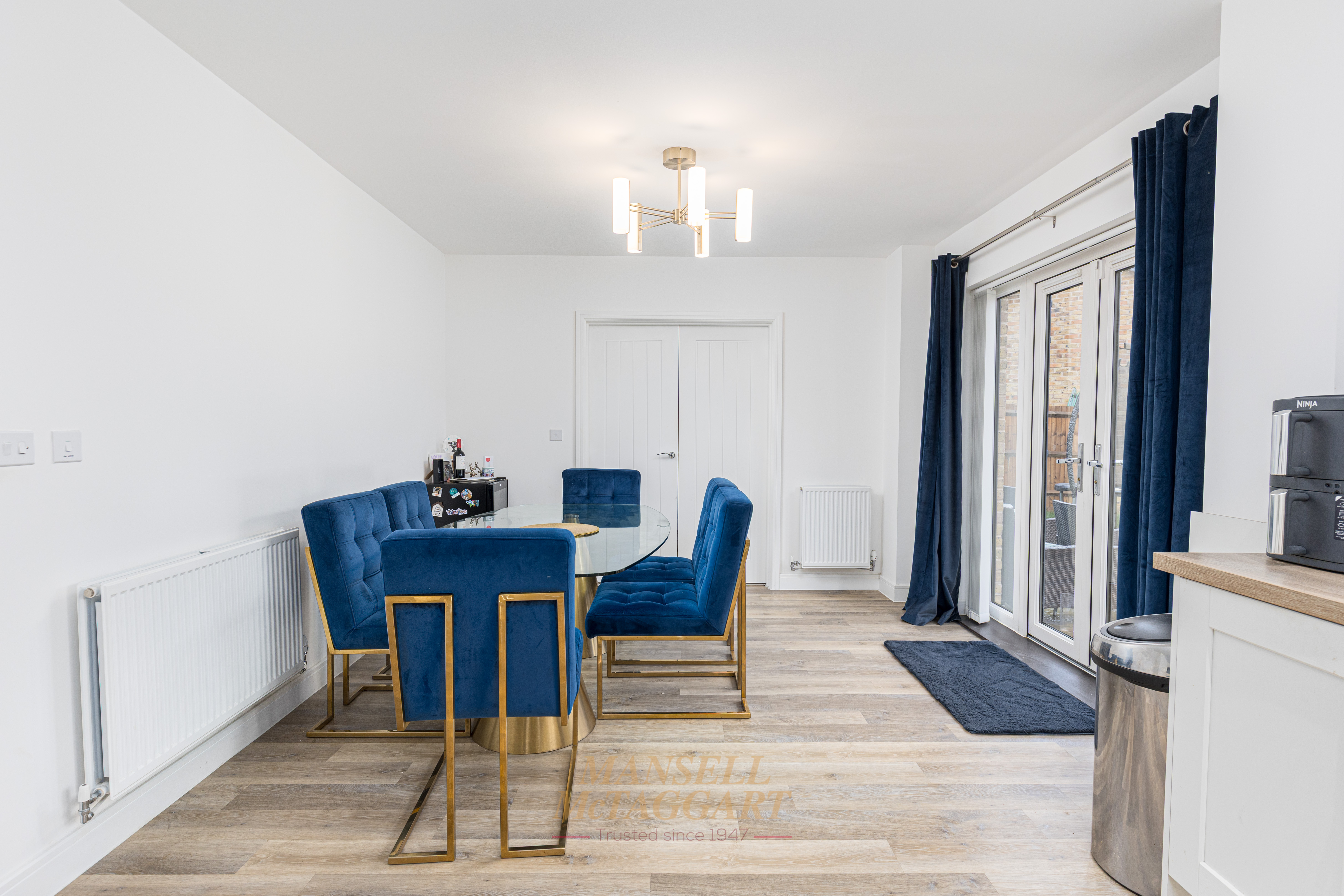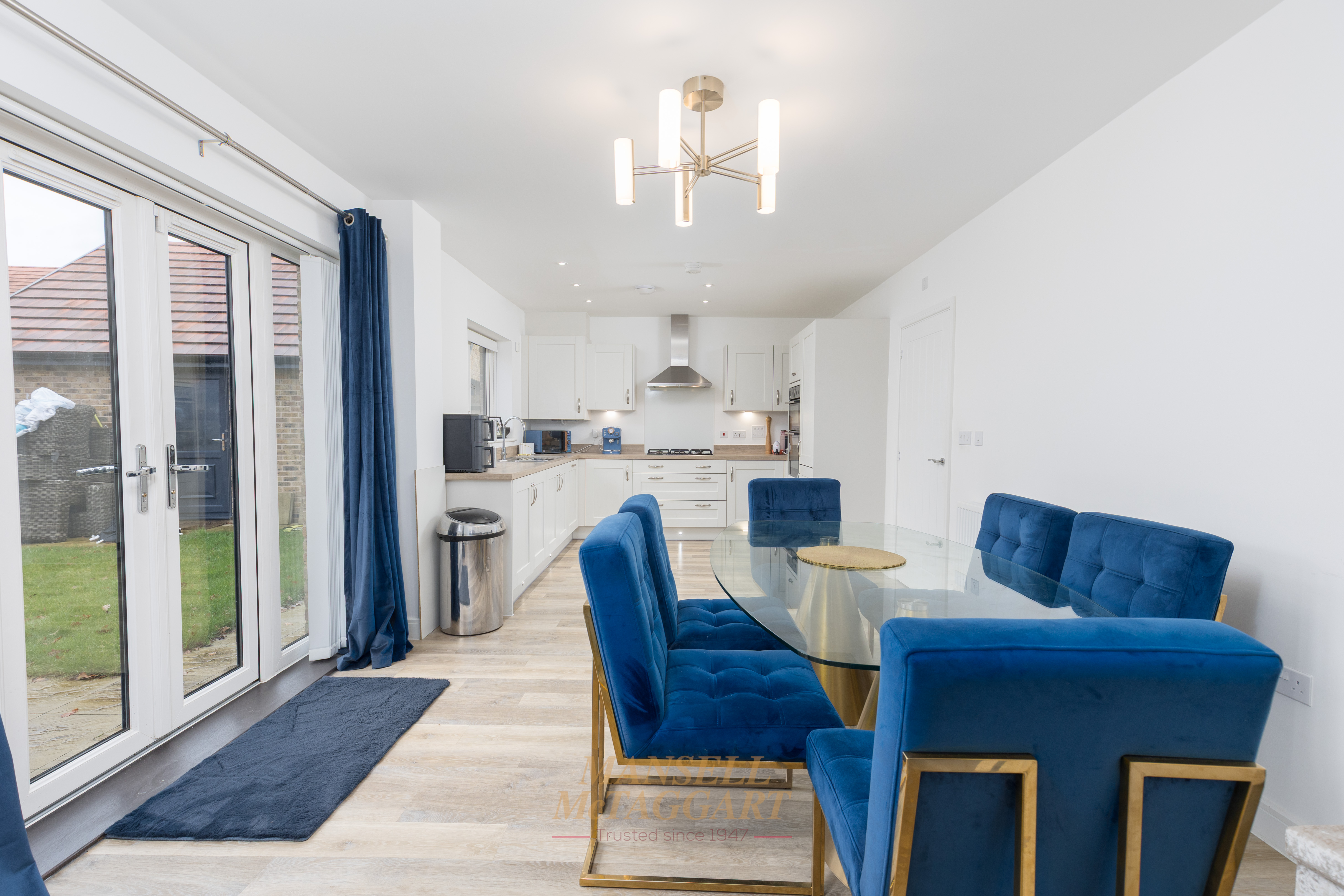 The kitchen/dining room is a superb family and entertaining space. The dining area comfortably holds a six-seater table. At the same time, the kitchen itself features an extensive range of stylish high-gloss units and integrated appliances, including an oven, gas hob, and dishwasher. Patio doors open directly onto the rear patio, allowing seamless indoor–outdoor living—perfect for summer dining, children playing nearby, or simply enjoying the morning sun with a coffee.