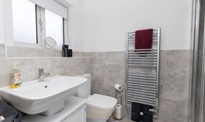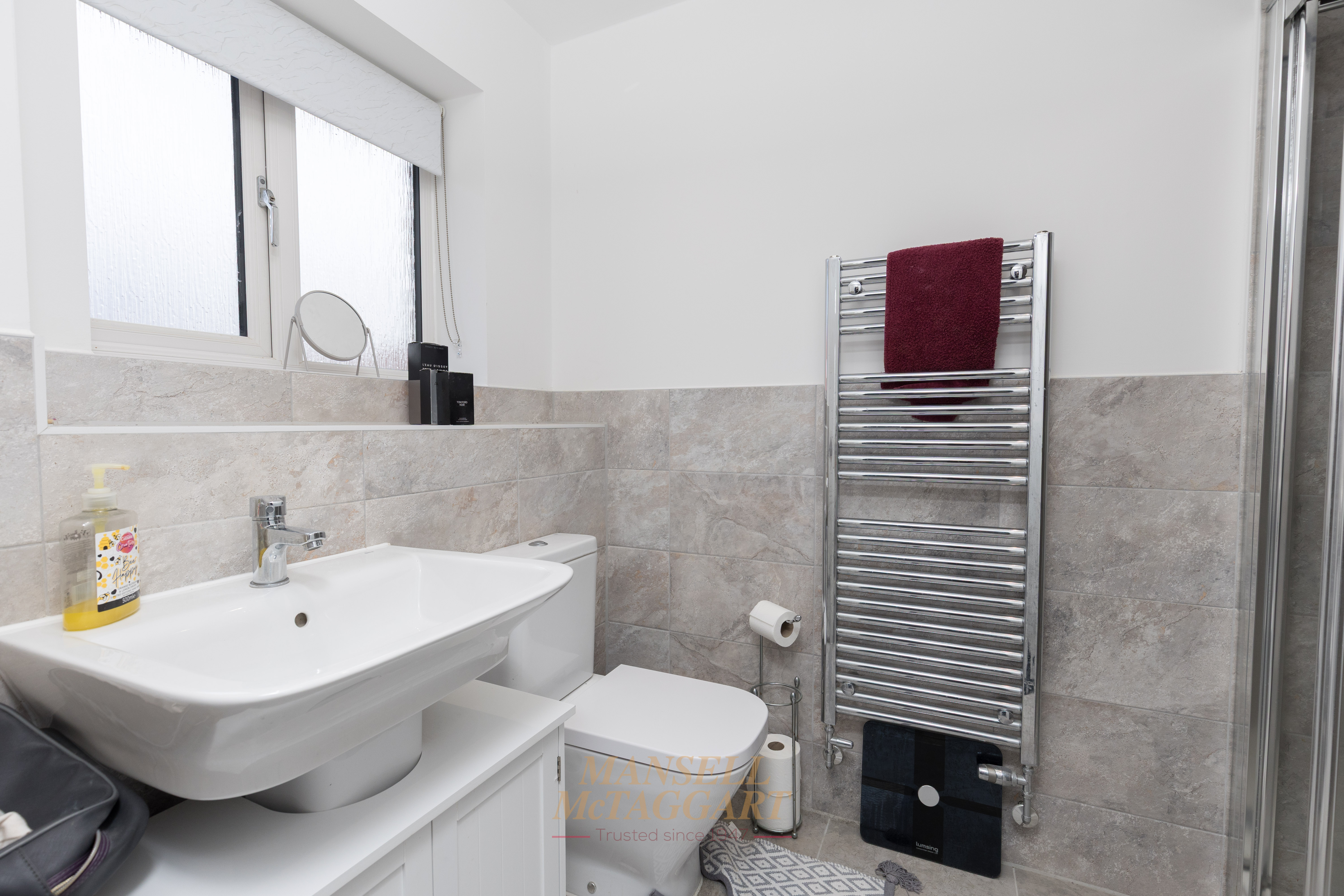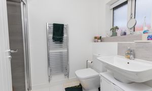 The principal bedroom suite benefits from fitted wardrobes and its own large en-suite shower room featuring a shower cubicle, low-level WC, wash hand basin, heated towel rail, extractor fan, partial tiling, and recessed spotlights.
