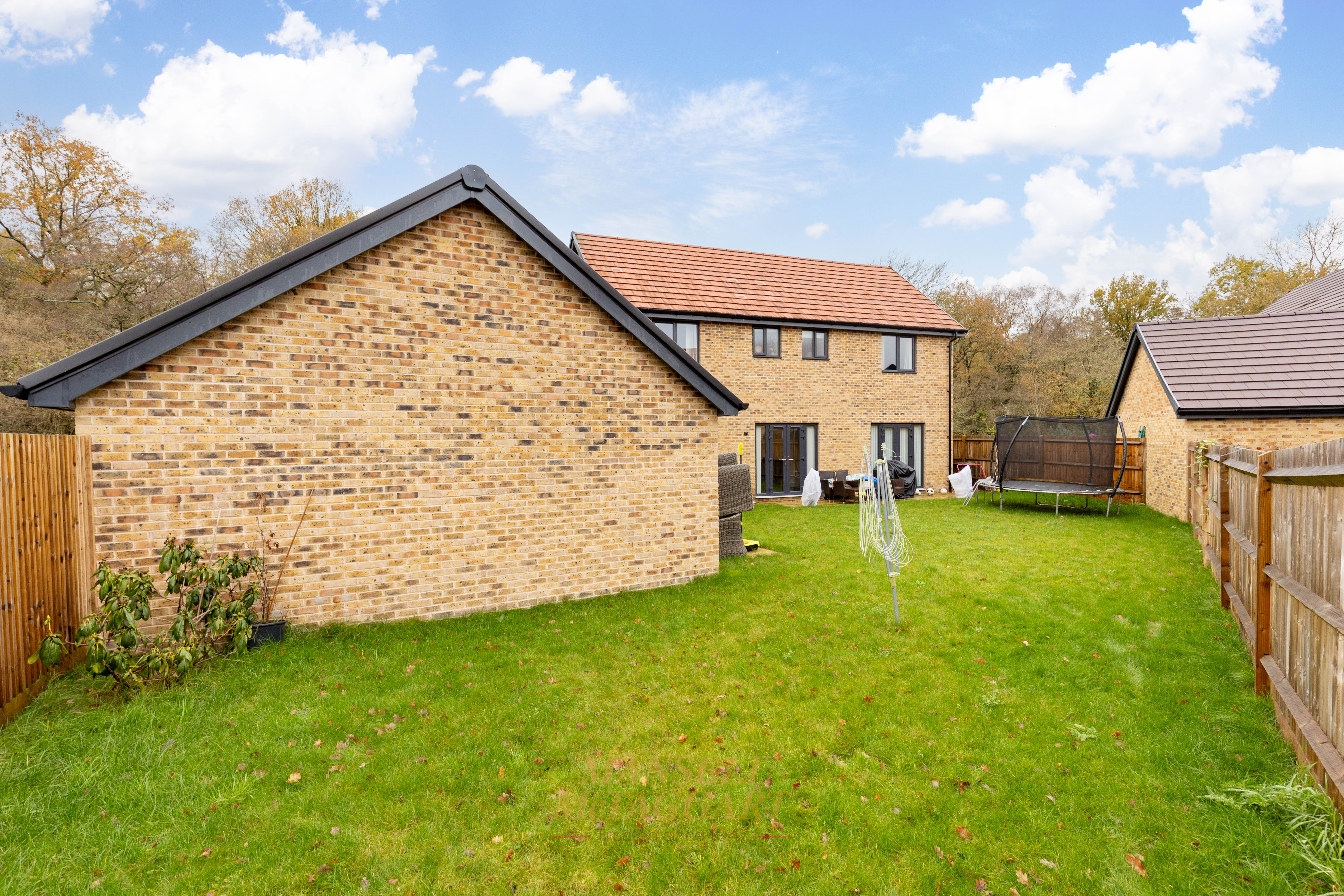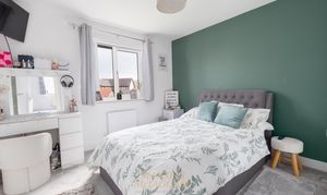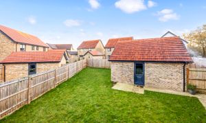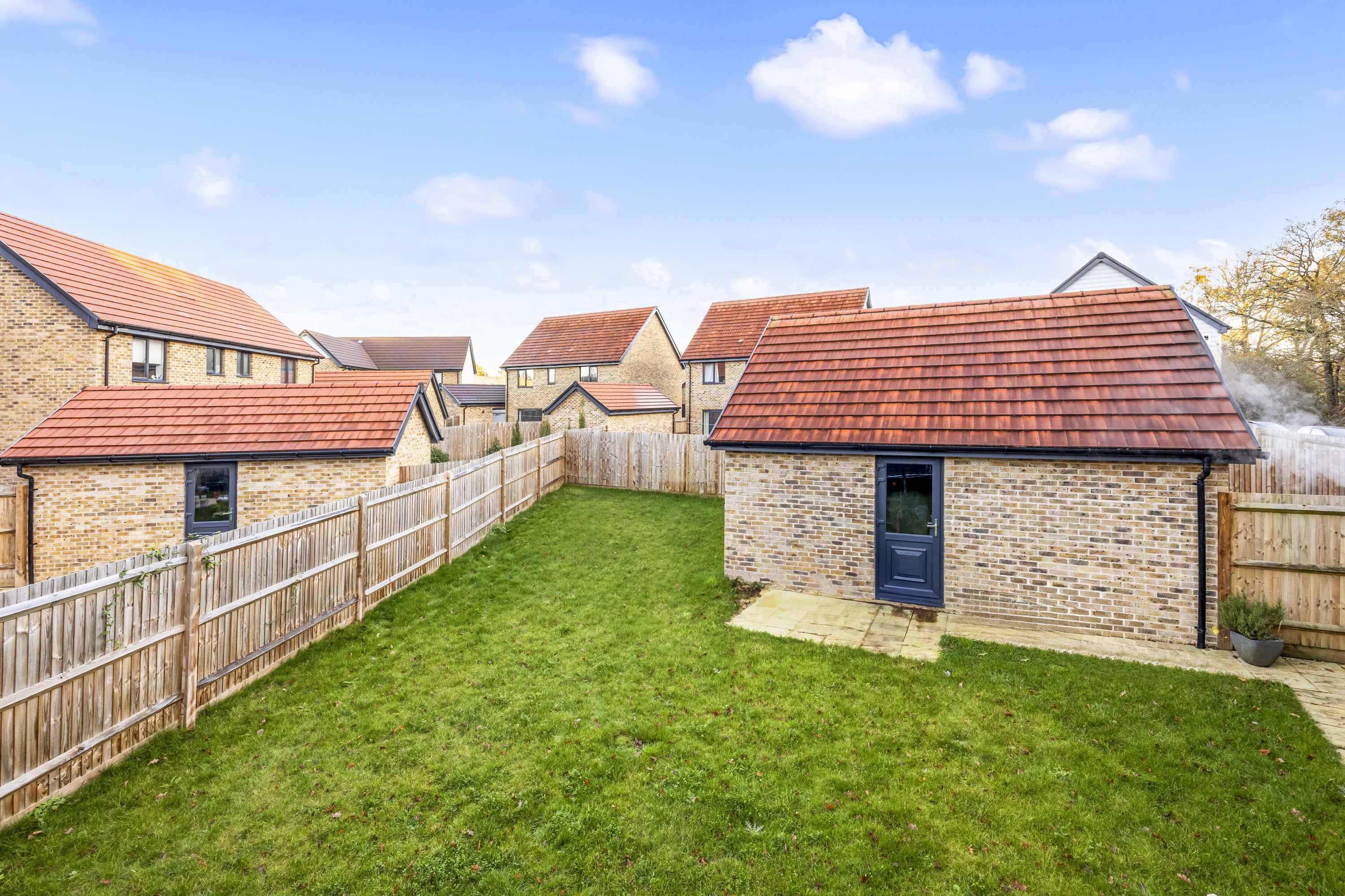 The east-facing rear garden offers an excellent balance of lawn and patio, providing areas for dining, relaxing, and children’s play. Enclosed by wooden panel fencing, it is secure and private with space for a shed or additional storage.