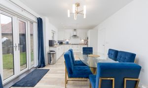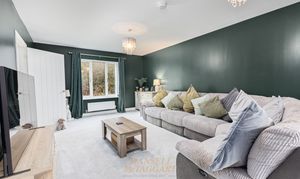 The double-aspect living room is one of the home's standout spaces. With views over the woodland at the front and patio doors opening to the east-facing rear garden, it enjoys superb natural light throughout the day. The room easily accommodates large sofas and freestanding furniture, making it the perfect setting for both relaxed family evenings and entertaining guests. Double-panelled internal doors open through to the impressive kitchen/dining room, allowing an open flow when hosting.