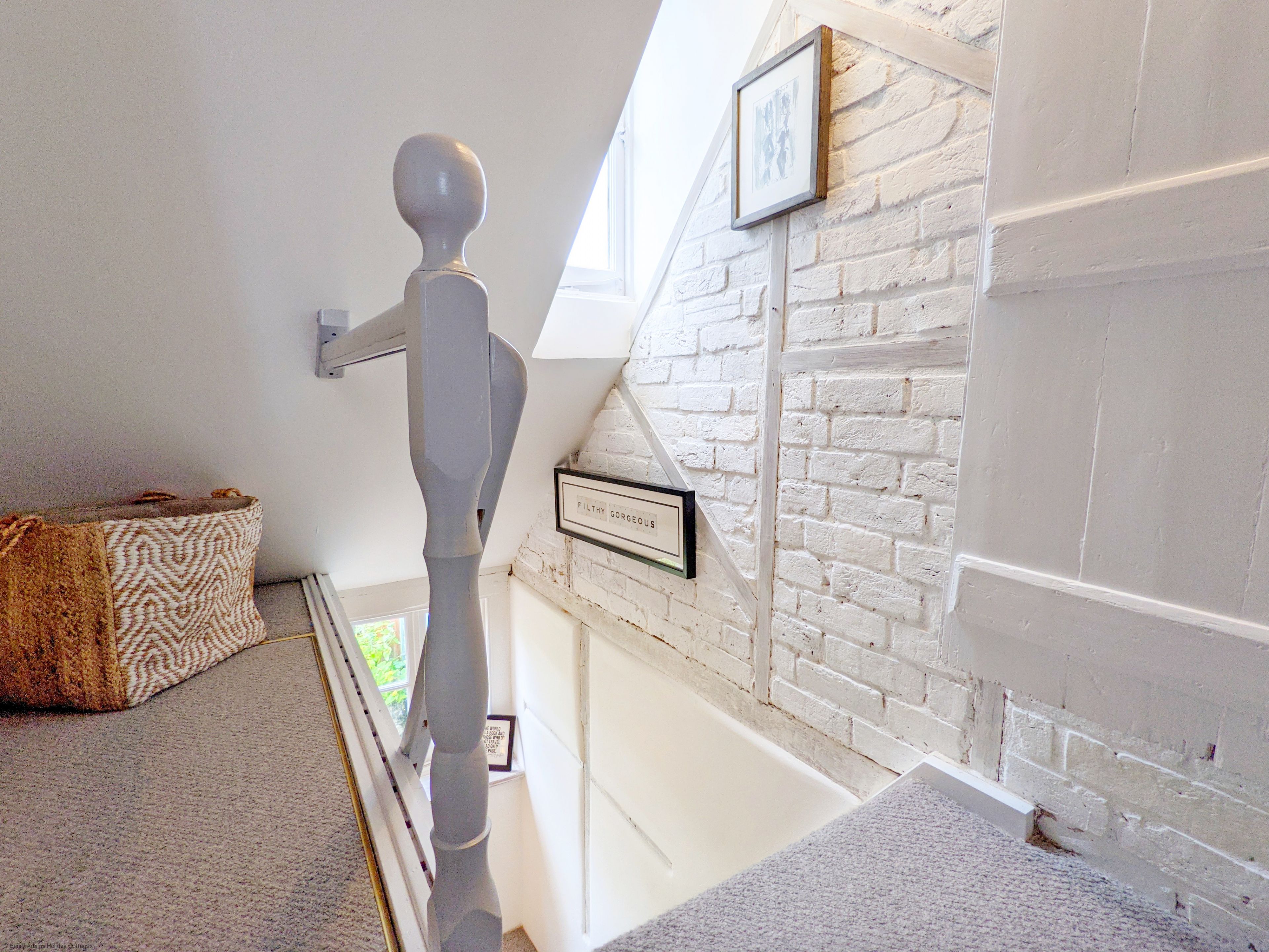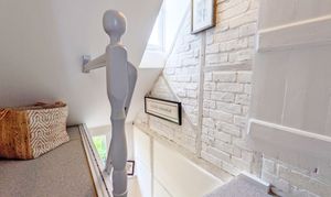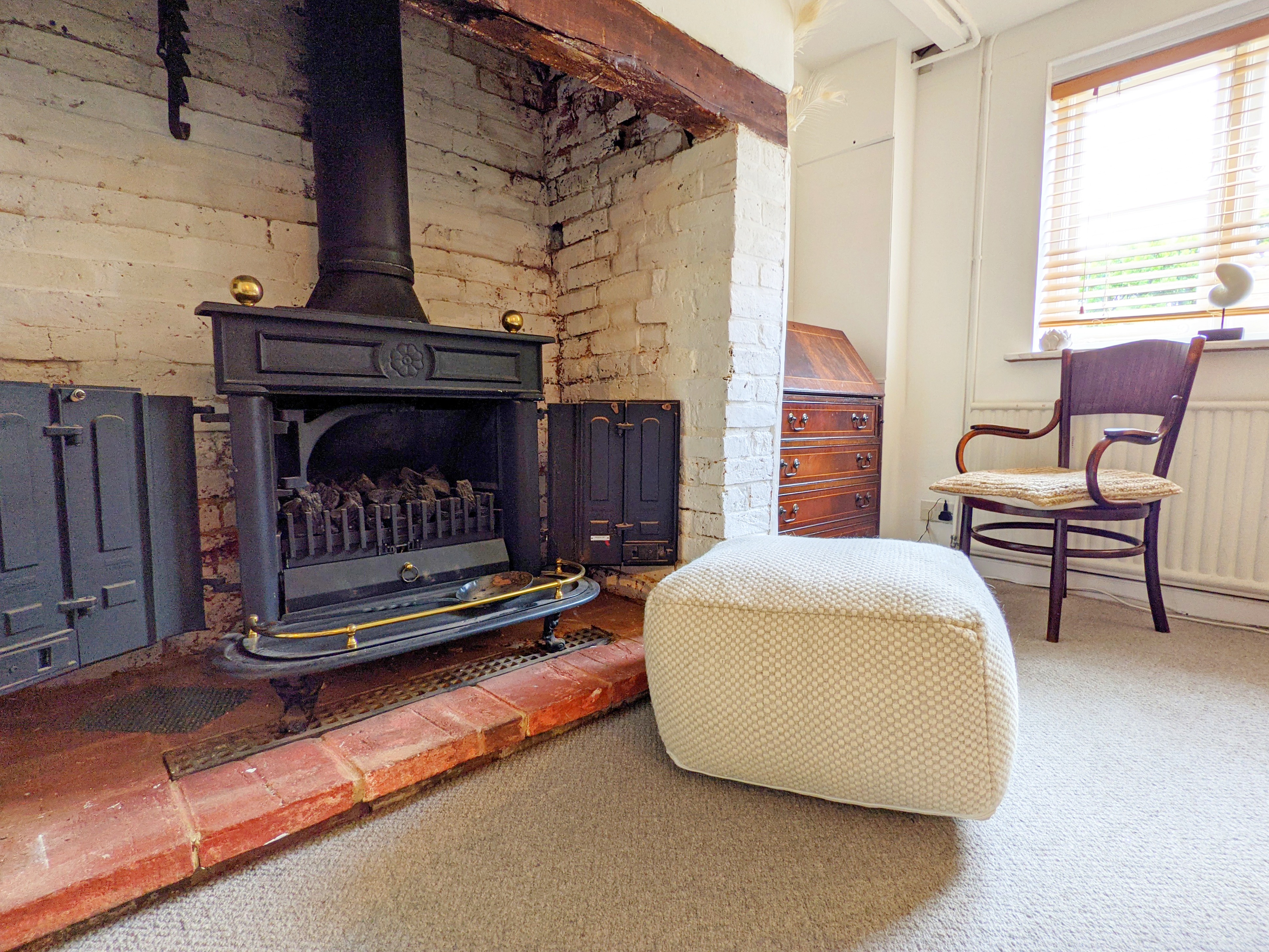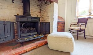 The spacious sitting room is a particular highlight, centred around an impressive exposed-brick fireplace which forms a striking focal point. A beautiful stained-glass feature window provides an attractive visual connection through to the kitchen, enhancing the cottage’s unique appeal.