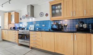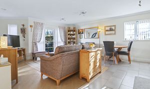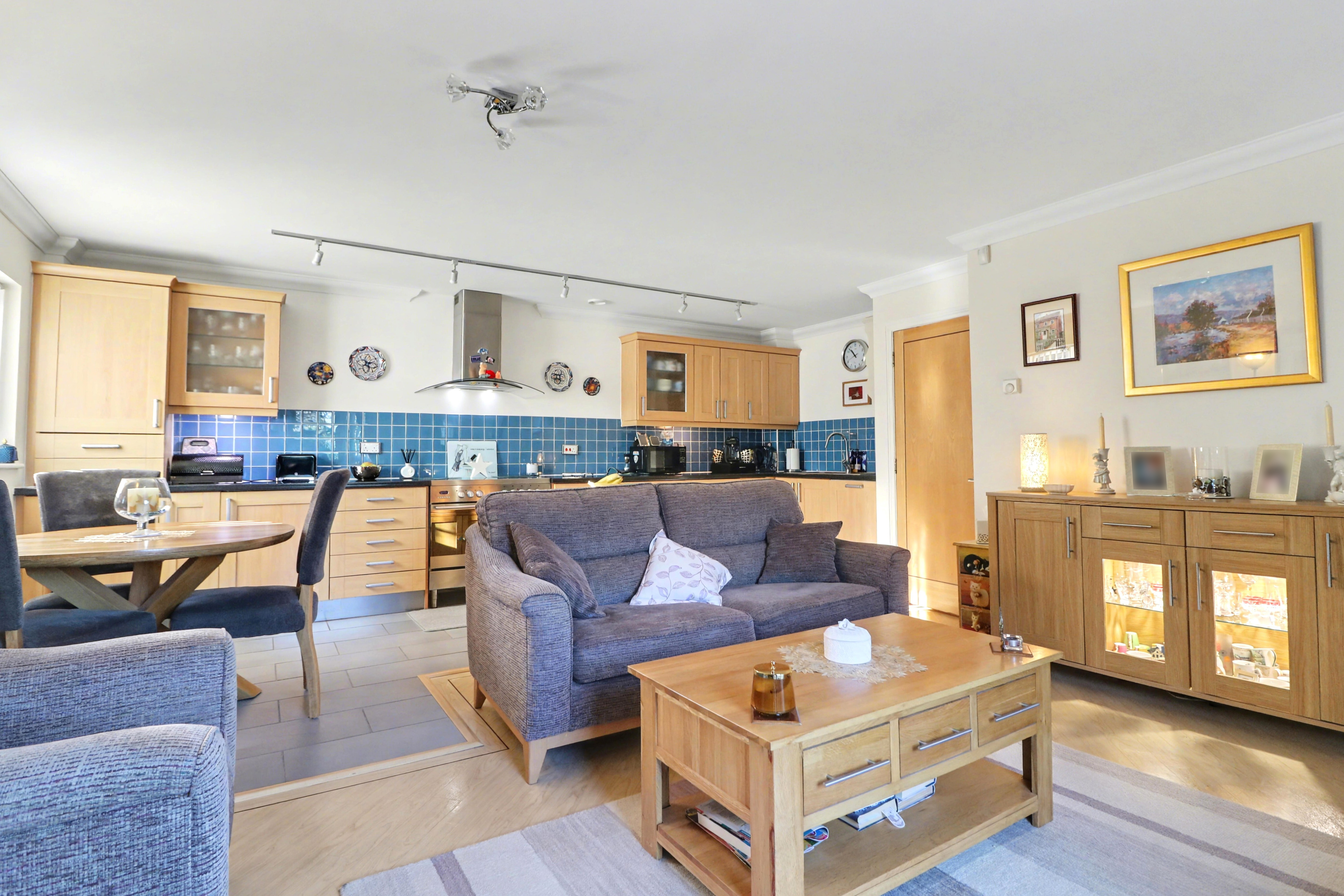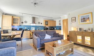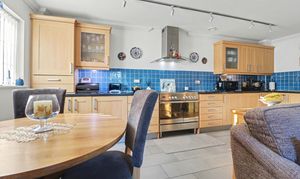 The impressive, kitchen/dining/living area enjoys a dual aspect, offering light and spacious accommodation, with a door leading out to the private patio area. The stylish kitchen has been fitted with a range of wall and base units with a Range style cooker with extractor over and integrated appliances including a fridge, freezer, dishwasher and washer/dryer.