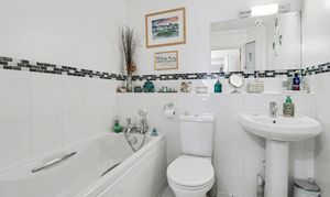 The bathroom has been fitted with a modern suite comprising a panel enclosed bath, wash hand basin and WC.