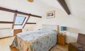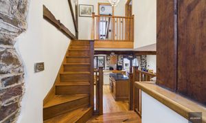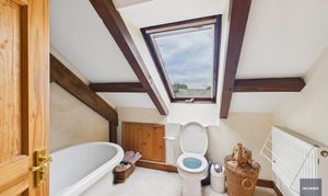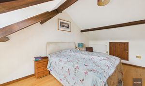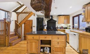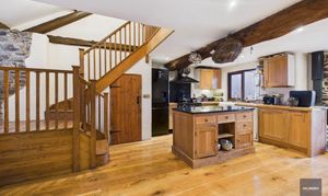 Upstairs in the original barn are three bedrooms with character and views over the countryside. Up a separate staircase leading from the kitchen, there’s a large vaulted ceilinged bedroom and a further bathroom with roll top bath.
