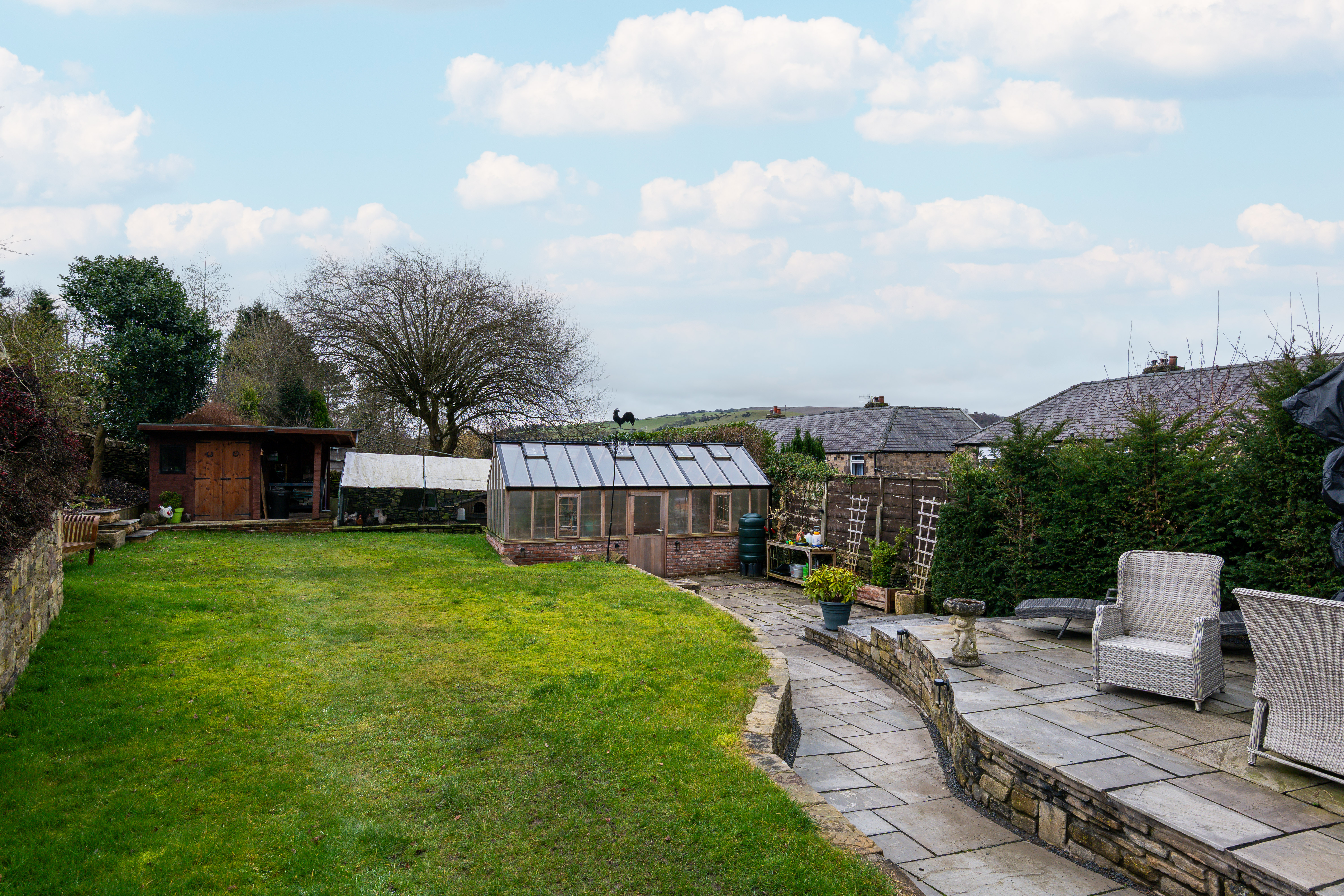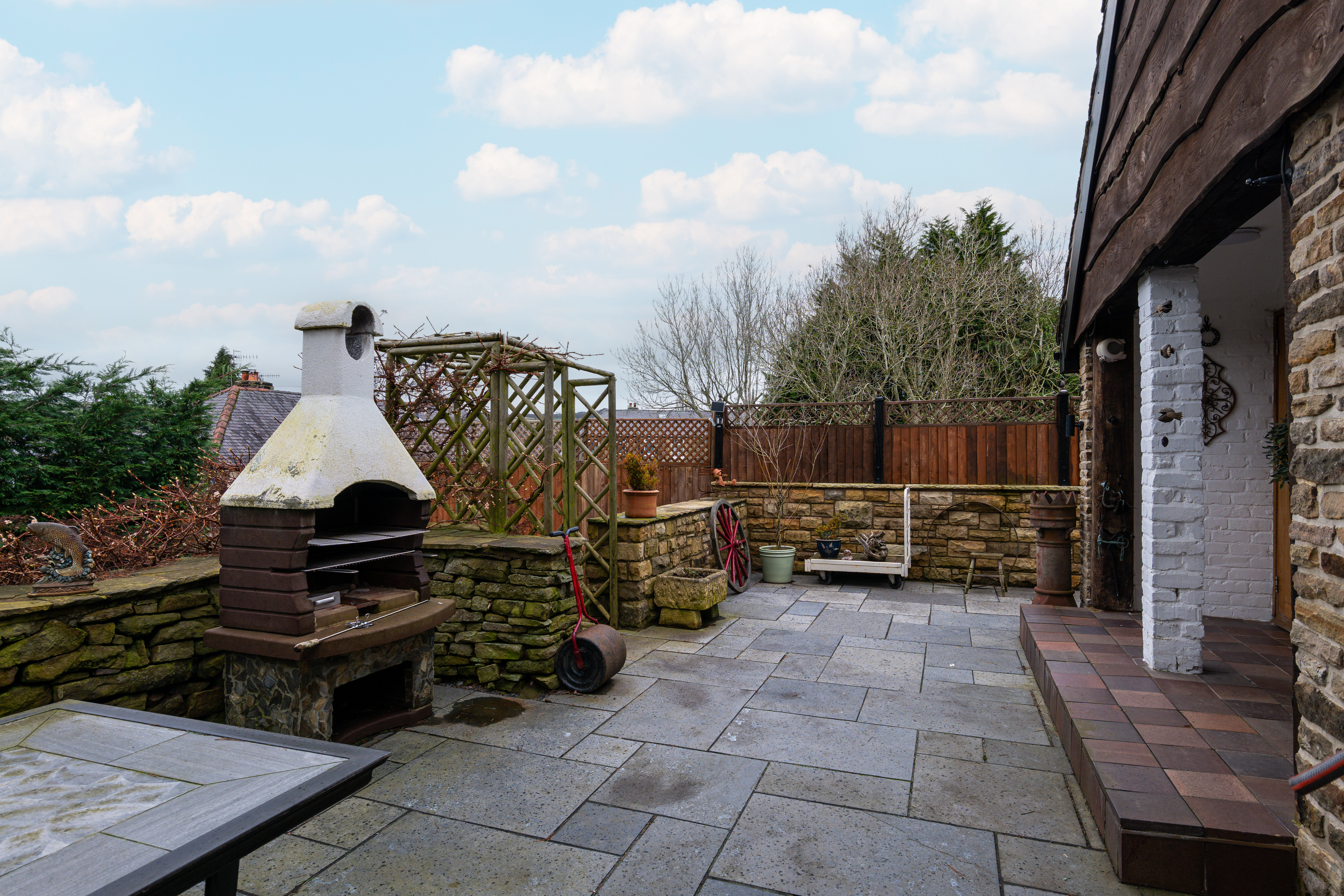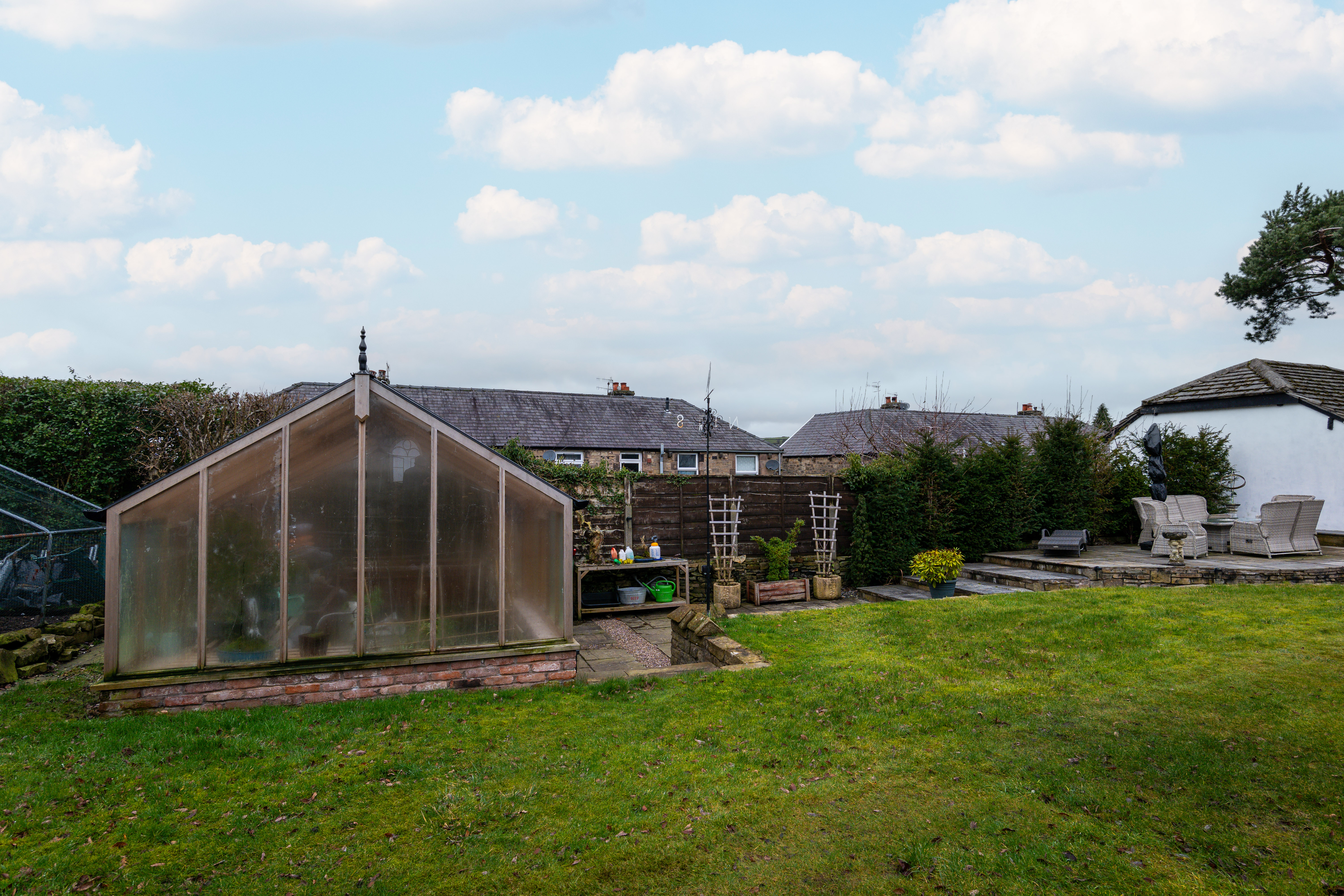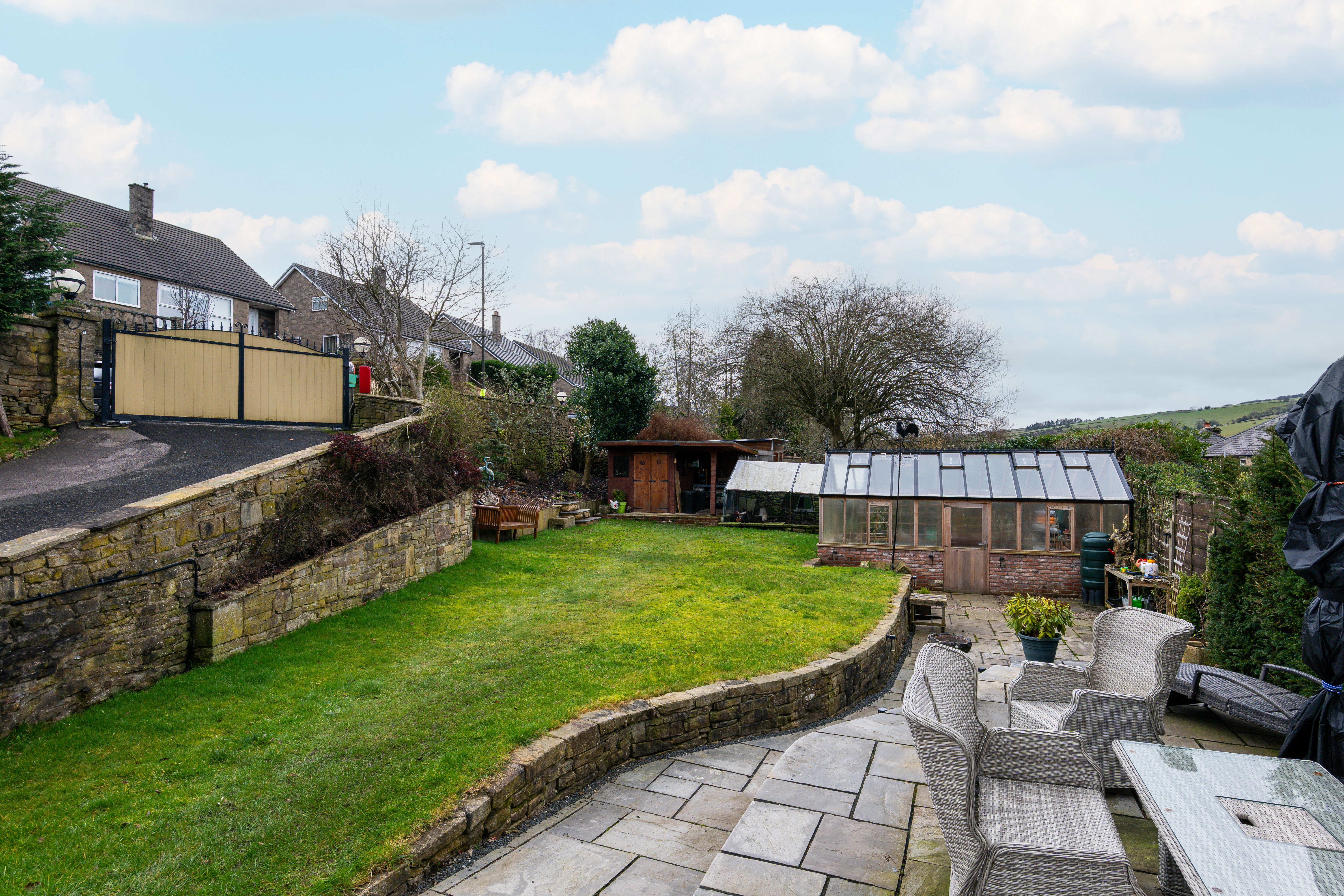 Occupying an impressive third-of-an-acre plot, the property provides outstanding outdoor space and versatility. Accessed via a remote-controlled electric gate, the home opens onto a substantial driveway with parking for at least three vehicles. The beautifully landscaped gardens feature a tiled patio ideal for outdoor dining, a substantial stone-built barbecue complete with pizza oven, and a half-brick, half-glass greenhouse with automatic opening windows — a fantastic addition for gardening enthusiasts.