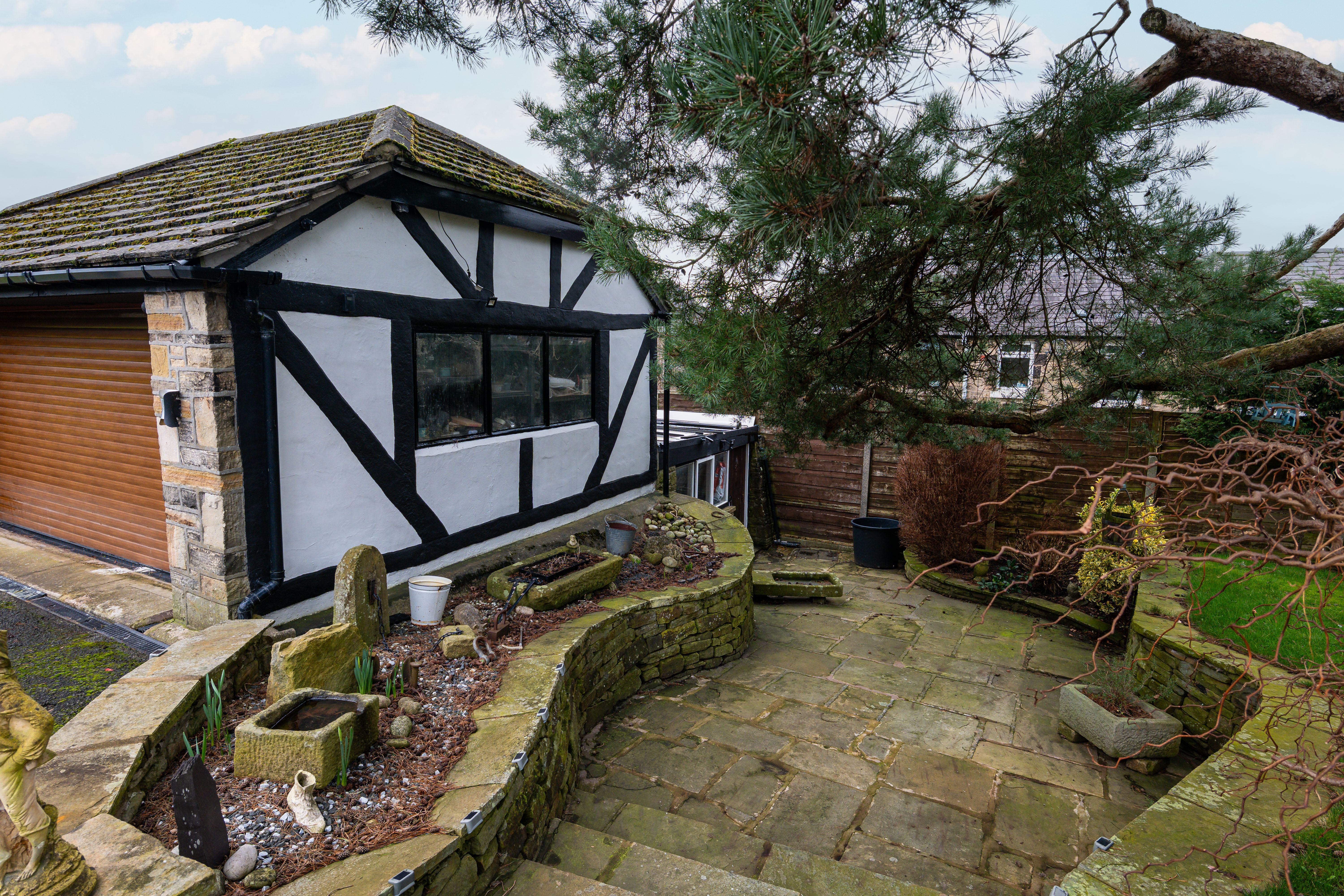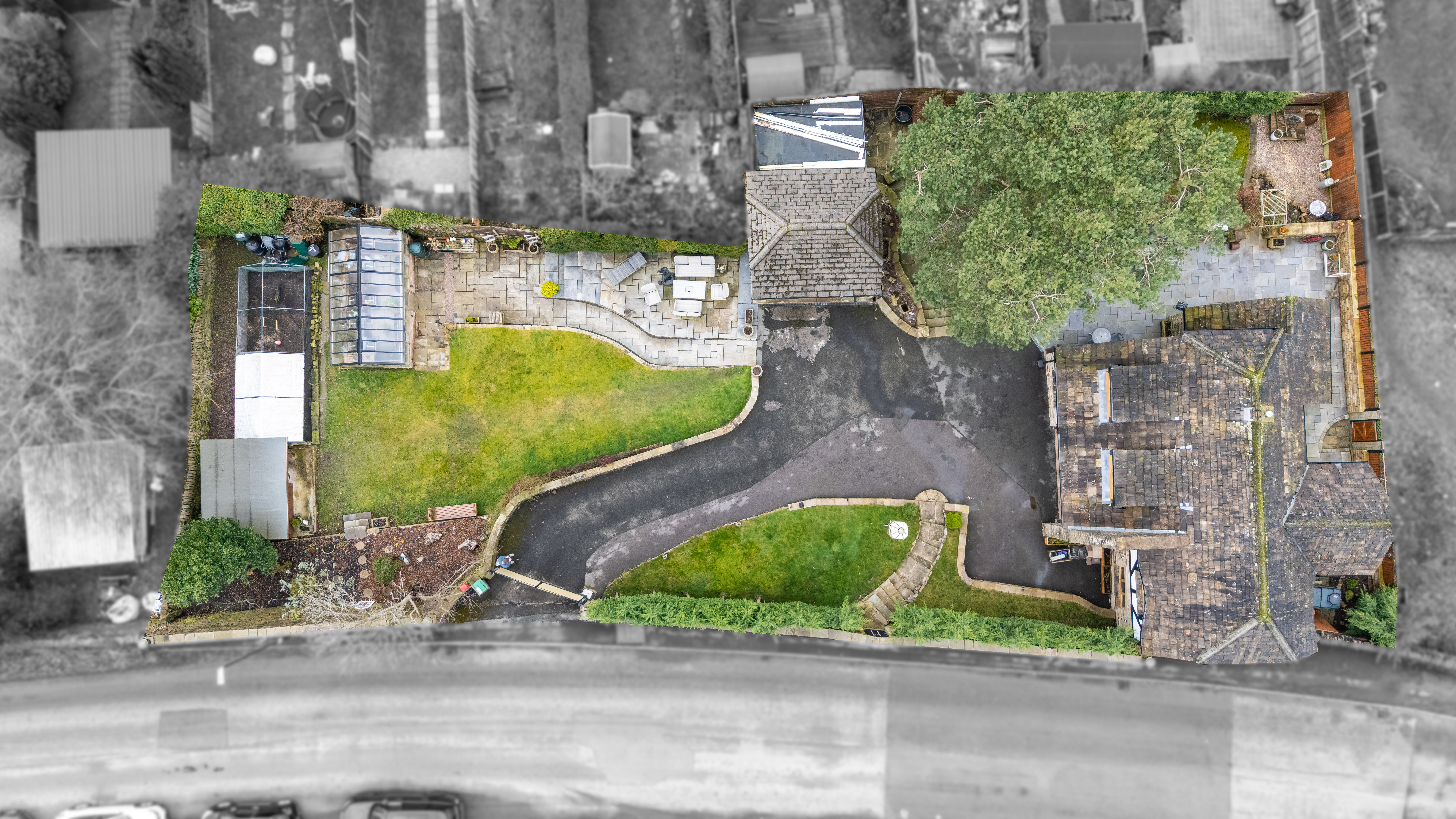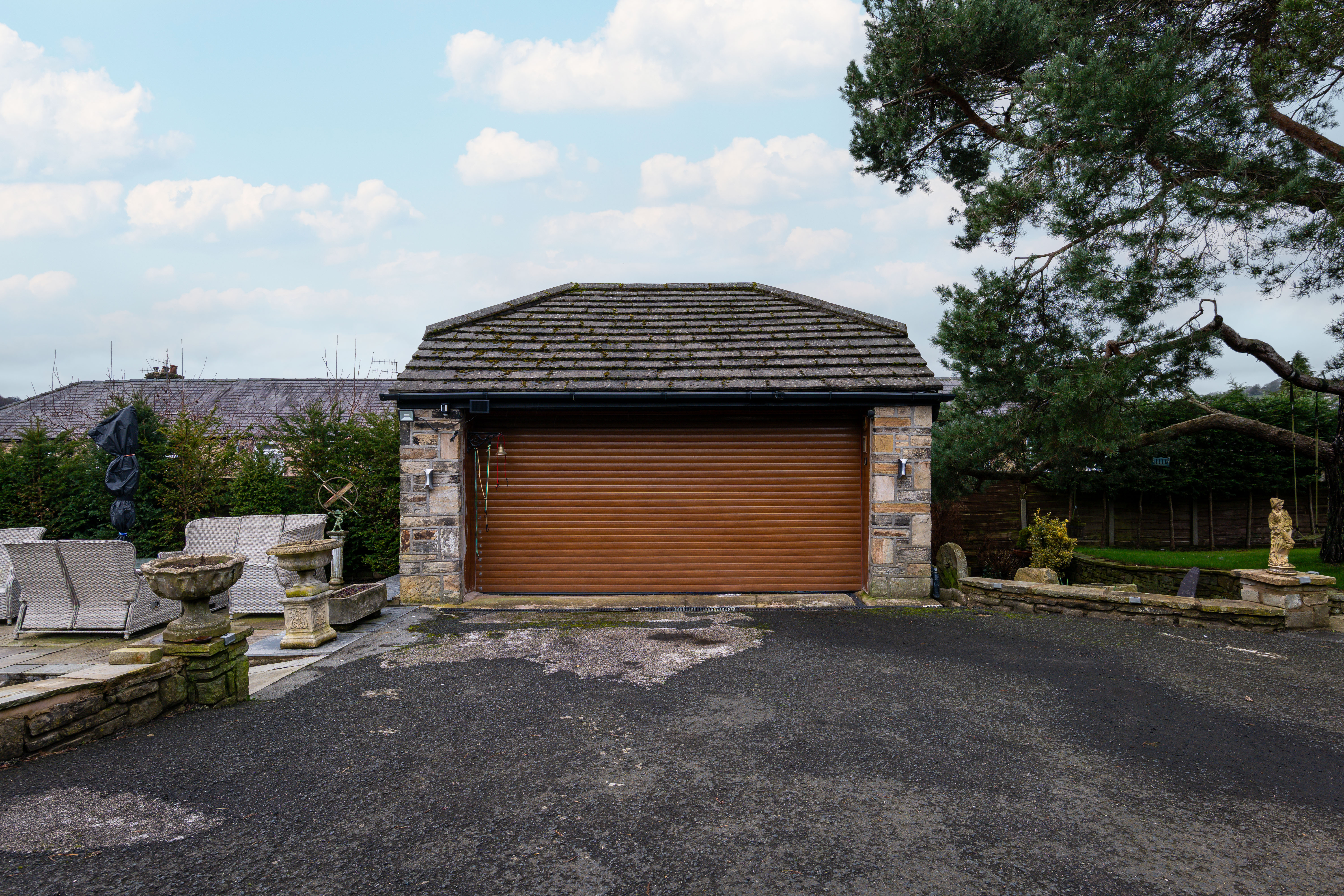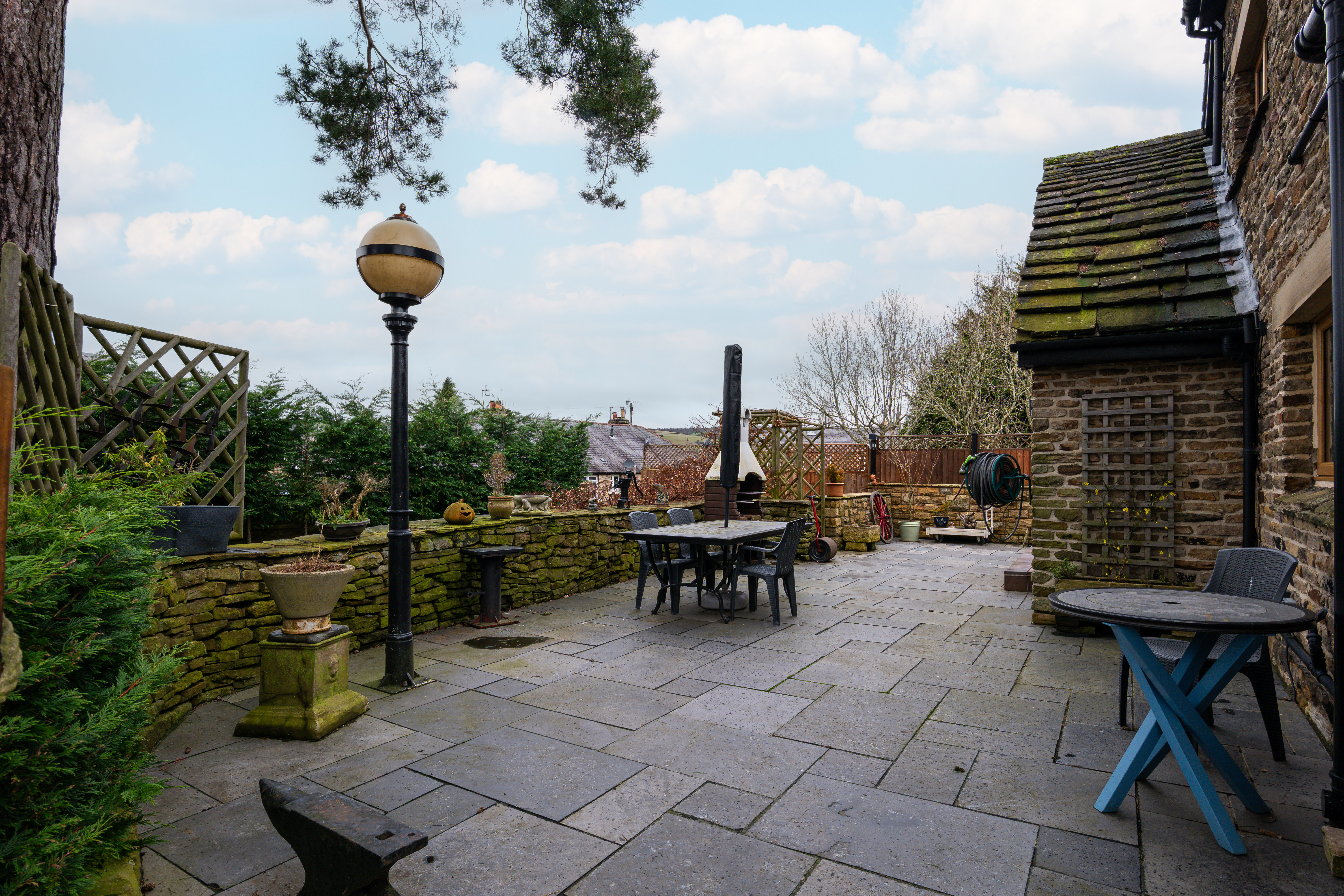 Occupying an impressive third-of-an-acre plot, the property provides outstanding outdoor space and versatility. Accessed via a remote-controlled electric gate, the home opens onto a substantial driveway with parking for at least three vehicles. The beautifully landscaped gardens feature a tiled patio ideal for outdoor dining, a substantial stone-built barbecue complete with pizza oven, and a half-brick, half-glass greenhouse with automatic opening windows — a fantastic addition for gardening enthusiasts.
