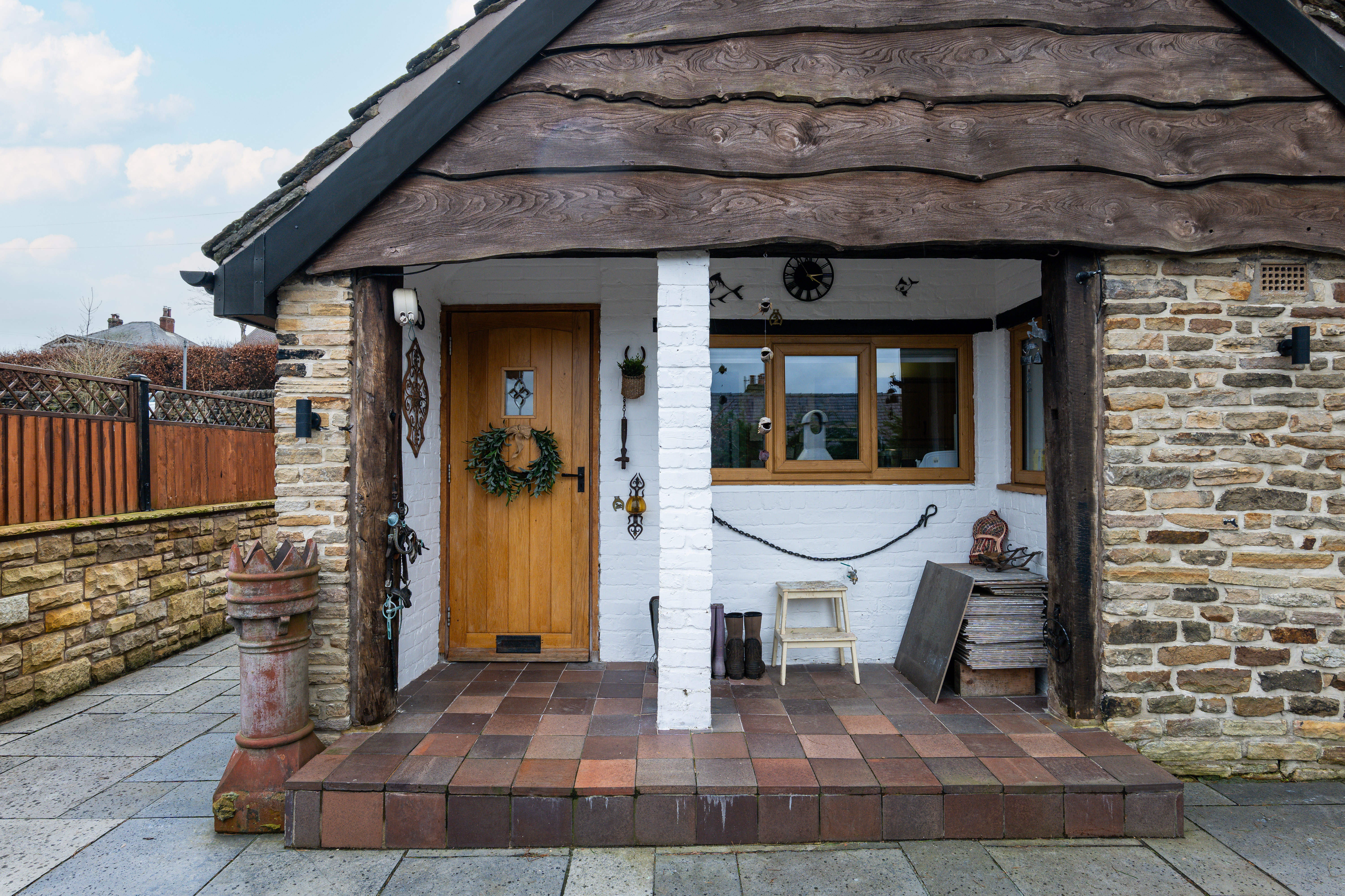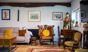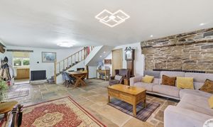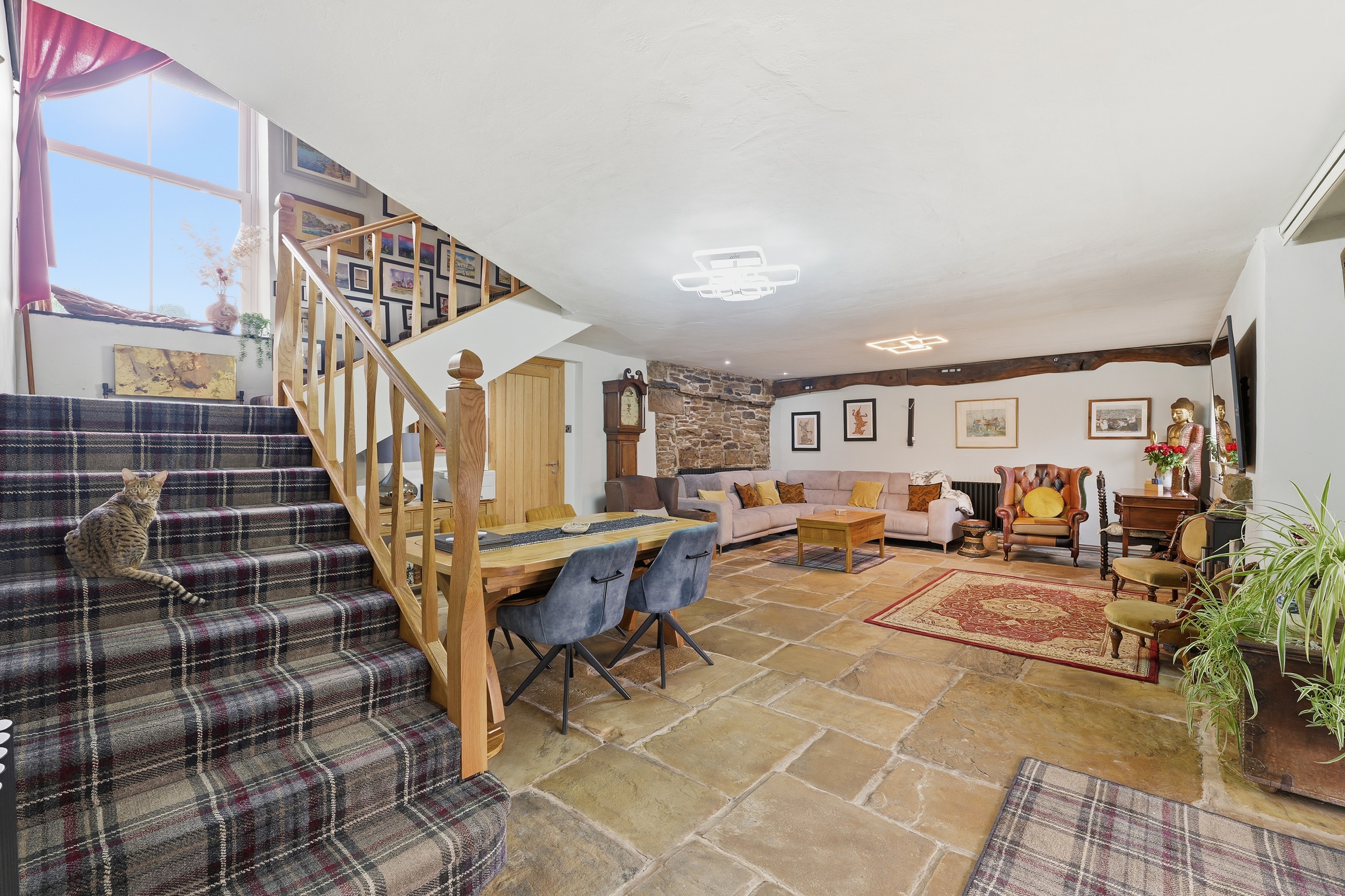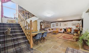 Spacious reception area featuring original Yorkshire stone floor and arched uPVC oak‑effect front doors with glass side panels. A window to the front elevation and under‑stairs cupboard add practicality, while an electric log burner, four radiators, and electric thermostat ensure year‑round comfort. Additional features include a built‑in electric drinks fridge, oak doors leading to the kitchen and utility room, and an open staircase rising to the first floor. Character is enhanced by oak beams, an exposed stone wall, spotlights, two feature lights, and USB sockets.