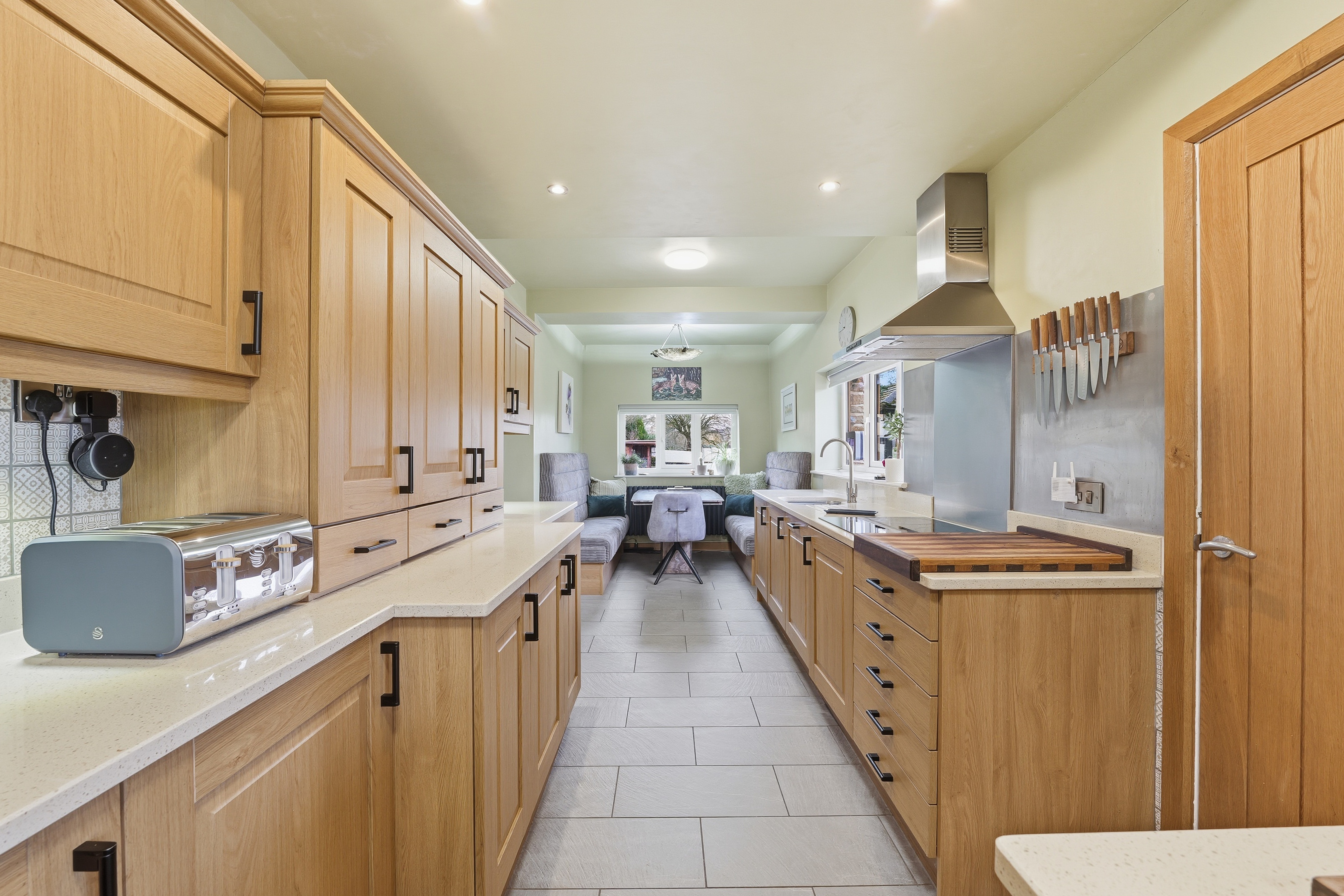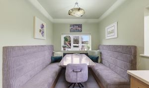The kitchen offers booth seating and a fitted suite featuring soft‑close oak‑veneer cabinetry with black handles and marble worktops. Appliances include an integrated dishwasher, electric hob with extractor fan, electric oven with hide‑and‑slide doors, and a freestanding American‑style fridge‑freezer. Additional features include tiled flooring, two grey radiators, spotlighting, a pendant light above the dining area, and cupboard top lighting. Access is provided via oak doors to the main lounge, pantry, and downstairs WC. Three windows to the front and side elevation the property, all fitted with electric blinds.