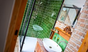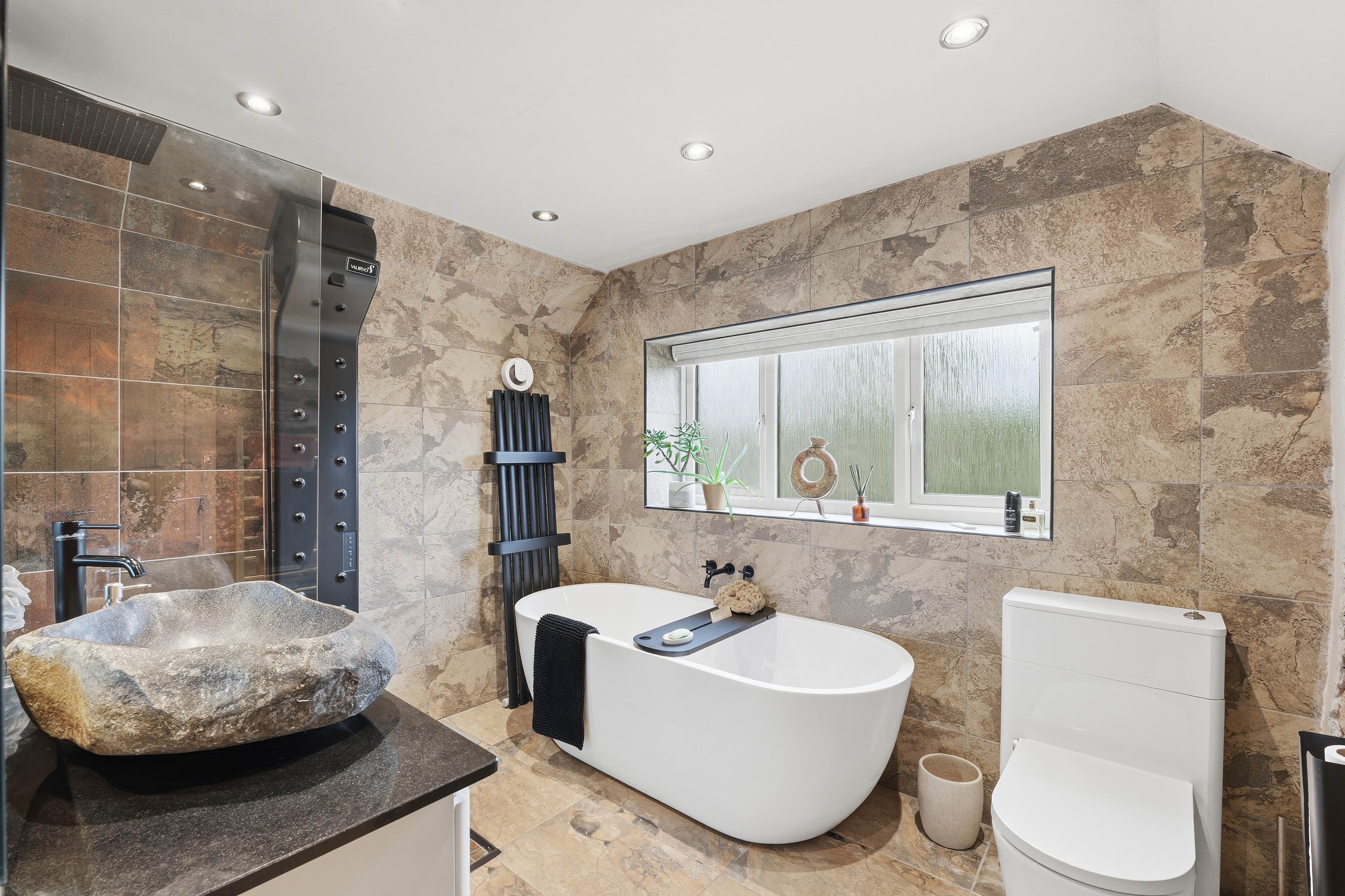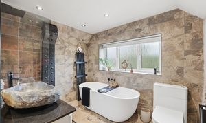 The bathroom features a large, free-standing bath, a walk-in shower, a Japanese toilet with integrated functions and a vanity unit with a marble worktop and Italian stone basin. Additional highlights include underfloor heating, a brushed‑brass towel radiator and a body dryer. The bathroom also benefits from an extractor fan, a rear‑facing window with electric blinds, and an attractive exposed stone wall.