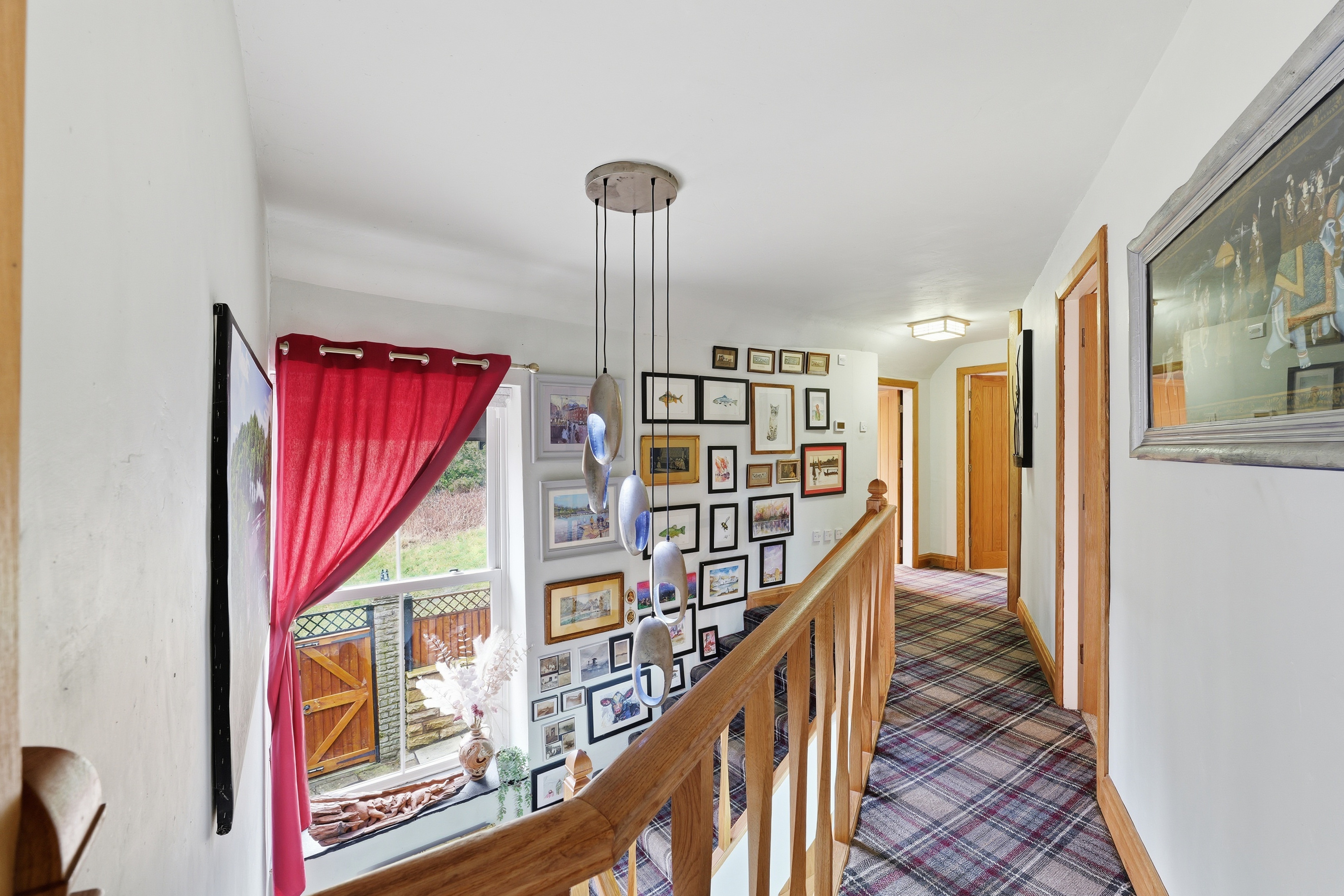 Open aspect landing with oak banister, carpeted floor and a designer pendant light. Access to all bedrooms and a bathroom, large sash window to the rear elevation, radiator.