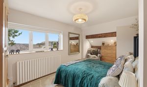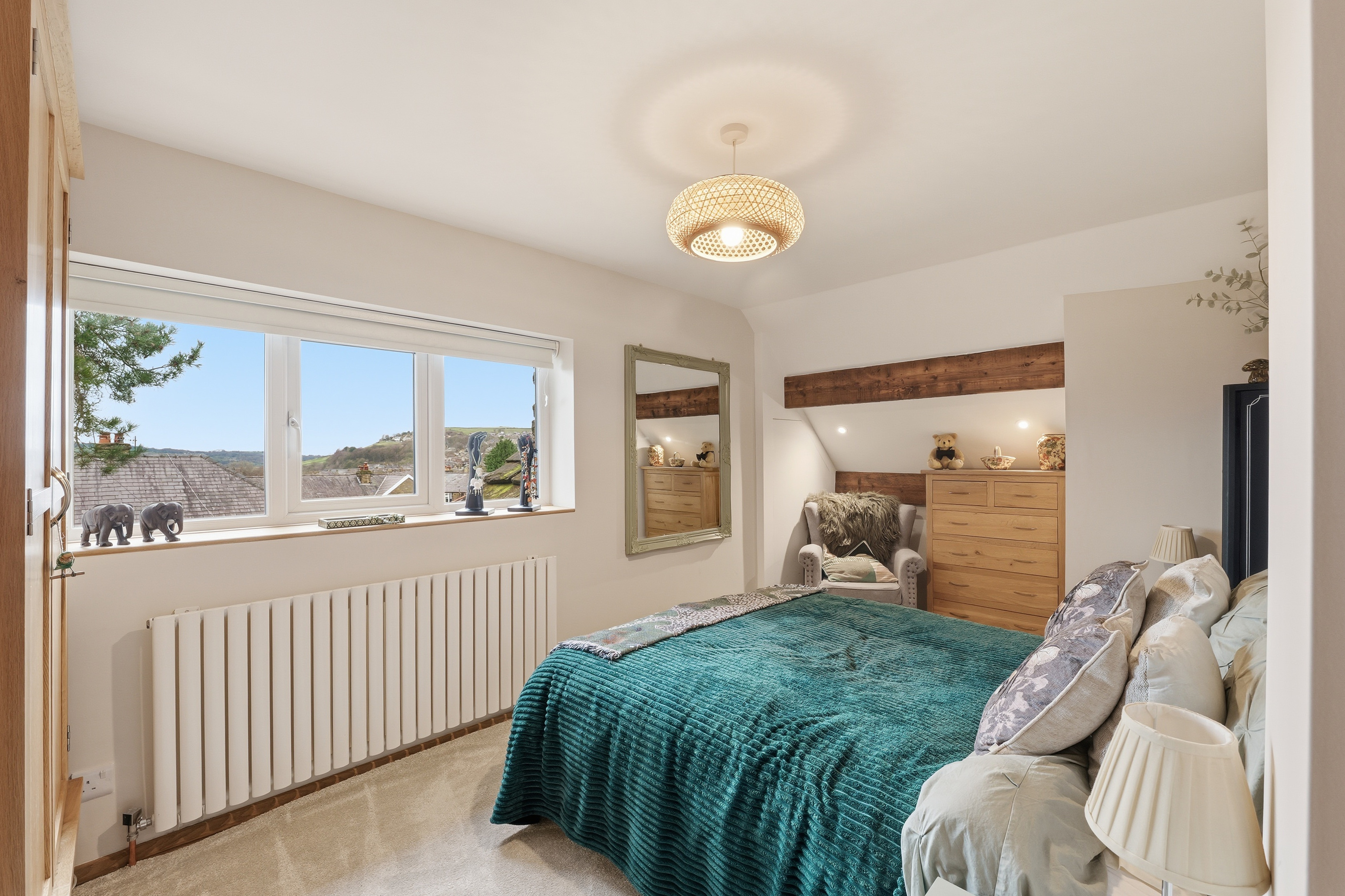 Spacious double bedroom with new carpets, eaves storage cupboard, pendant light, window to the front elevation with electric blinds, radiator and views over New Mills town.