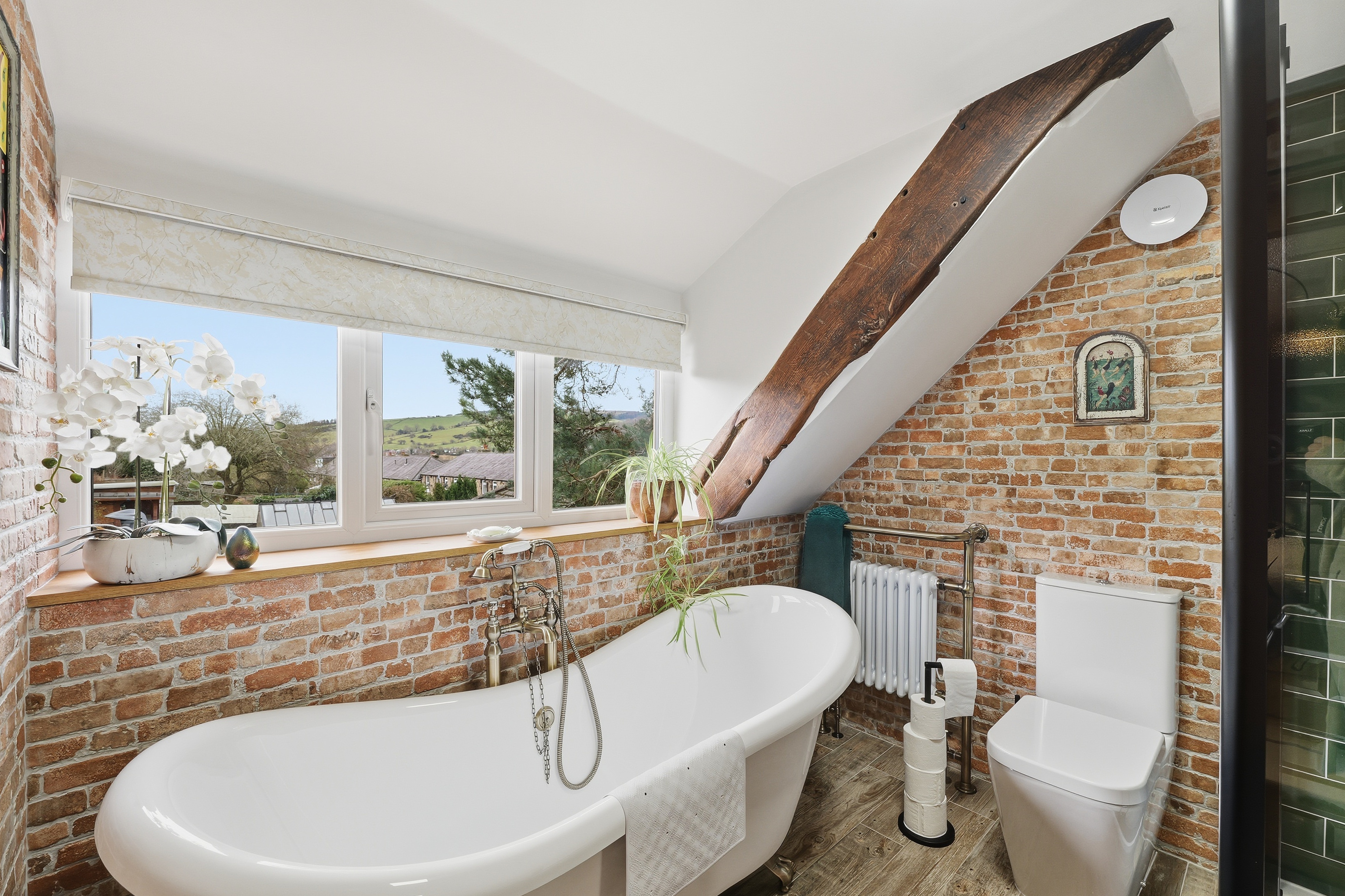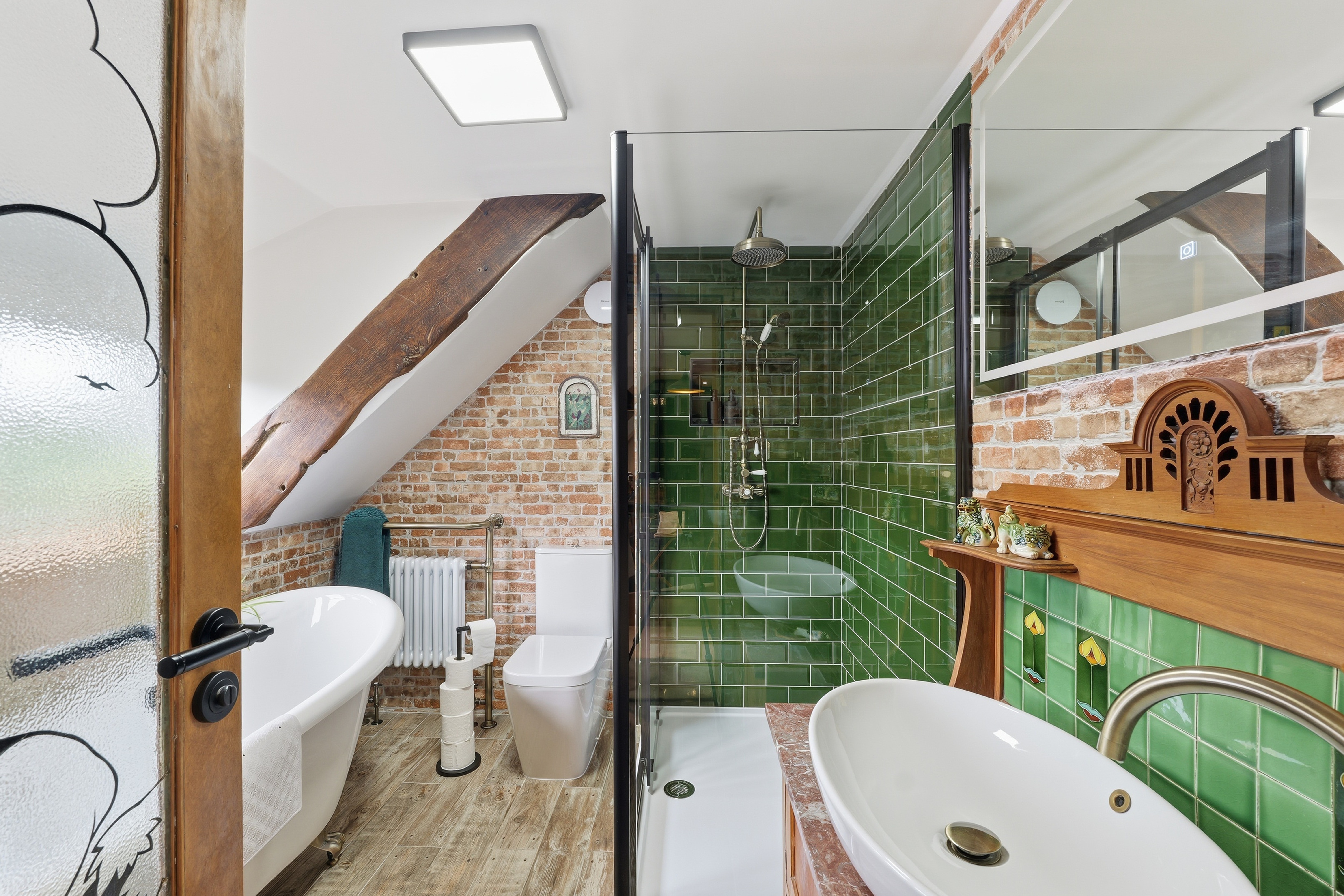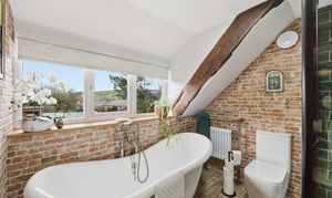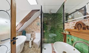 Large and stylish en-suite bathroom features a large shower with brass overhead fitting, shower tray, and glass surround sits alongside a freestanding roll‑top bath, an electric media mirror and an Edwardian washstand with original tiles, ceramic basin, and an antique brushed‑brass tap. Additional highlights include underfloor heating, a radiator with towel rail, a window to the front elevation with electric blinds, and an exposed wooden beam.