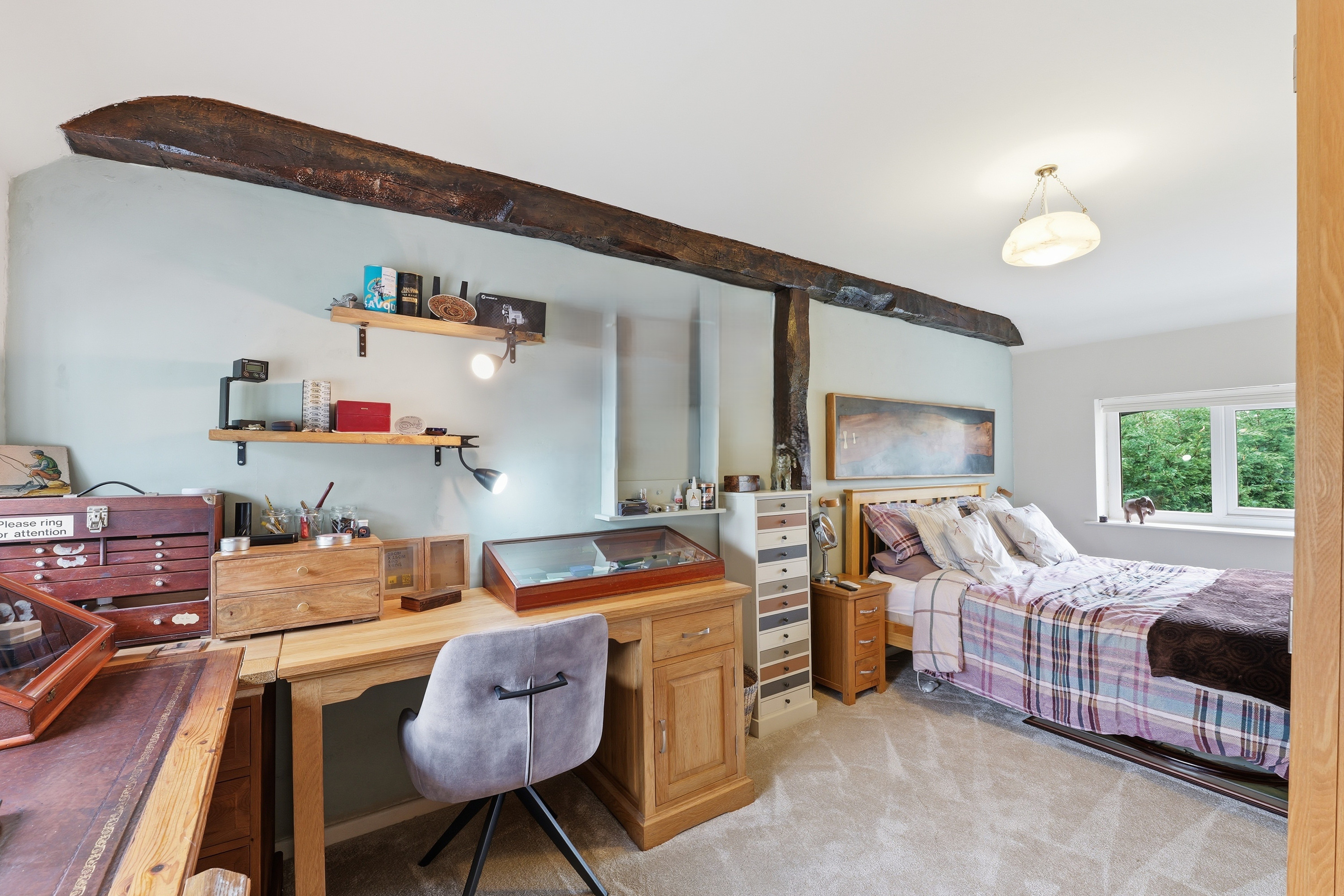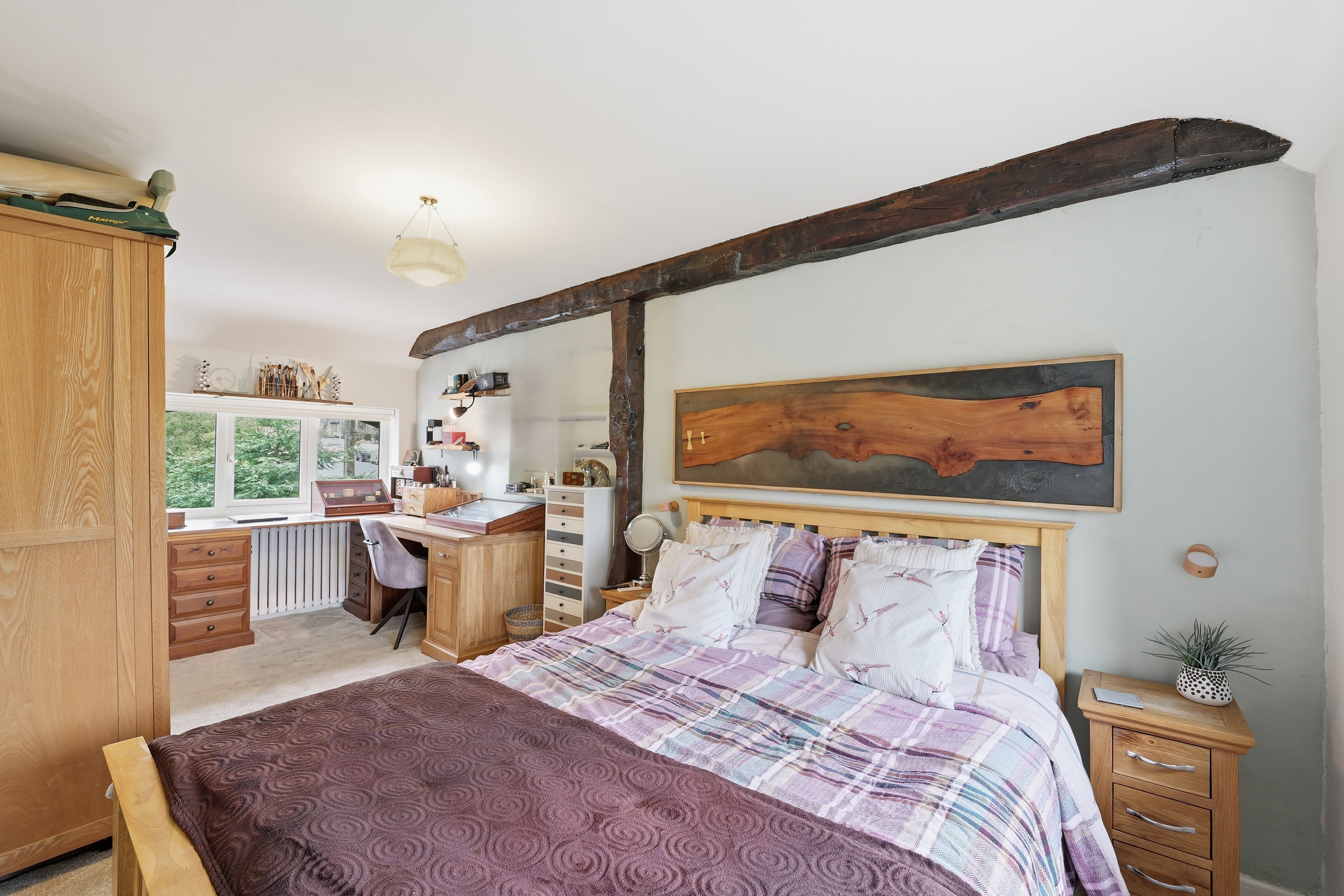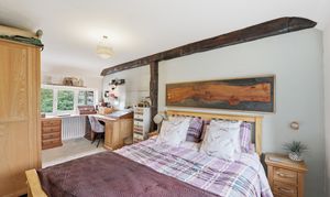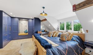 Large double bedroom with custom made fitted wardrobes in French navy colour and brushed gold fittings. Exposed original wooden beams. Window to the front elevation, overlooking surrounding countryside. A glass door with an original 1960s design leads through to the en‑suite bathroom.