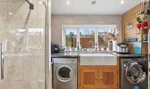 Spacious utility room featuring a Belfast sink with marble worktop, Yorkshire plumbing for heated towels and space for both a washing machine and dryer. There is a shower cubicle with an overhead shower, a fitted metal safe, and original floor tiles. Additional features include spotlighting, an extractor fan, and a a window to the rear elevation.