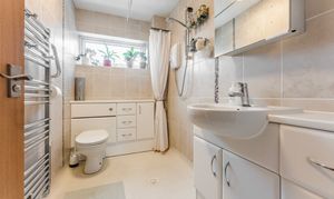 Accommodation comprises three well-proportioned bedrooms, offering comfort and privacy, with one benefitting from a range of built-in wardrobes and storage cupboards. The modern wet room is thoughtfully designed, featuring a basin vanity, toilet, and ample built-in storage.