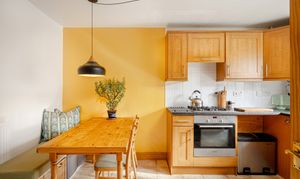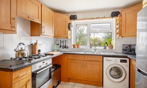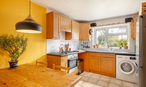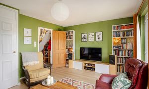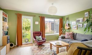 The ground floor is arranged around a welcoming entrance hall with patterned tiled flooring and useful understairs storage space. To the front, a well-appointed kitchen/dining room features shaker-style cabinetry, generous counter space and a sociable dining area, ideal for family meals. At the rear, the living room is filled with natural light and offers a relaxing space with garden views, direct access to the patio and lawn.