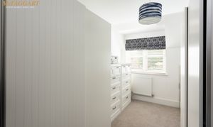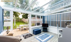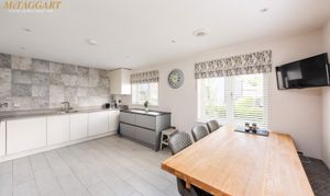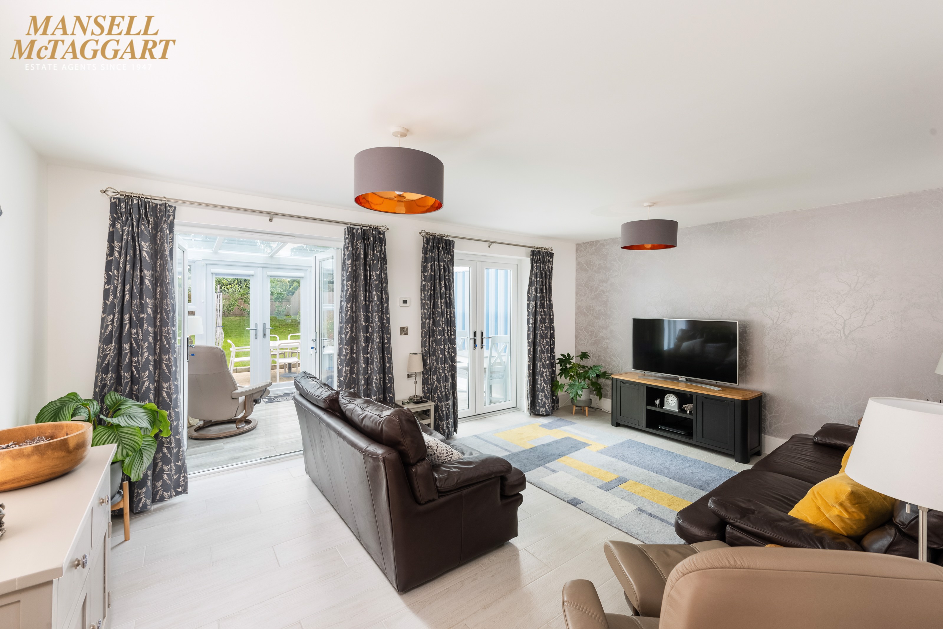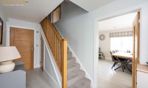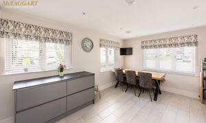 The kitchen/dining room is a bright double aspect room with high gloss, two tone, range of units at both eye and base level under Silestone wortops and upstands. Quality Bosch appliances include, single hot-air oven, microwave combi oven, induction five ring hob with concealed filter over, integrated fridge freezer, dishwasher and washer dryer. The living room is also double aspect and has two sets of double doors opening into the newly constructed conservatory. The conservatory is of part brick and uPVC double glazed construction under a glass roof with a further set of double doors out to the rear gardens.