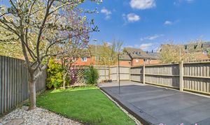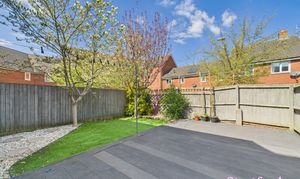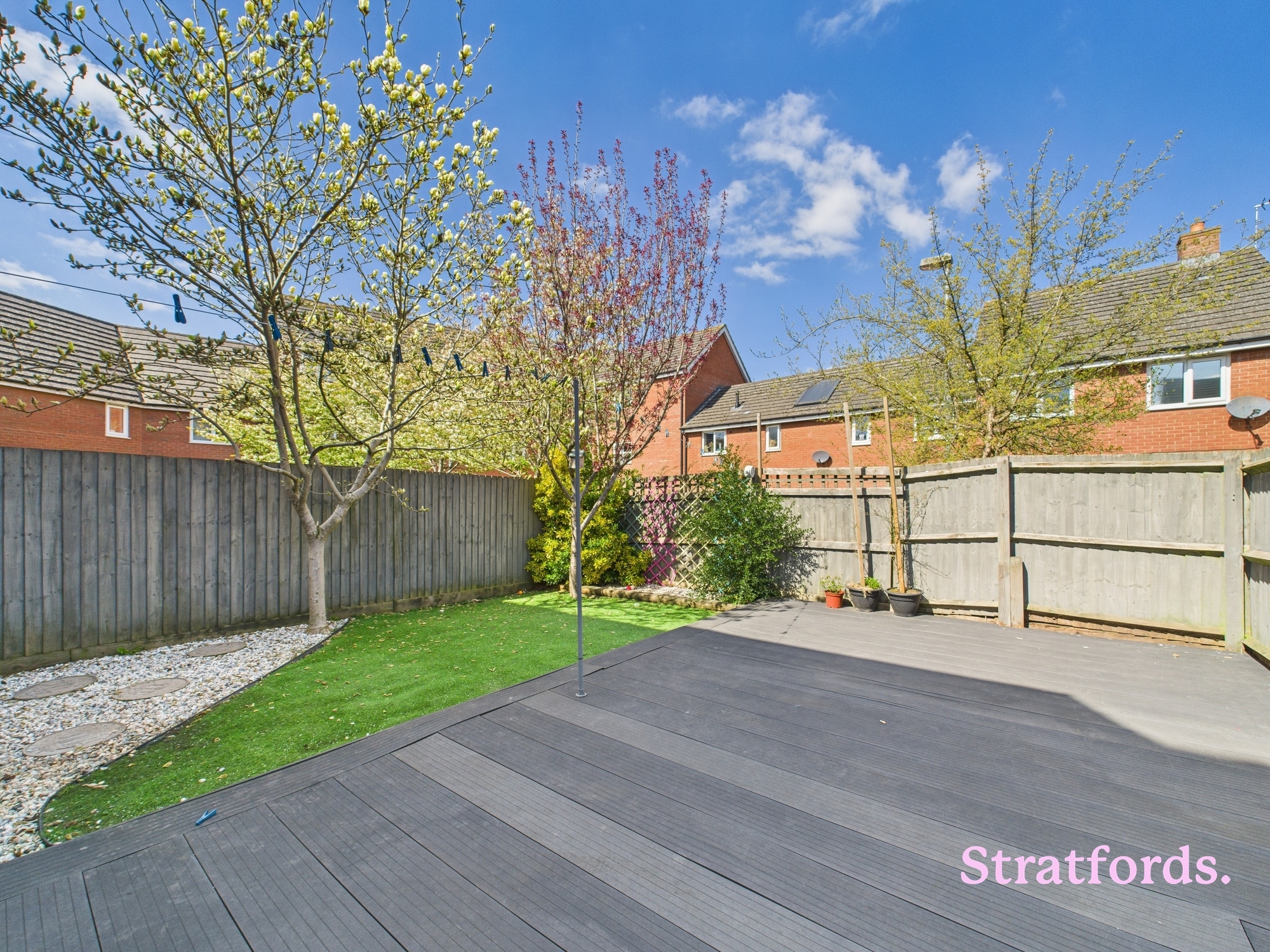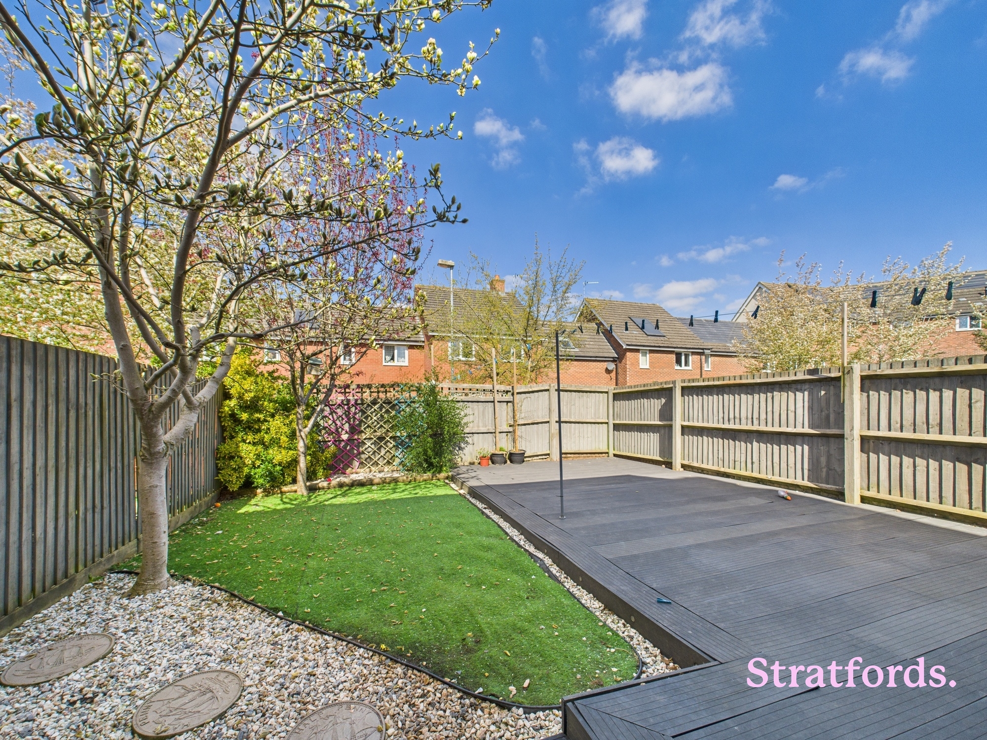 The rear garden has been landscaped for low maintenance, combining artificial lawn with decorative stonework and a large decked seating area—perfect for outdoor dining or entertaining. A selection of established trees provides seasonal greenery and added privacy.