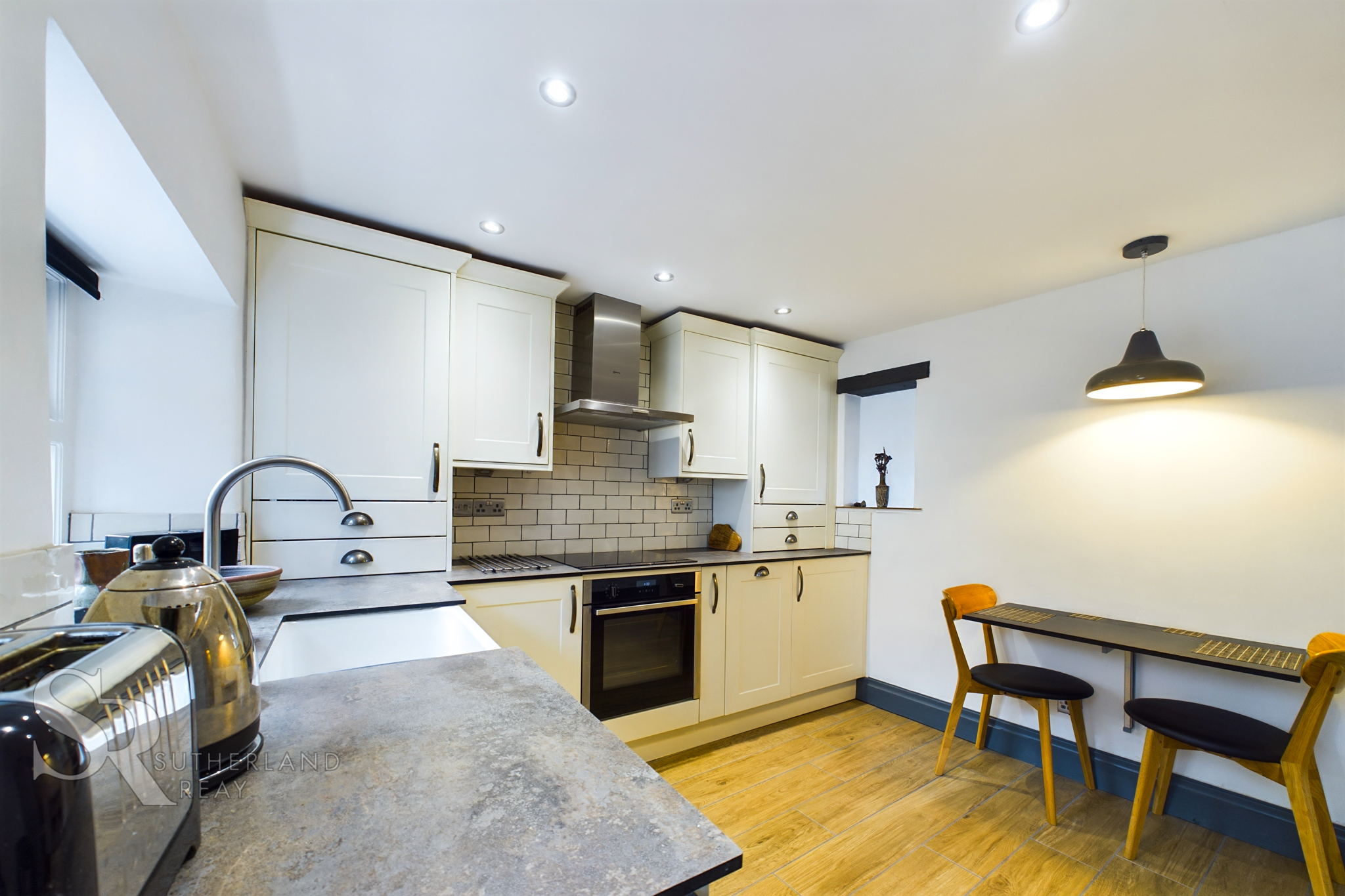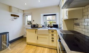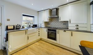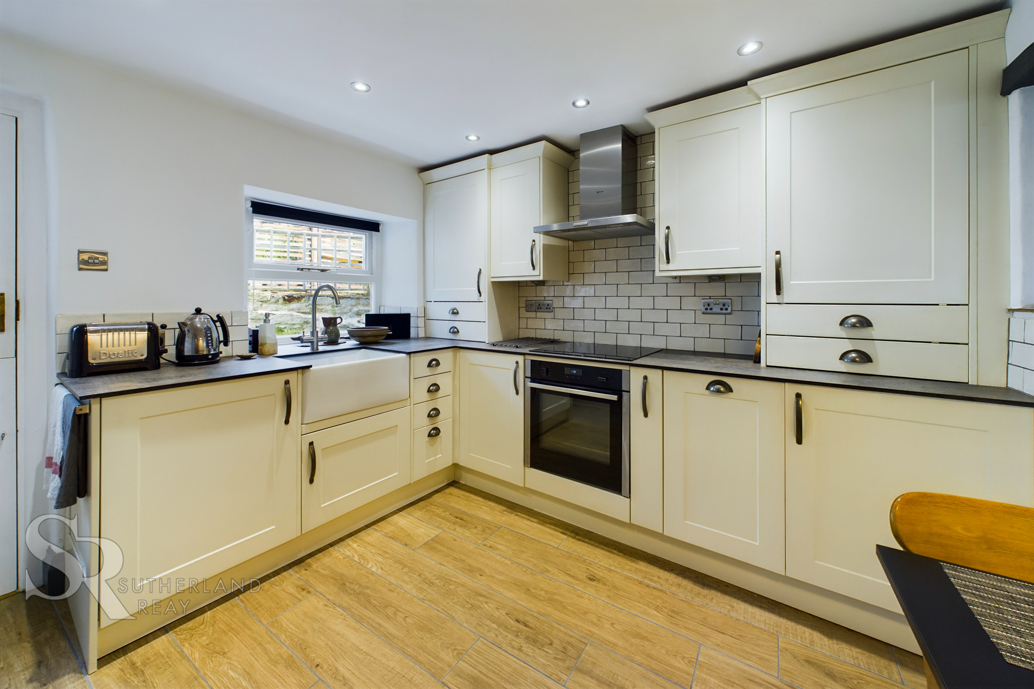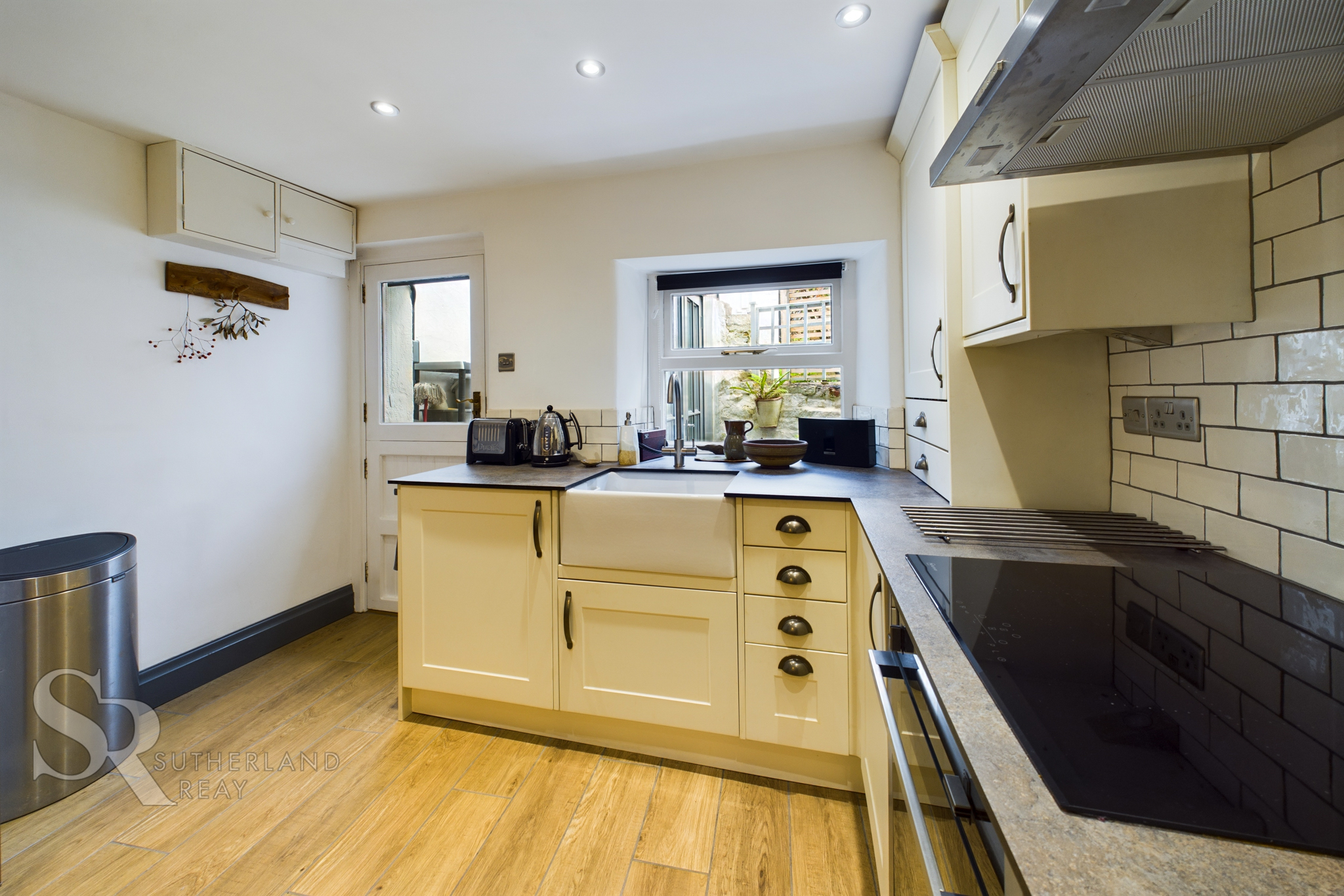 Timber double glazed window to the rear elevation, a contemporary cream Shaker style kitchen with Silstone quality work surfaces, Belfast sink with mixer tap over, single Neff oven, extractor and Induction hob, tiled floor, white column radiator, integrated dishwasher and washing machine, timber stable door to rear elevation, ceiling recess lights and pendant light over dining area, feature tiled splashback.