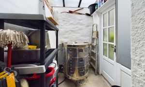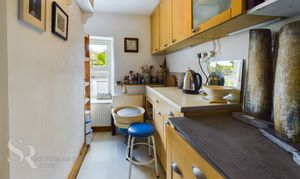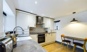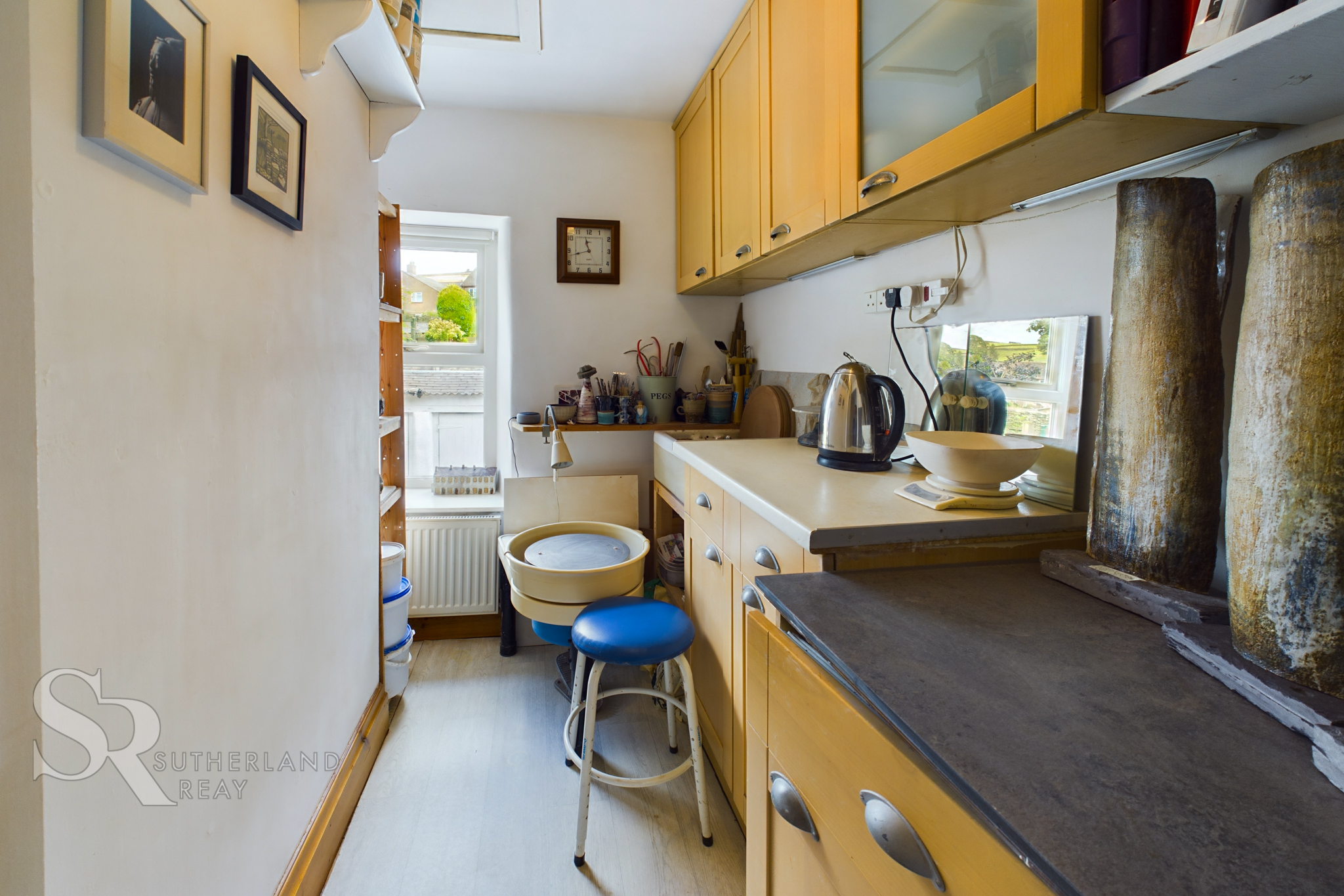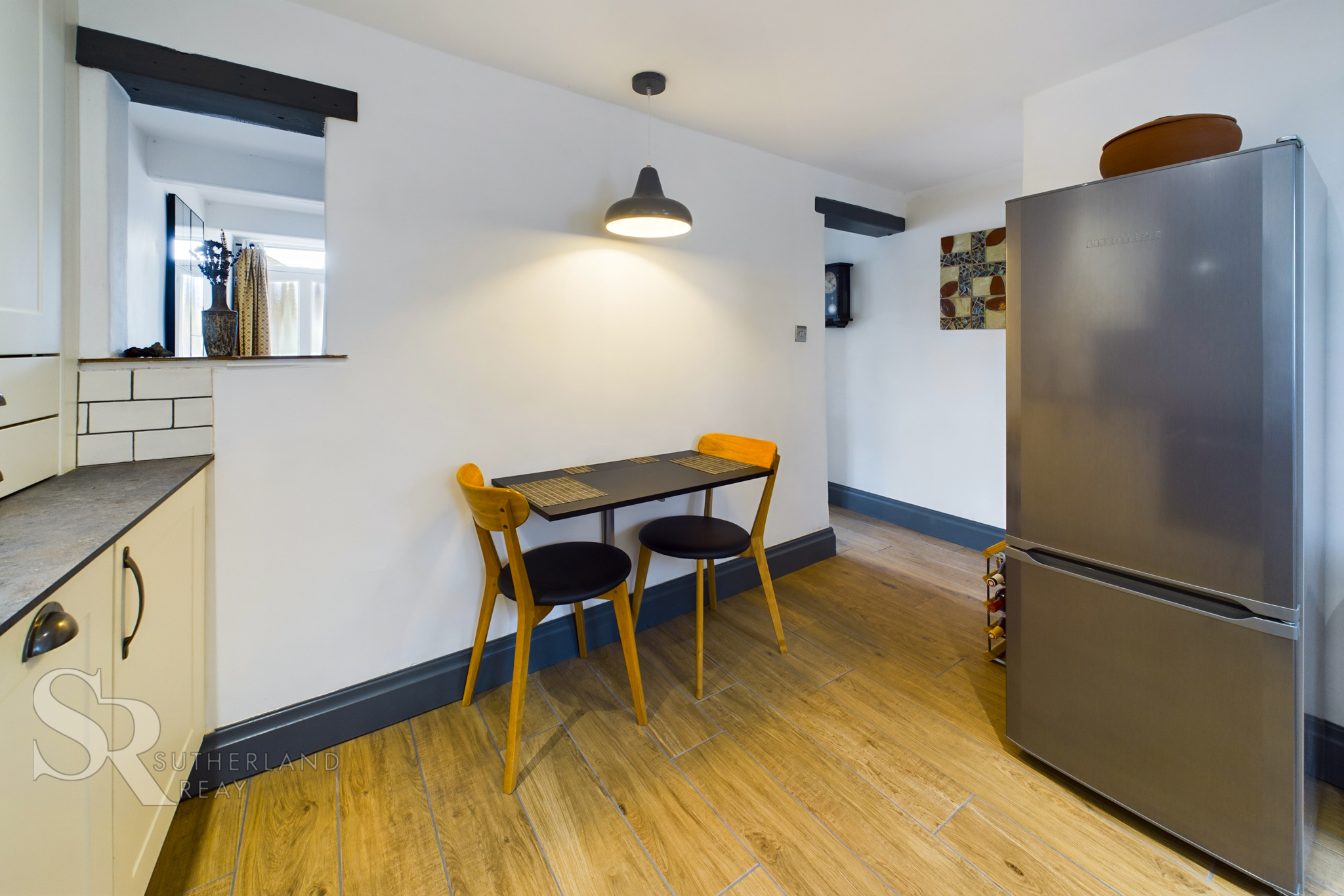 Timber double glazed window to the rear elevation, a contemporary cream Shaker style kitchen with Silstone quality work surfaces, Belfast sink with mixer tap over, single Neff oven, extractor and Induction hob, tiled floor, white column radiator, integrated dishwasher and washing machine, timber stable door to rear elevation, ceiling recess lights and pendant light over dining area, feature tiled splashback.