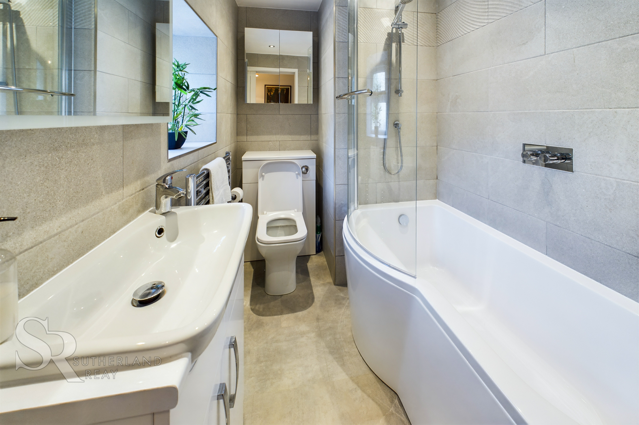 Double glazed timber window with privacy glass to the rear elevation, fully tiled walls, a contemporary modern bathroom suite comprising, vanity wash basin with contemporary chrome mixer tap over, P shaped bath and shower with chrome fittings, and clear screen, low level push flush WC, heated mirror with shaver socket and LED light, heated chrome towel rail.