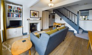 Timber front door with half glazed door with top light, double glazed sash style window to the front elevation, tiled floor, white column radiator, multi fuel wood burner set in a feature style fireplace with stone hearth, tv point, staircase with timber balustrade to first floor, feature opening into kitchen with timber sill.