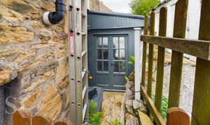 Stable door from kitchen, polycarbonate roof, glazed timber French doors with privacy glass leading to rear.