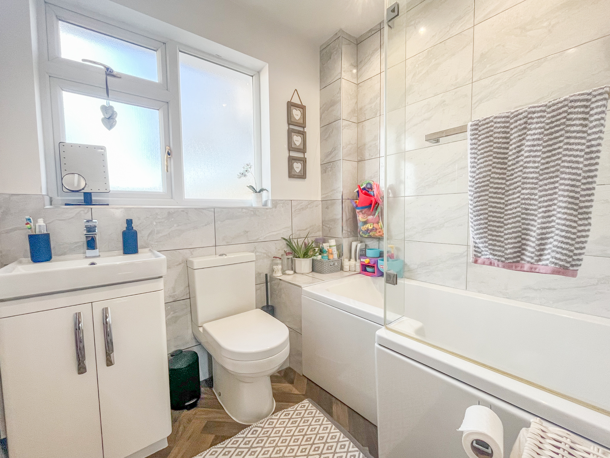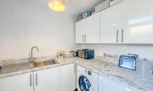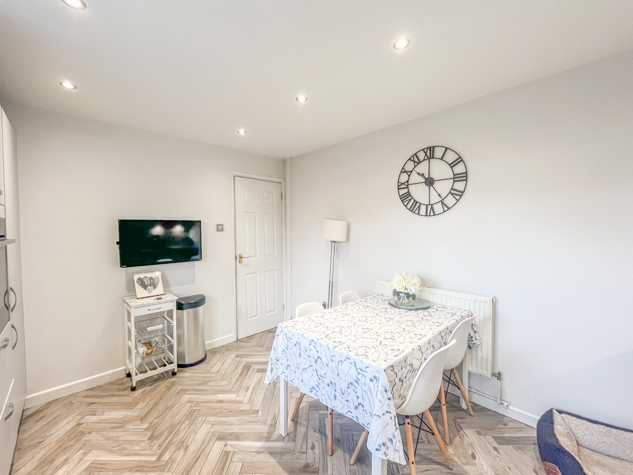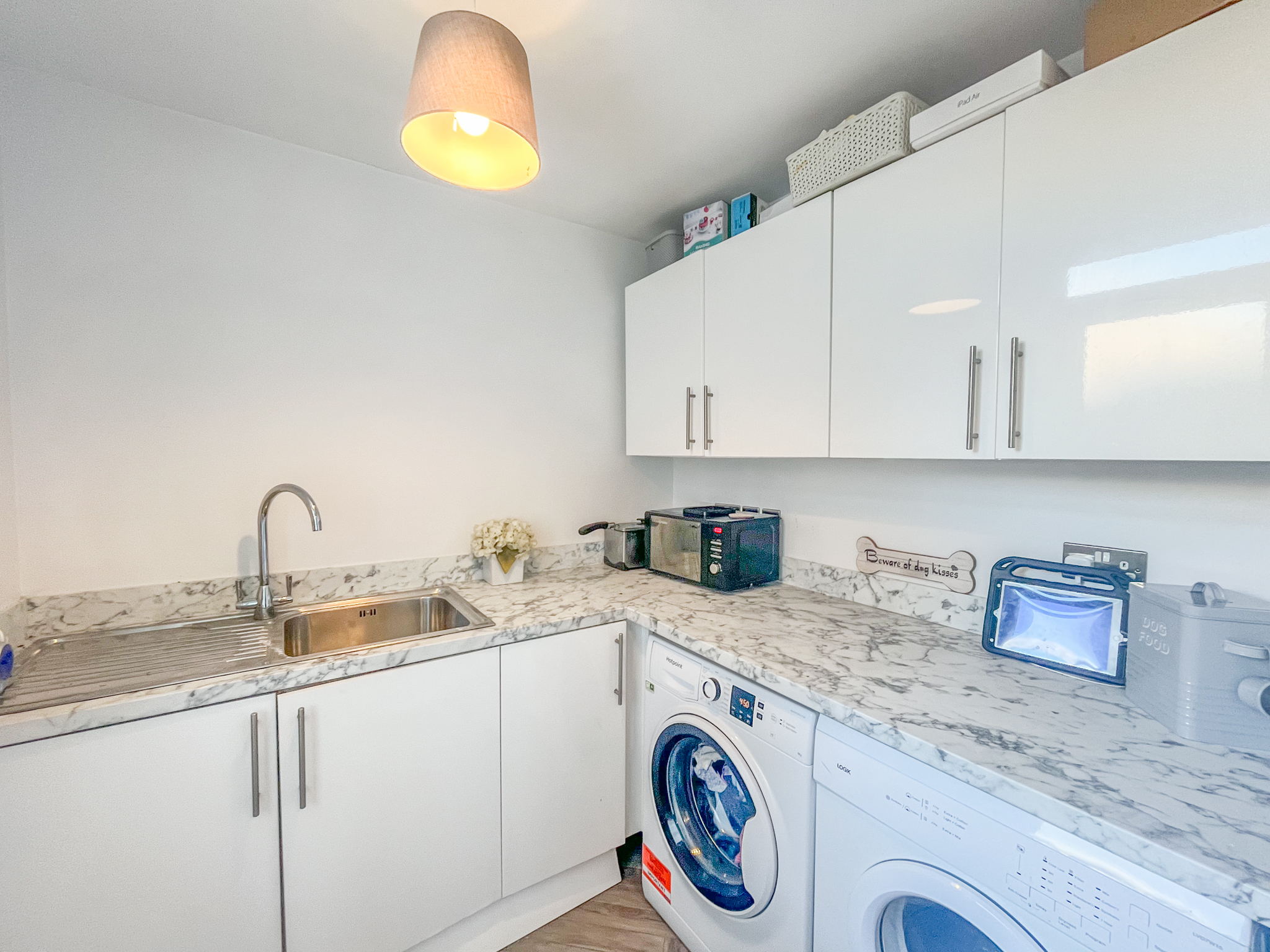 Internally, the ground floor comprises a front-facing living room, leading onto a modern kitchen/diner at the rear. The kitchen is fitted with integrated Neff appliances including an oven, induction hob, dishwasher, fridge/freezer, plus a wine cooler and a contemporary black sink with hot water tap overlooking the garden. Beyond the kitchen, there is a useful utility room with access to the garden and a convenient downstairs cloakroom.