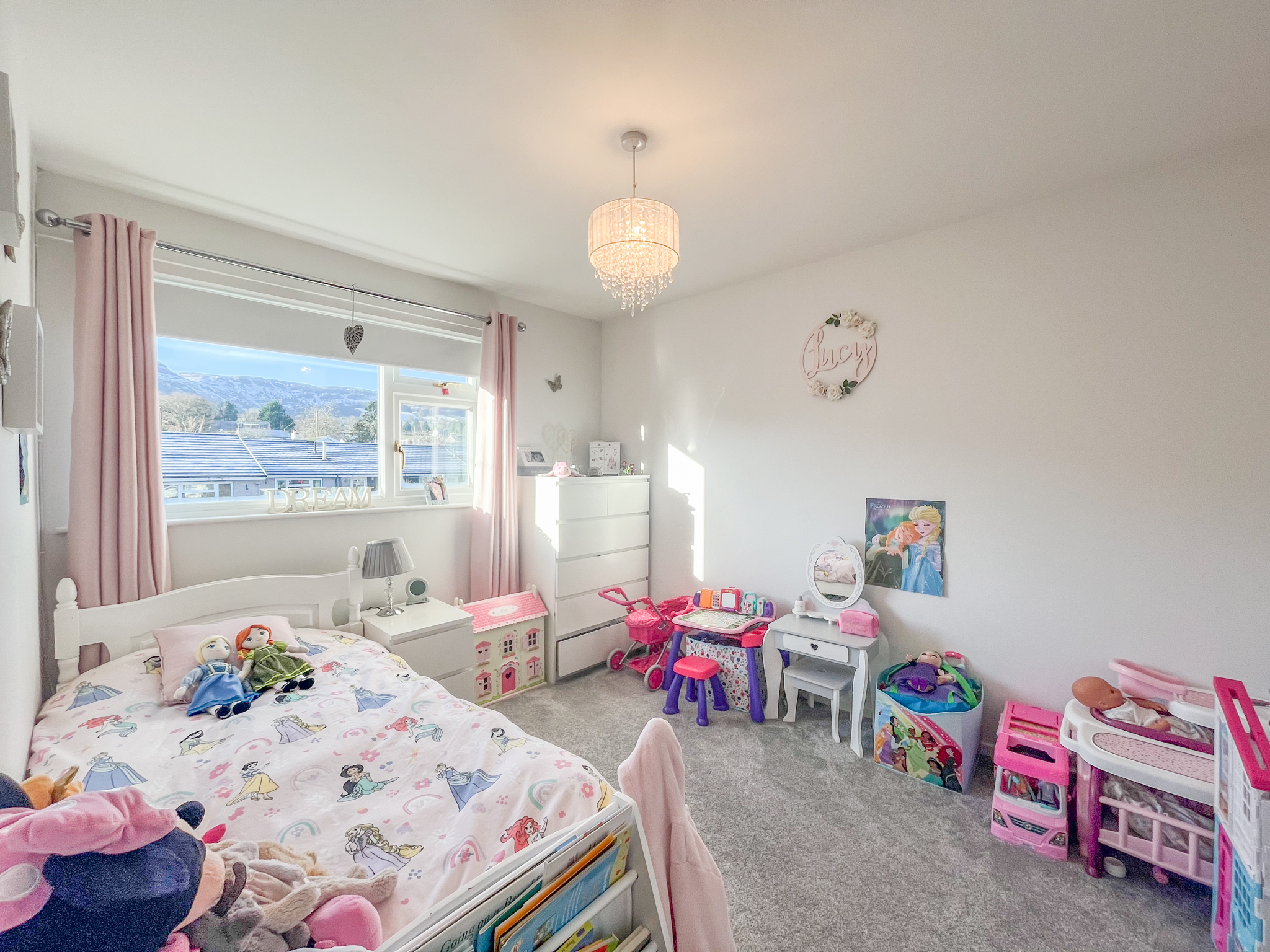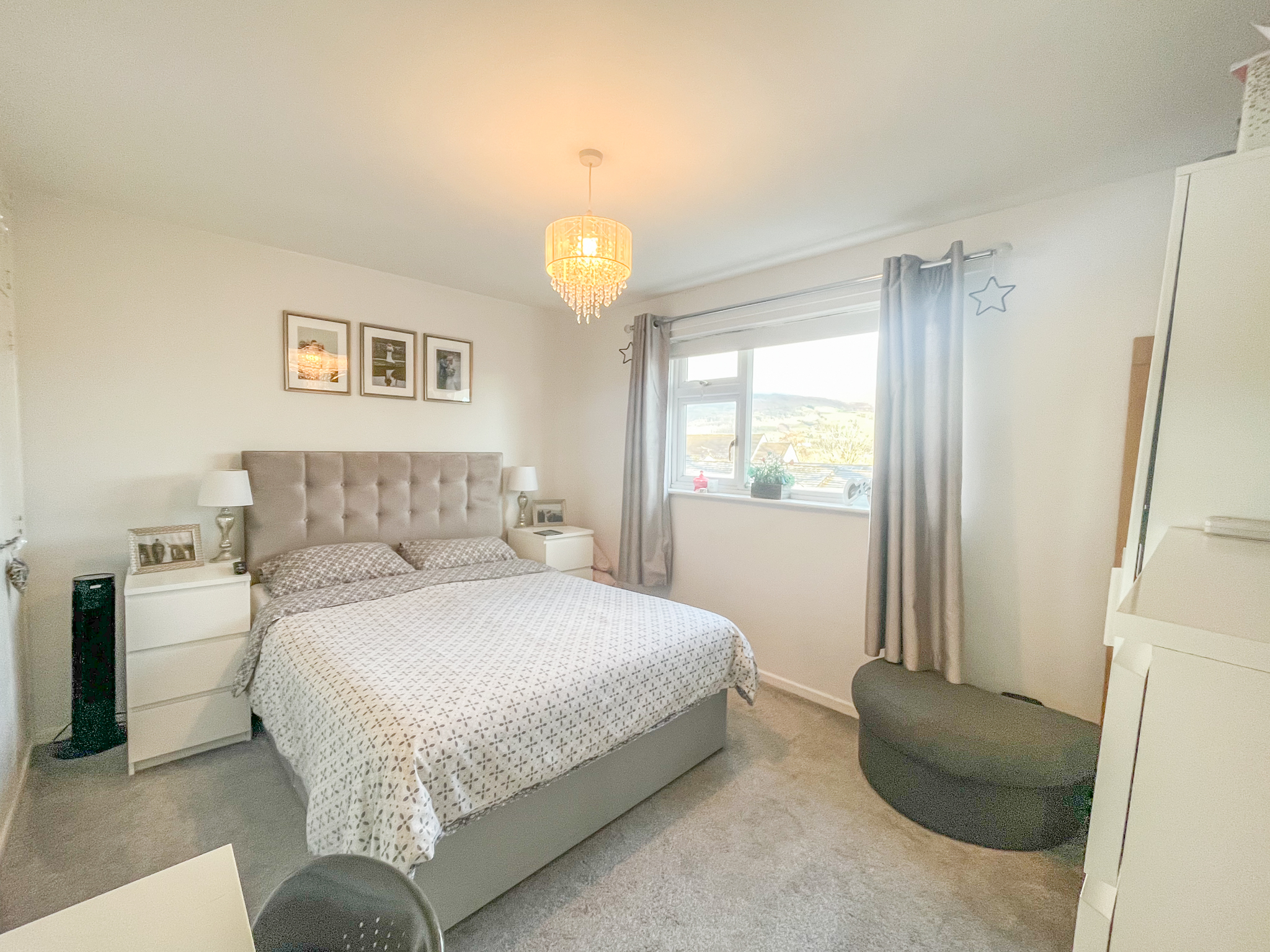 On the first floor, there are three bedrooms, two doubles and a comfortable single, each benefitting from fitted storage to maximise space. The principal bedroom enjoys elevated, far-reaching mountainside views. From the landing, there is a family bathroom with a large bath and overhead shower.